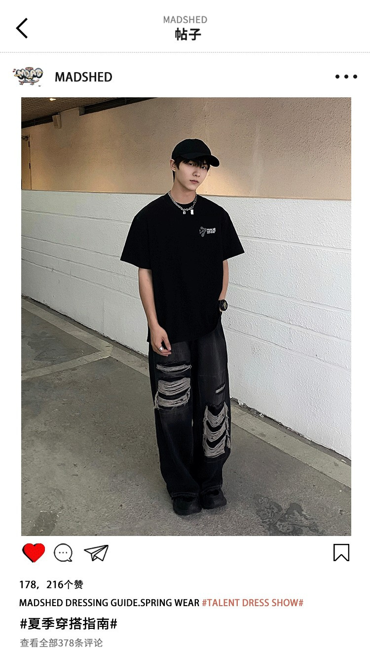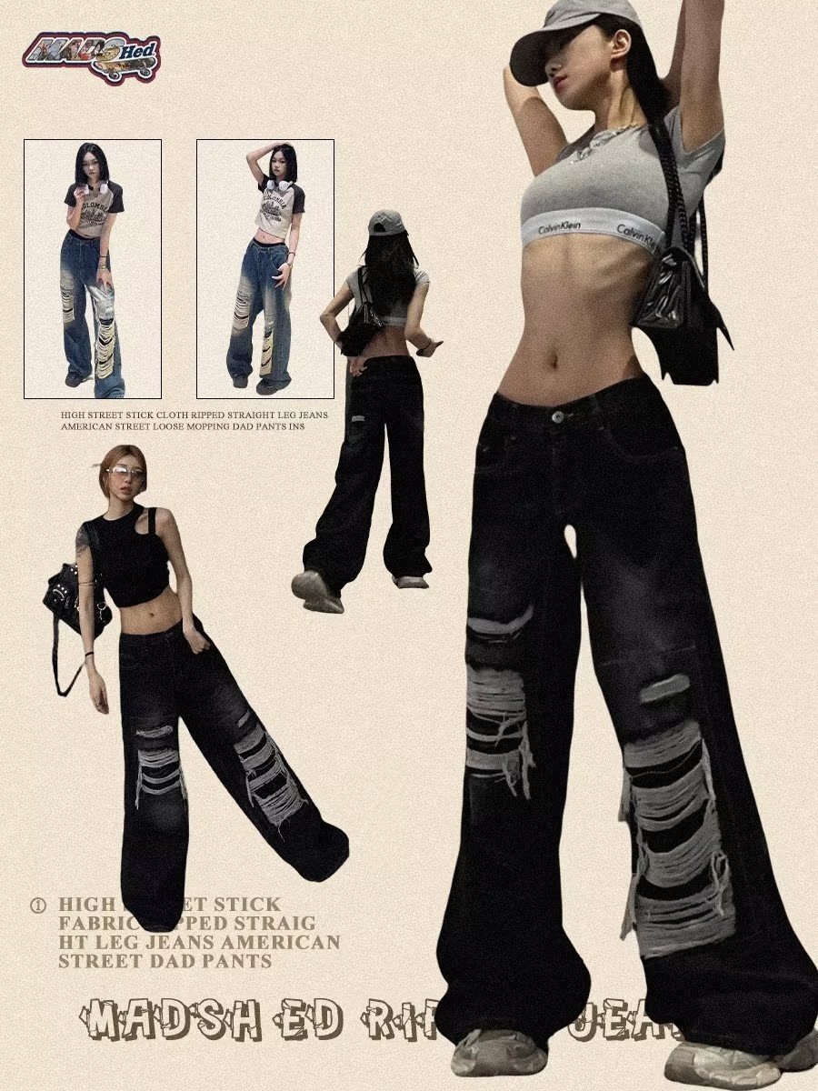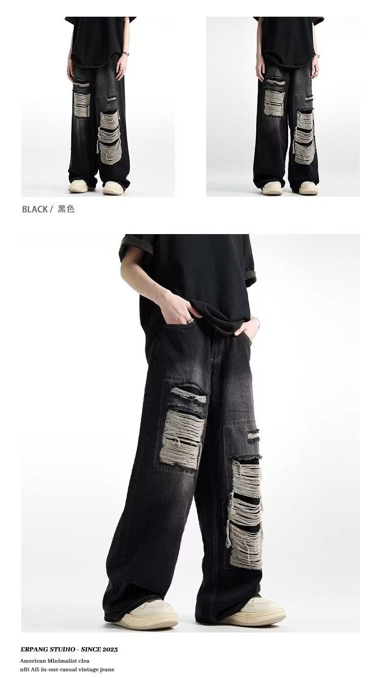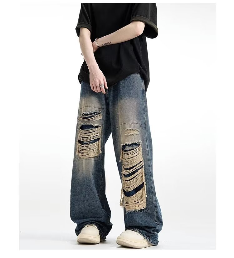 아메리칸 스타일 레트로 찢어진 청바지 남자의 여름 씻어 올드 느슨한 와이드 다리 스트레이트 튜브 트렌디 브랜드 하이 스트리트 팬츠스토어 가기