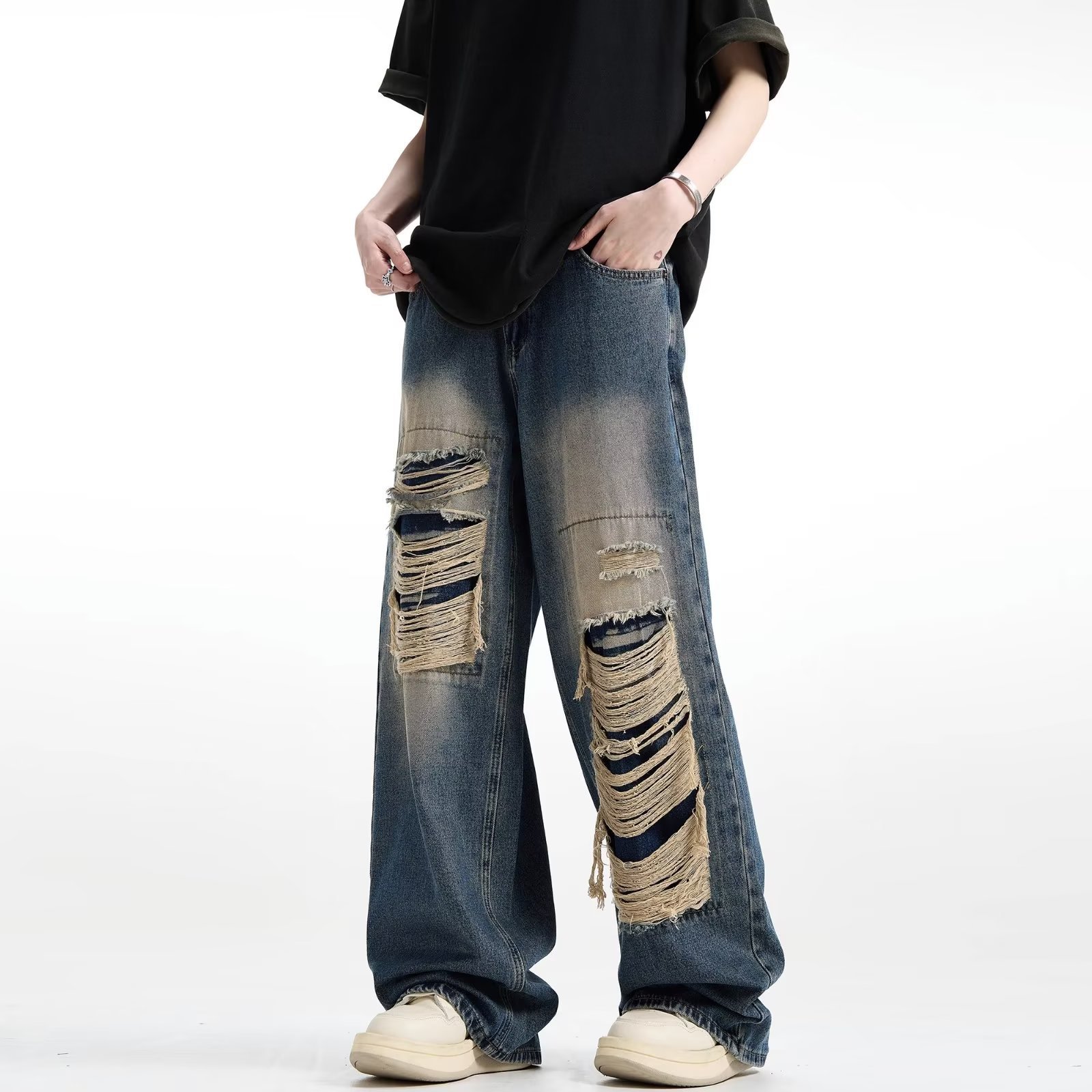 아메리칸 스타일 레트로 찢어진 청바지 남자의 여름 씻어 올드 느슨한 와이드 다리 스트레이트 튜브 트렌디 브랜드 하이 스트리트 팬츠
