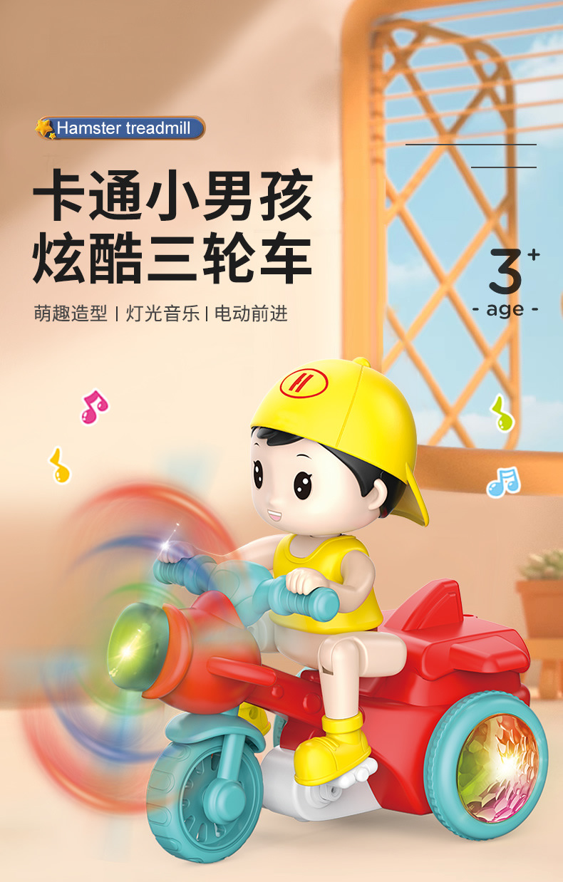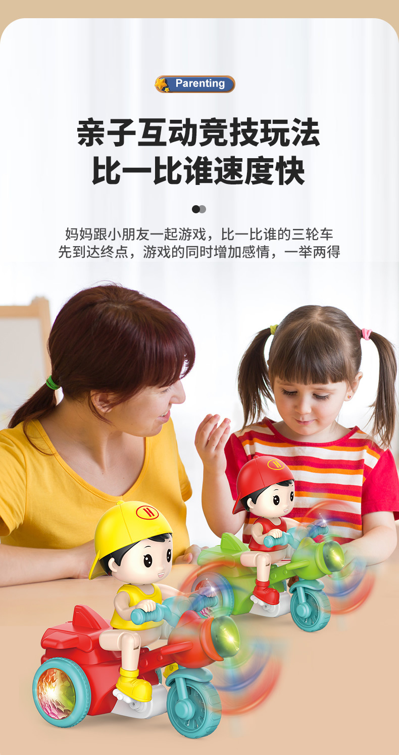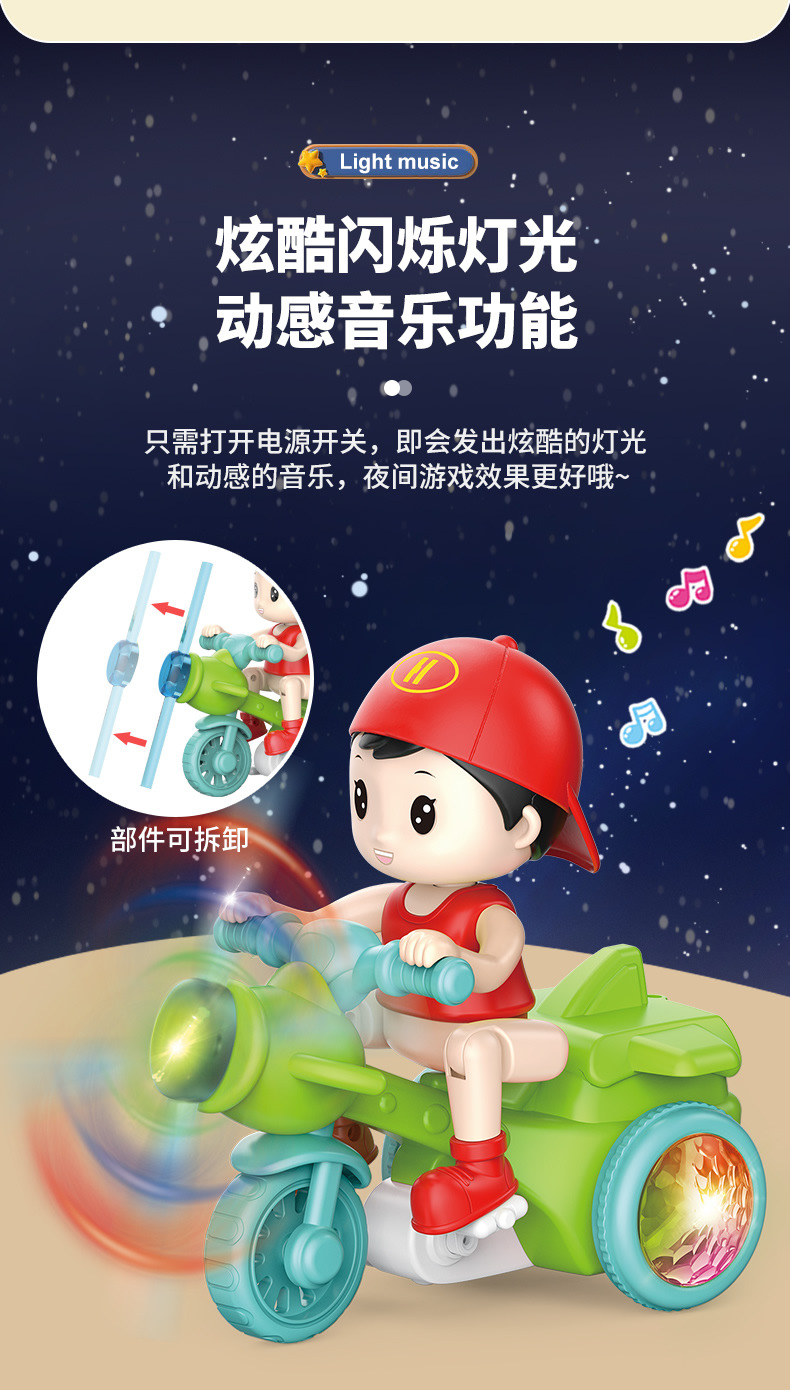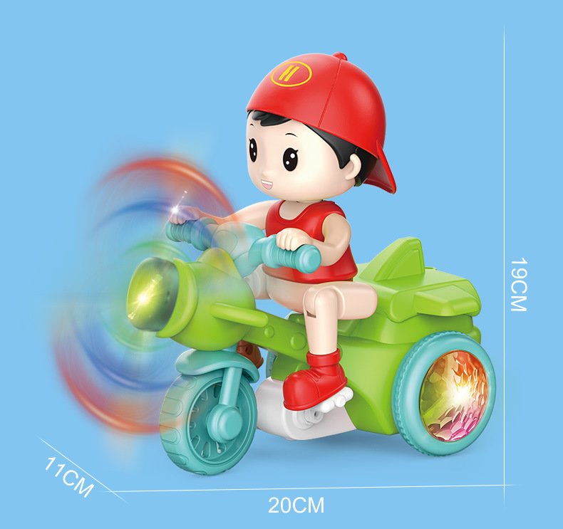 크로스 보더 어린이 전기 스턴트 세발 자전거 장난감 회전 조명 음악 귀여운 재미 오토바이 장난감 도매 포장 마차스토어 가기
