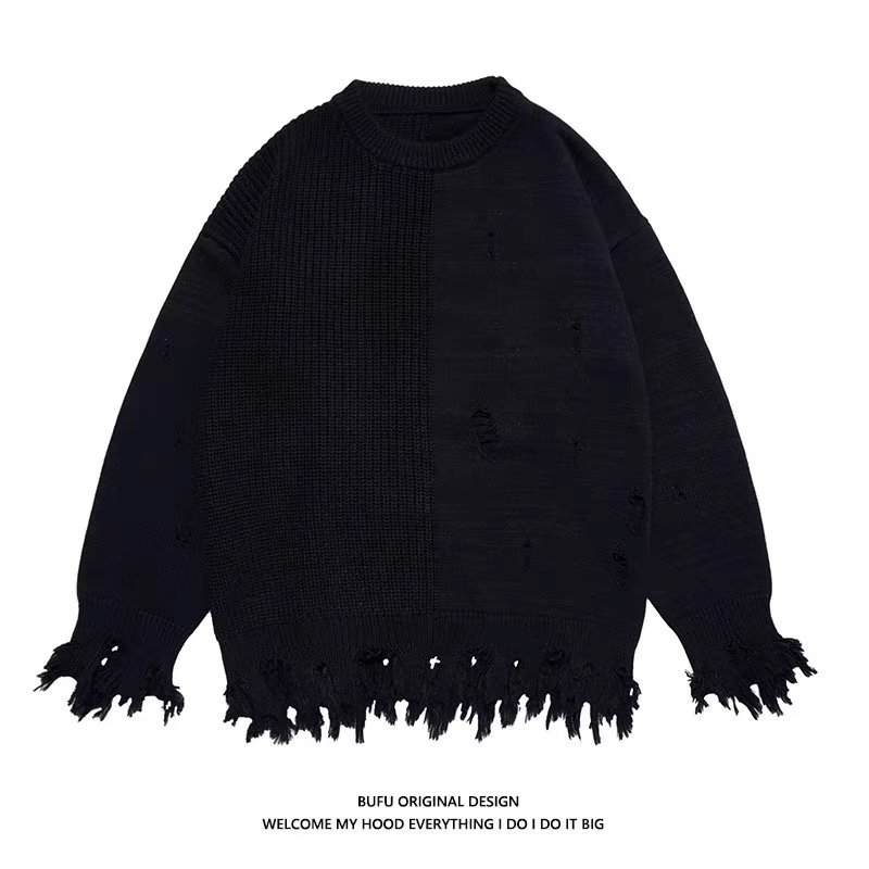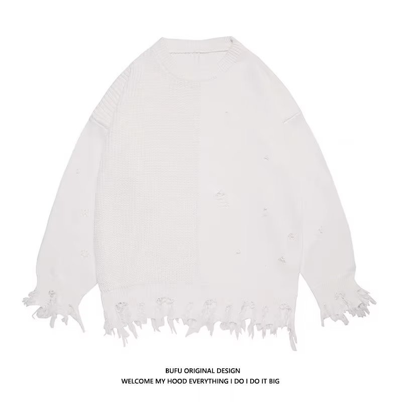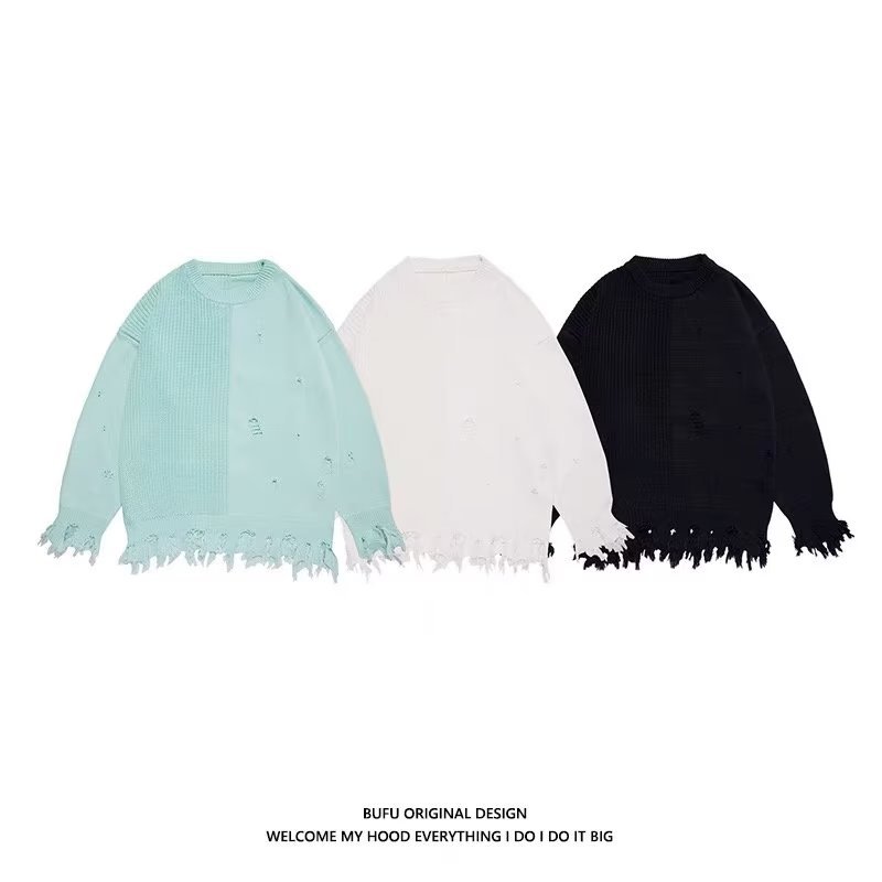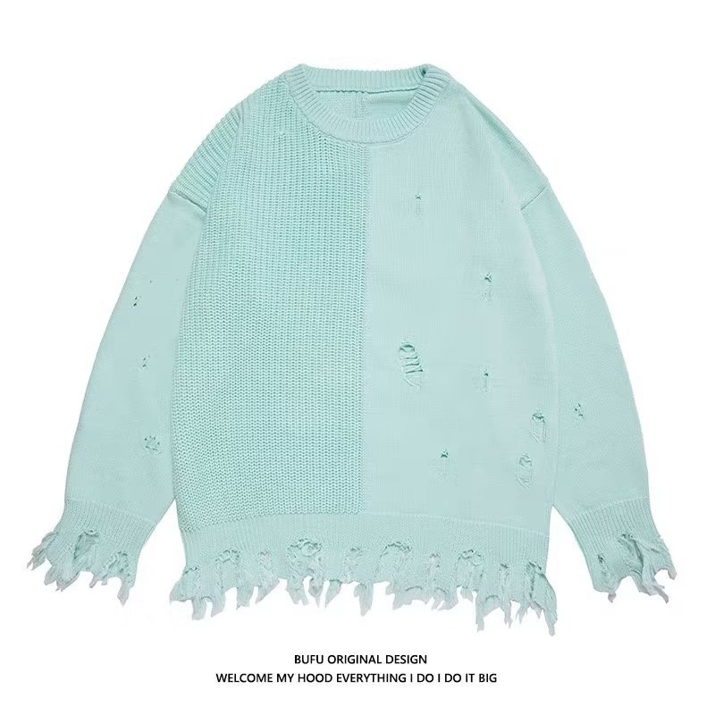 봄 2023 새로운 게으른 스타일 찢어진 민트 그린 스웨터 남자의 커플 유행 하이 스트리트 힙합 슬림 스웨터스토어 가기