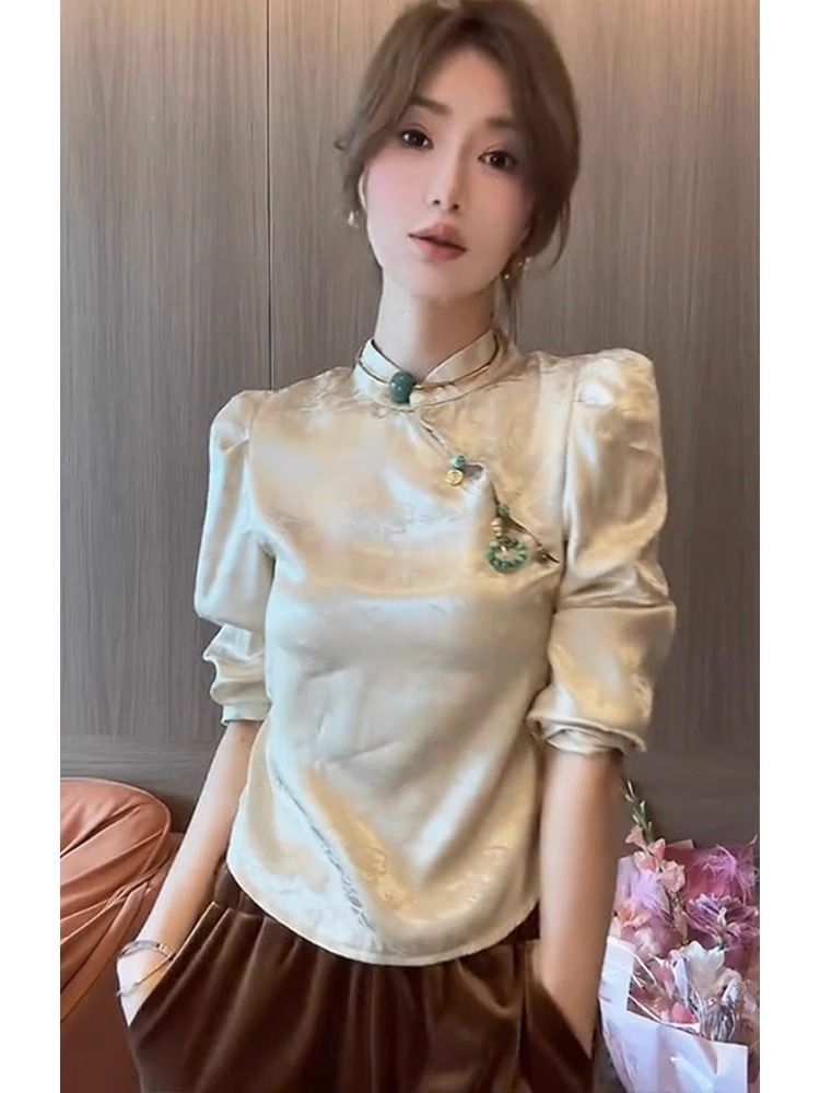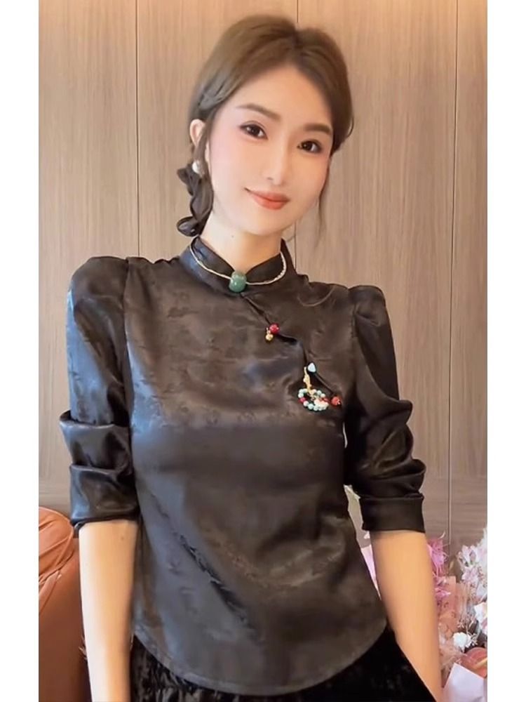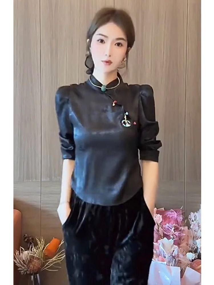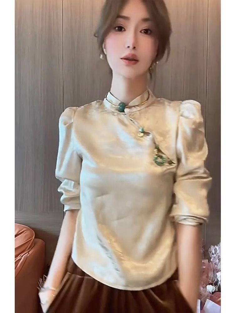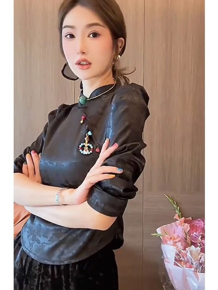 새로운 중국 스타일 여성의 원피스 경사 플래켓 버튼 내셔널 스타일 셔츠 2023 가을 새로운 하이 엔드 감각 틈새 긴팔 베이스 셔츠스토어 가기