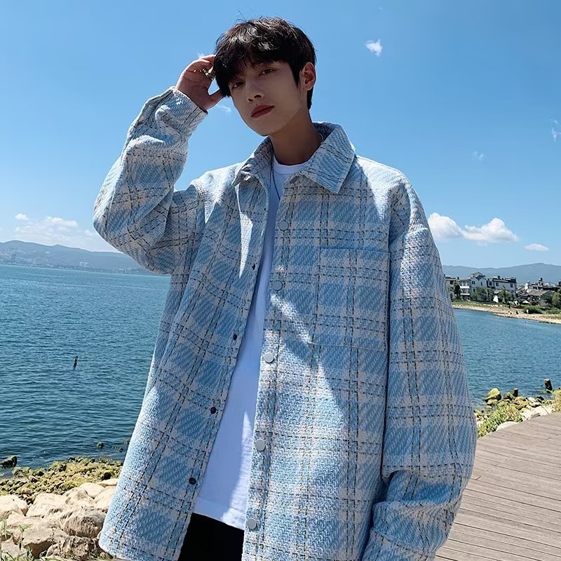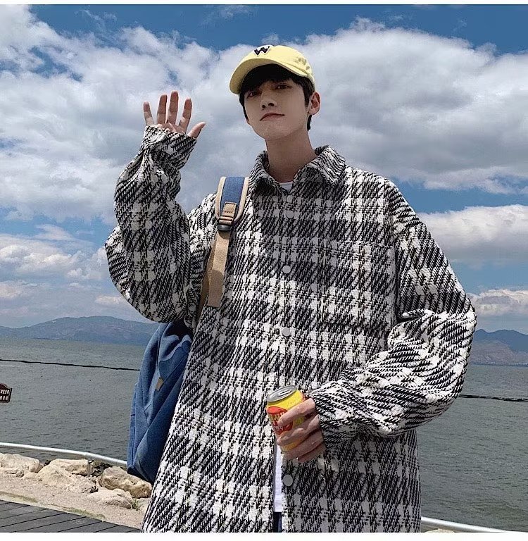 가을 착용 남자의 샤넬 스타일 코트 봄과 가을 예술적 복고풍 격자 무늬 트렌디 한 브랜드 셔츠 옷깃 Ruffian 잘 생긴 느슨한 재킷