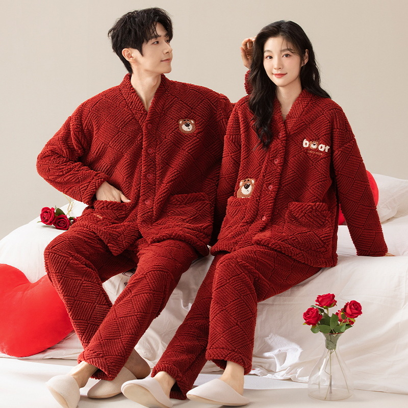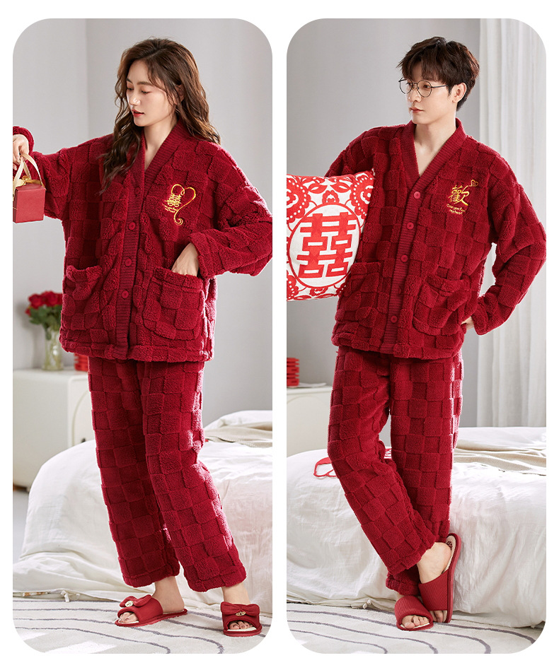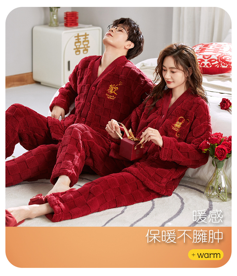 가을과 겨울 큰 빨간 커플 잠옷 산호 양털 기모 두꺼운 카디건 남자와 여자의 겨울 결혼식 축제 가정 옷
