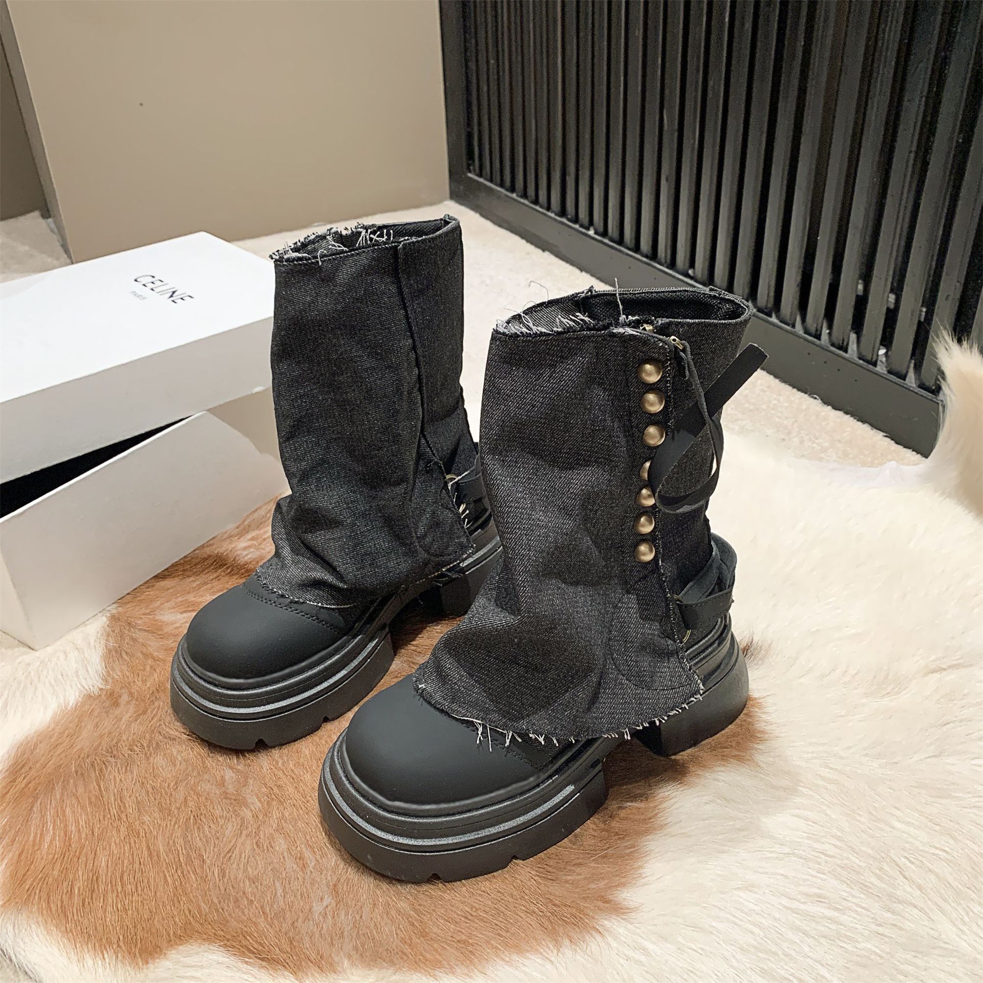 유행 브랜드 유럽과 미국 영국 스타일 슬리밍 패션 두꺼운 바닥 모든 일치 폭발 가을 데님 리벳 디자이너 부츠스토어 가기