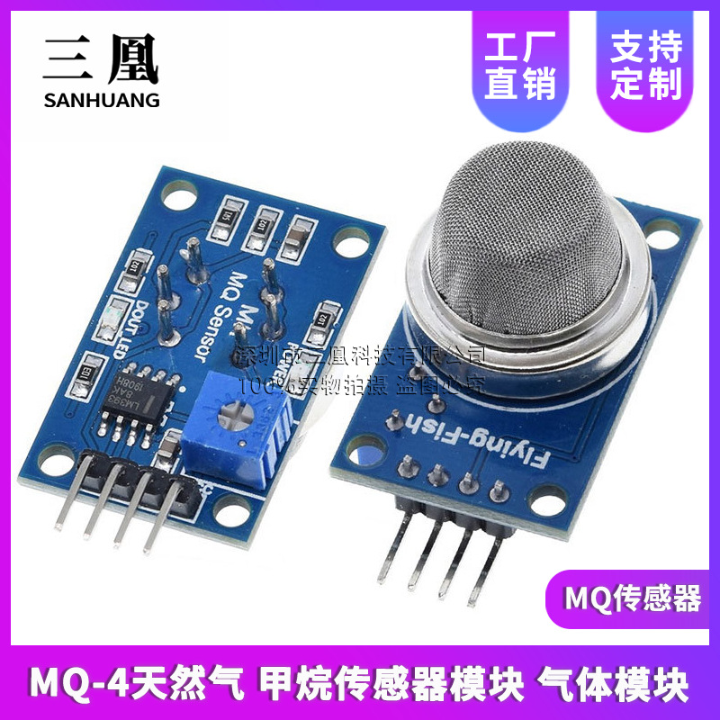MQ-4气体传感器所使用的气敏材料是在清洁空气中电导率较低的二氧化锡(Sno2)。当传感器所处环境中存在可燃气体时,传感器的电导率随空气中可燃气体浓度的增加而增大。使用简单的电路即可将电导率的变化转换为与该气体浓度相对应的输出信号。MQ-4气体传感器对甲烷的灵敏度高,对丙烷、丁烷也有较好的灵敏度。这种传感器可检测多种可燃性气体,特别是天然气,是一款适合多种应用的低成本传感器。