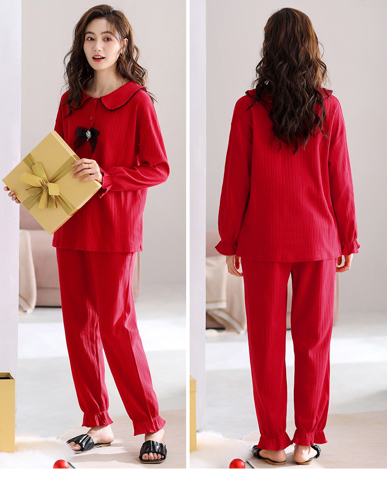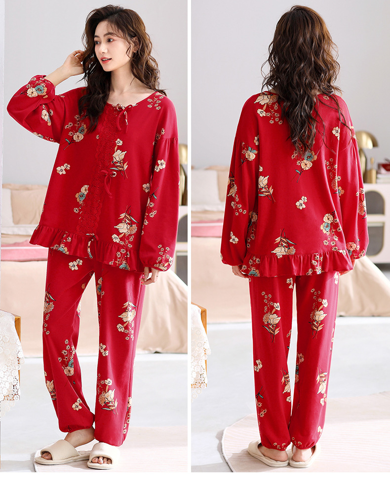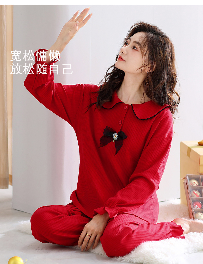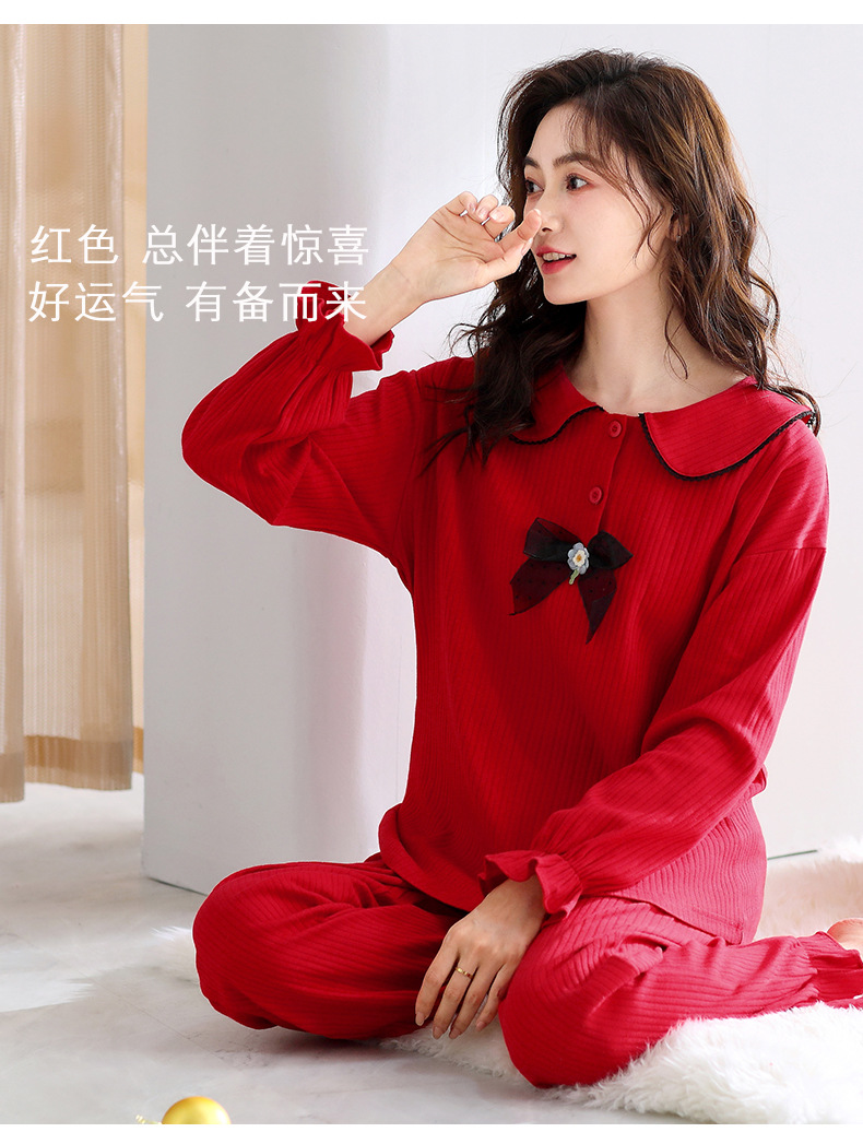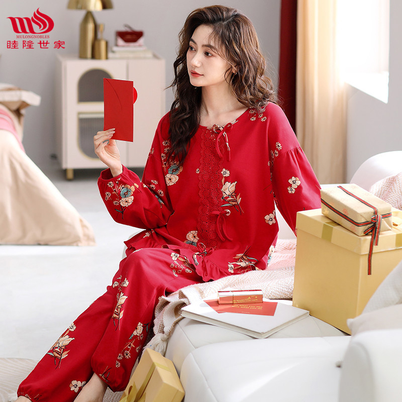 Mulong 귀족 가족 빨간 잠옷 여자의 생일 년 봄과 가을 면 긴 소매 면 가을과 겨울 얇은 플러스 사이즈 가정 옷