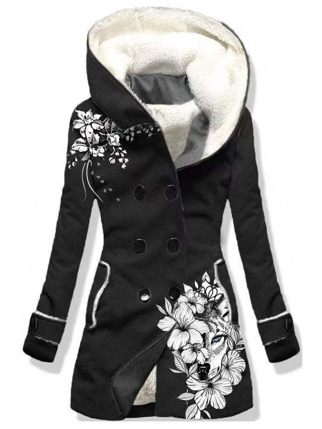 2025 새로운 스타일 벨벳 더블 브레스트 후드 솔리드 컬러 유럽과 미국의 중간 길이 여성 솔리드 컬러 기질 통근자 재킷스토어 가기