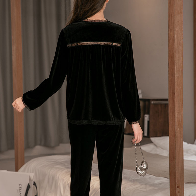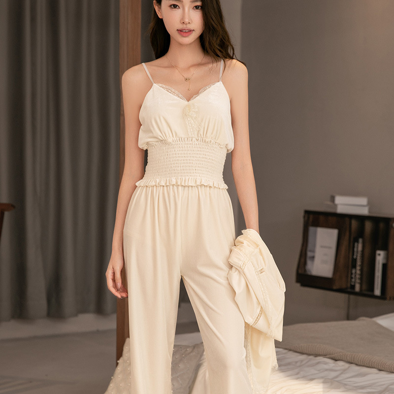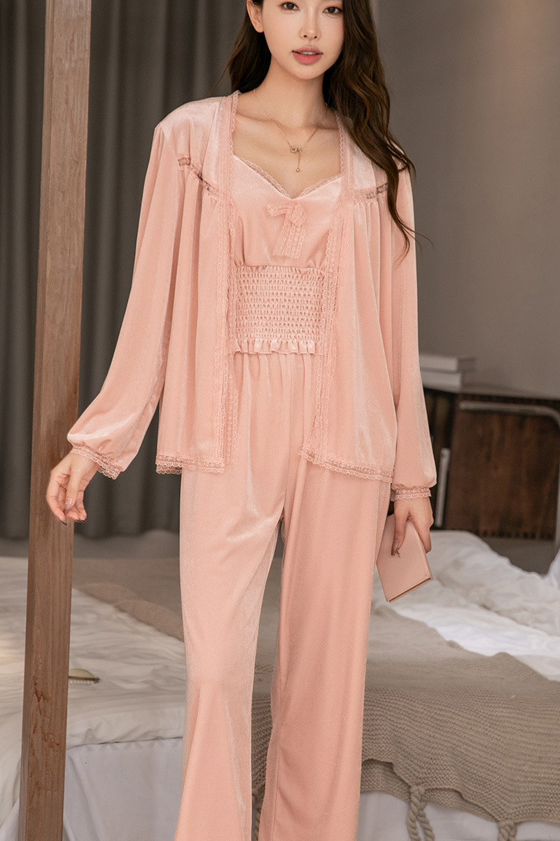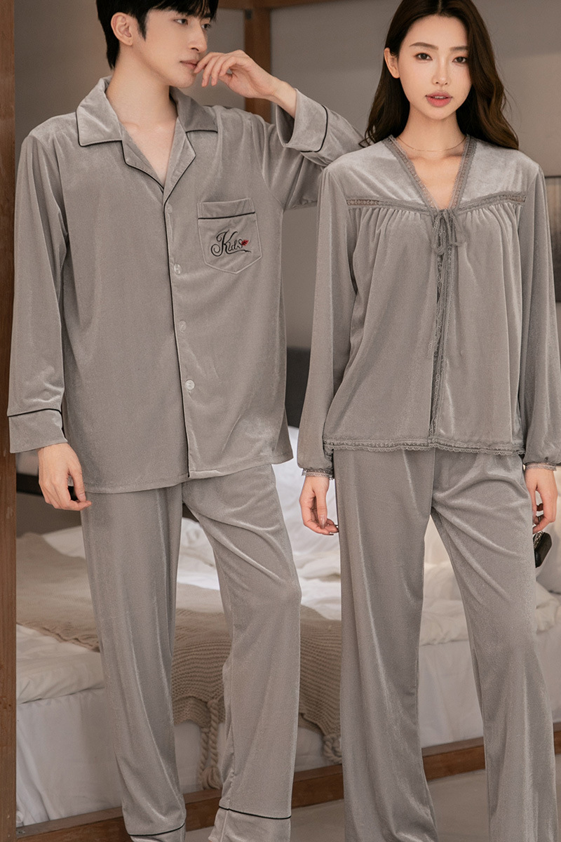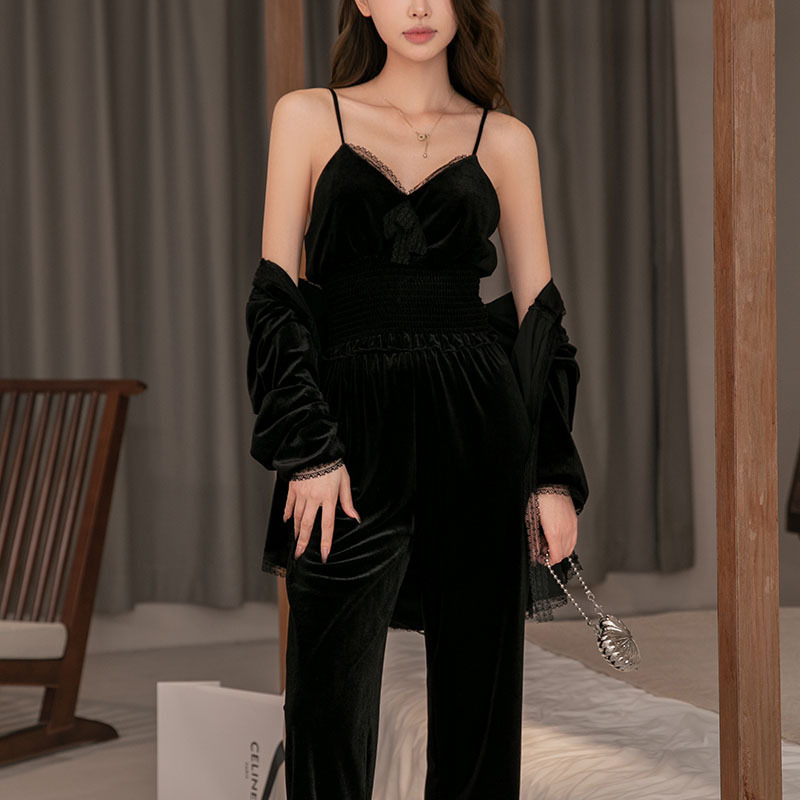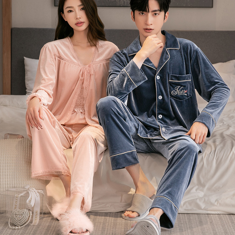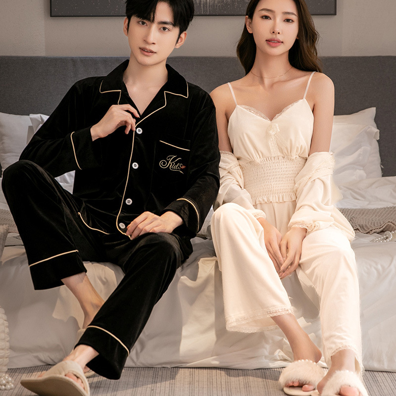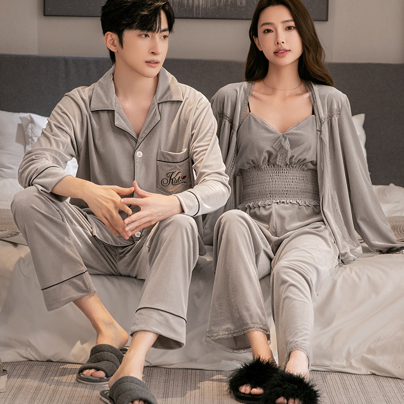 가을과 겨울 새로운 골든 벨벳 커플 잠옷 여자의 섹시한 쓰리 피스 세트 남자의 긴팔 아웃웨어 가정 옷 세트