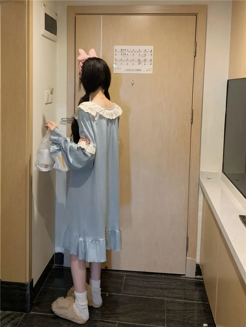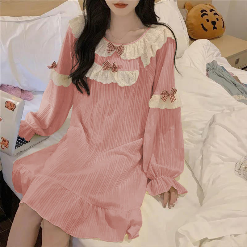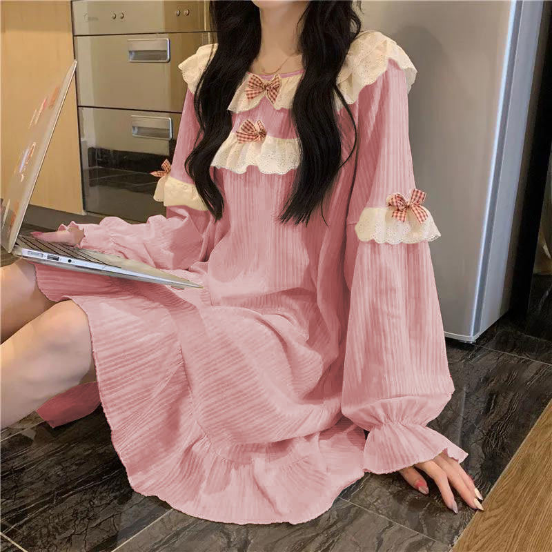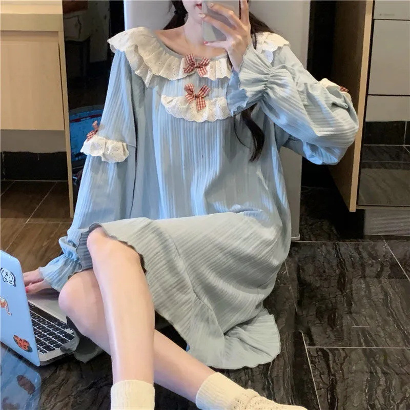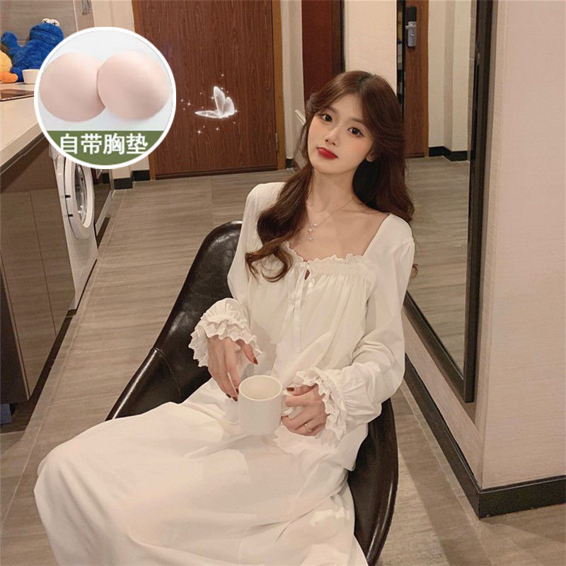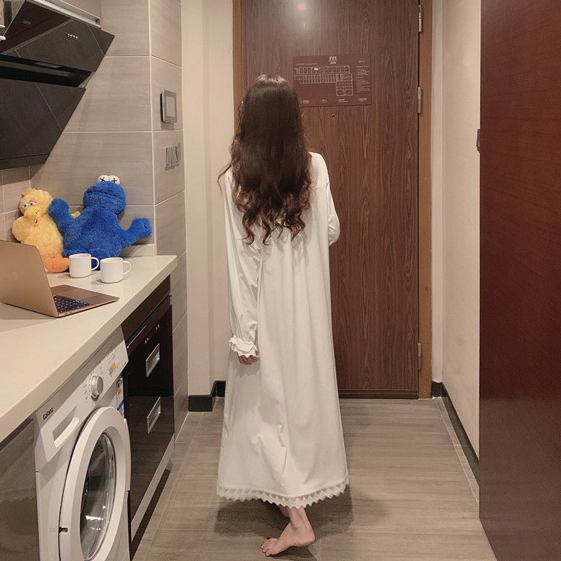 플러스 사이즈 잠옷 여자의 봄과 가을 잠옷 가슴 패드 코트 복고풍 스타일 레이스 긴 원피스 가정 옷 크로스 보더 해외 무역 독점스토어 가기