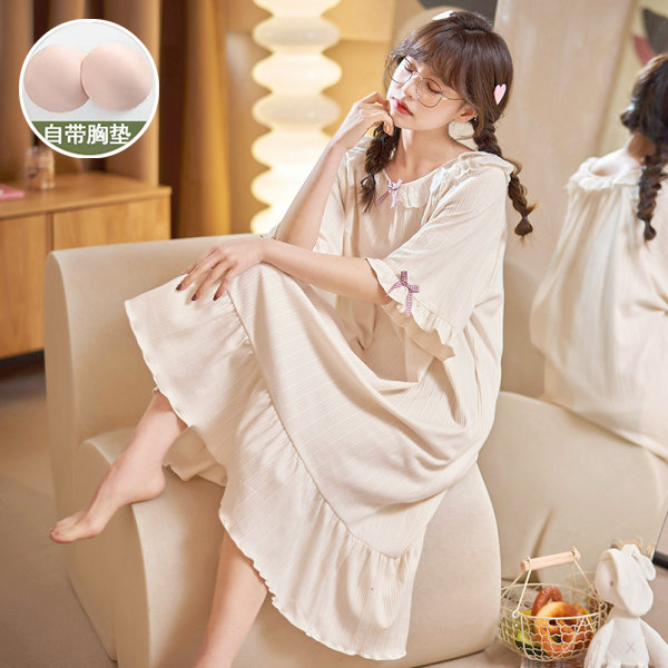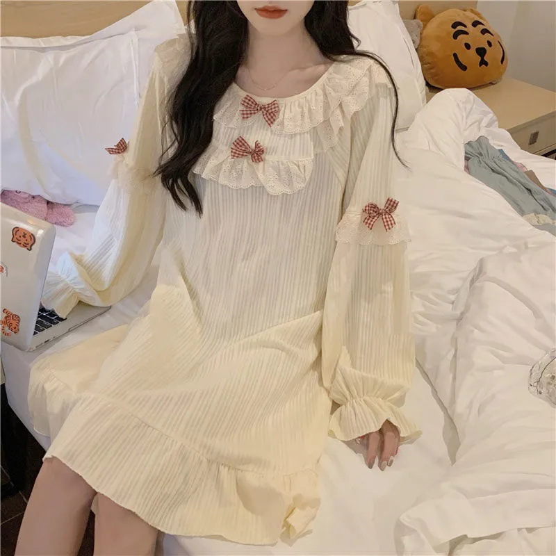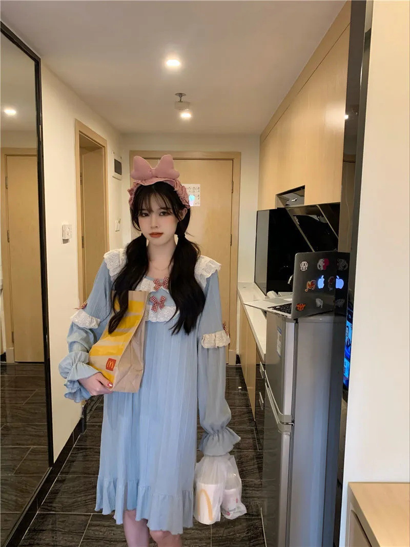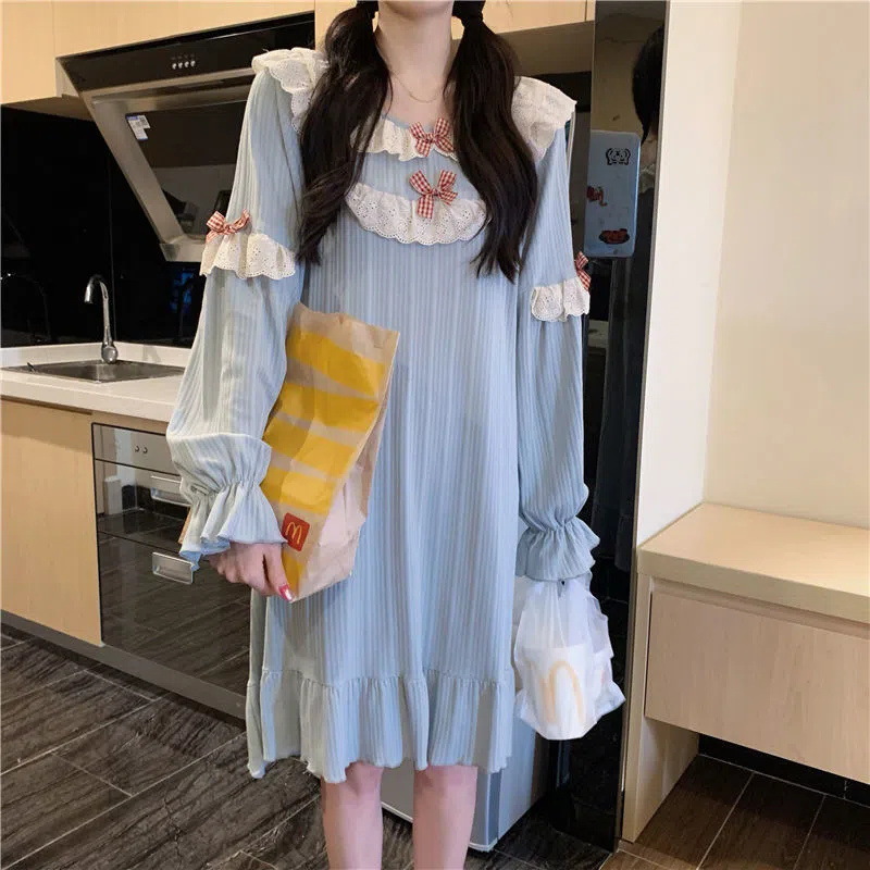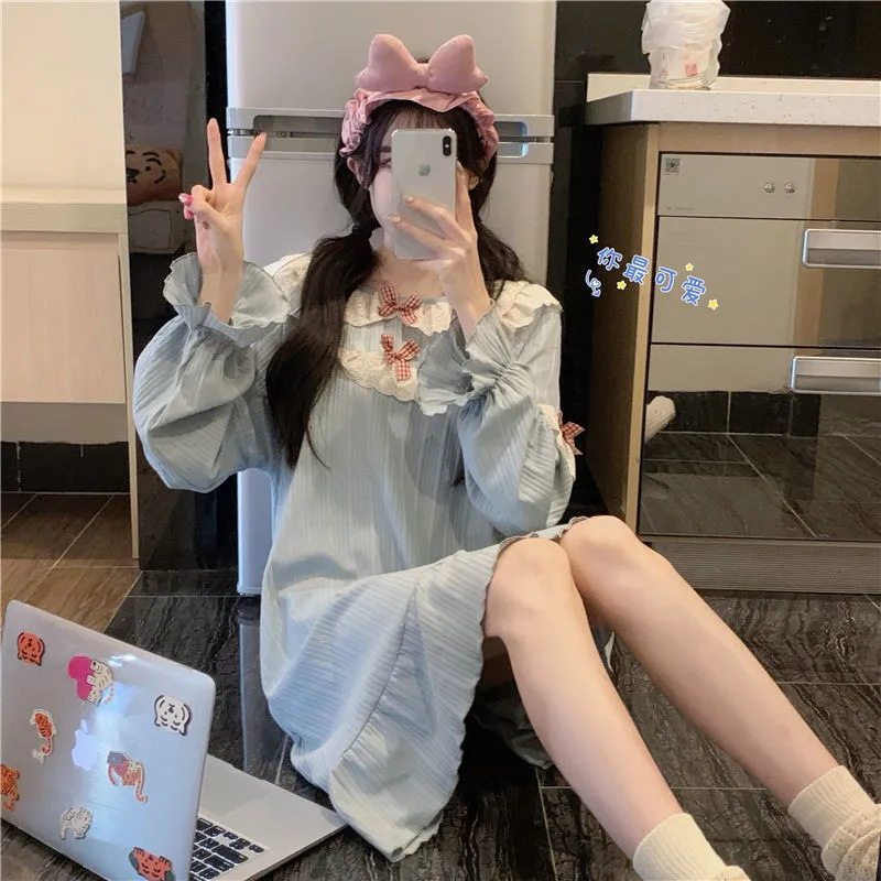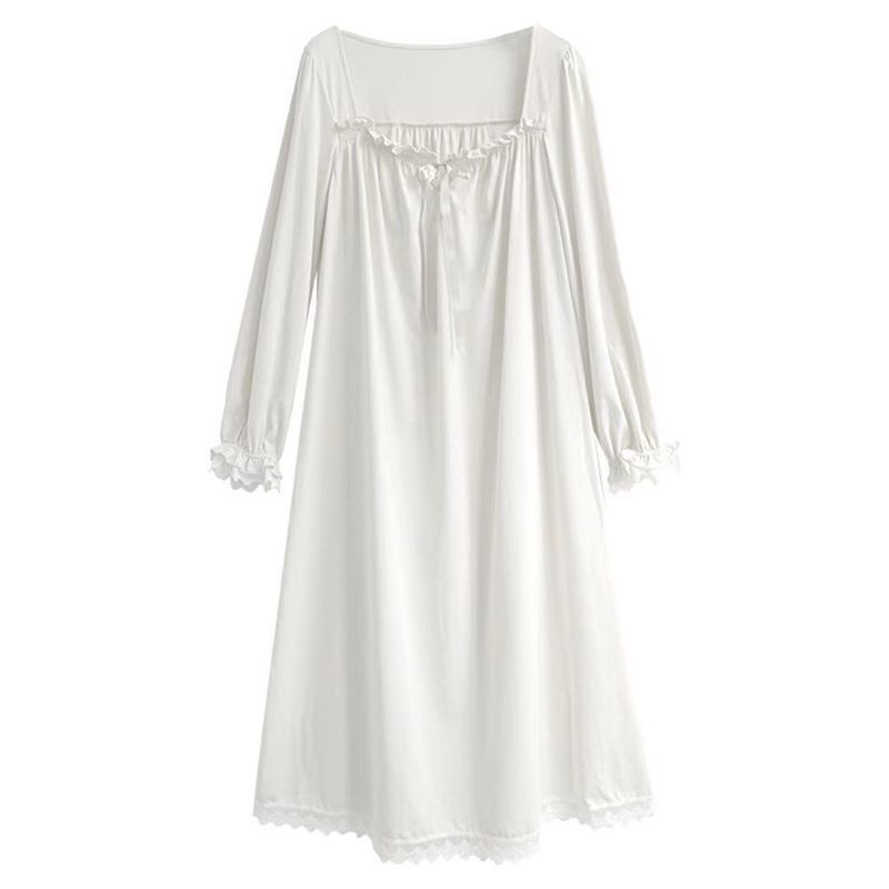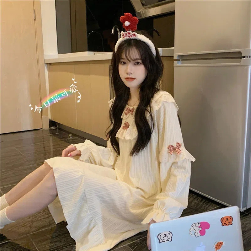플러스 사이즈 잠옷 여자의 봄과 가을 잠옷 가슴 패드 코트 복고풍 스타일 레이스 긴 원피스 가정 옷 크로스 보더 해외 무역 독점스토어 가기