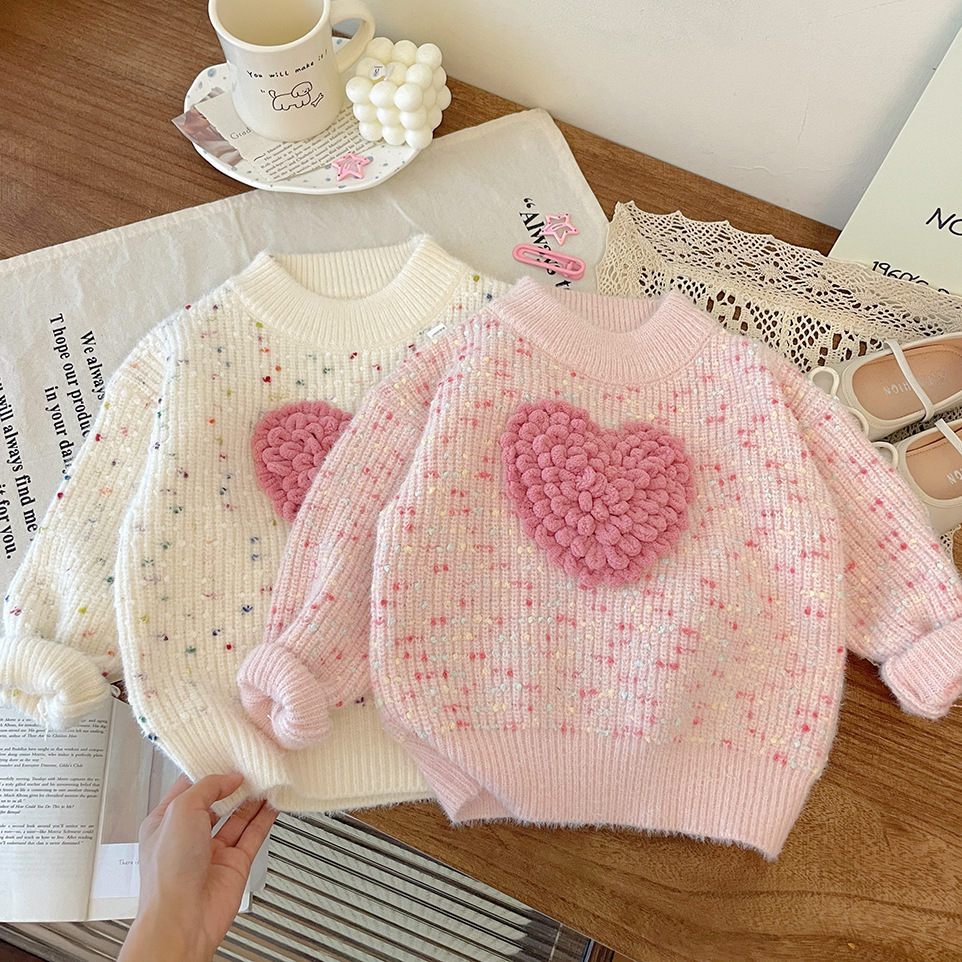 한국 아동복 2025 겨울 신작 여아 세련된 입체 모피 사랑 다채로운 니트 풀오버 두꺼운 스웨터스토어 가기