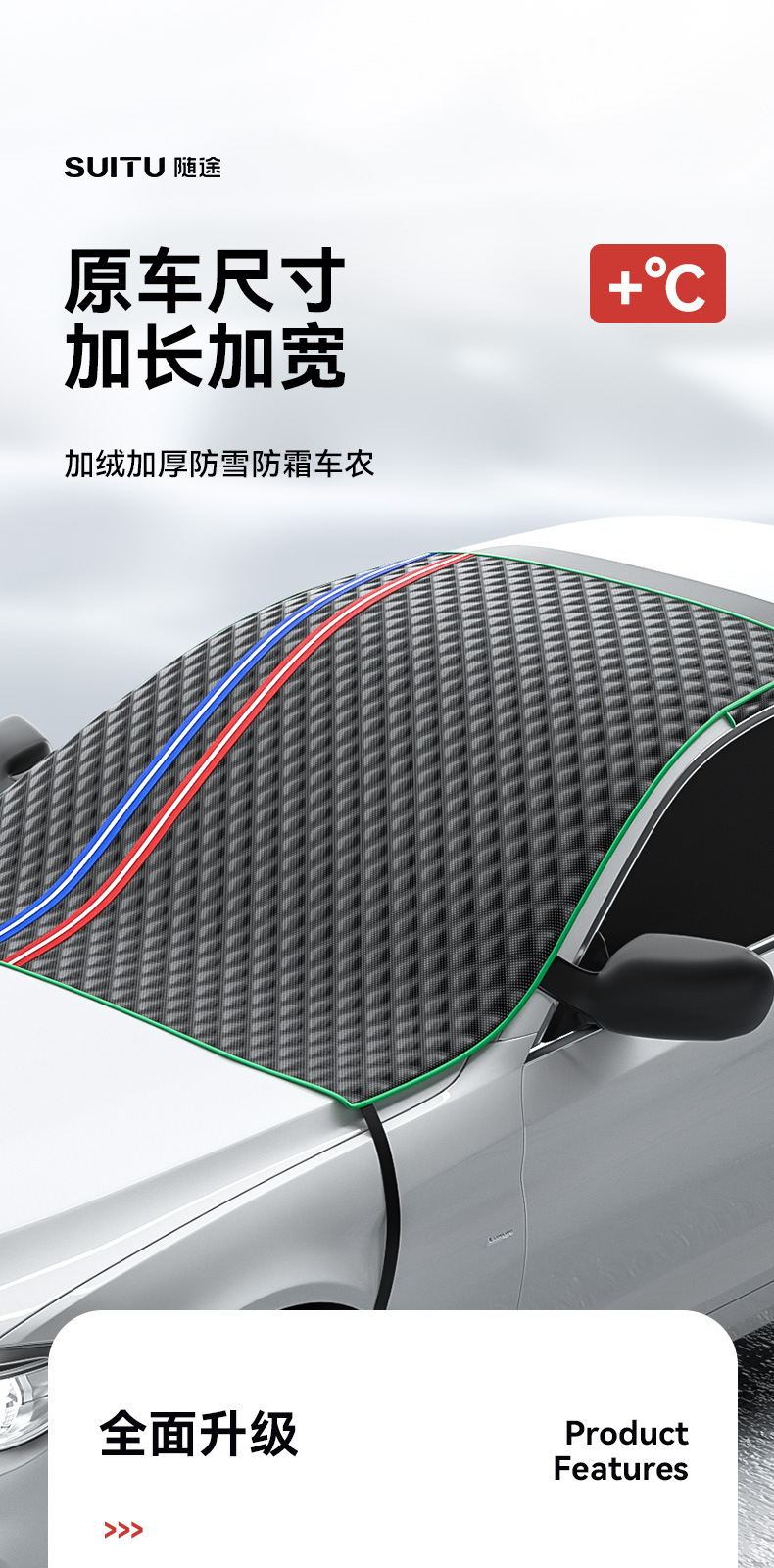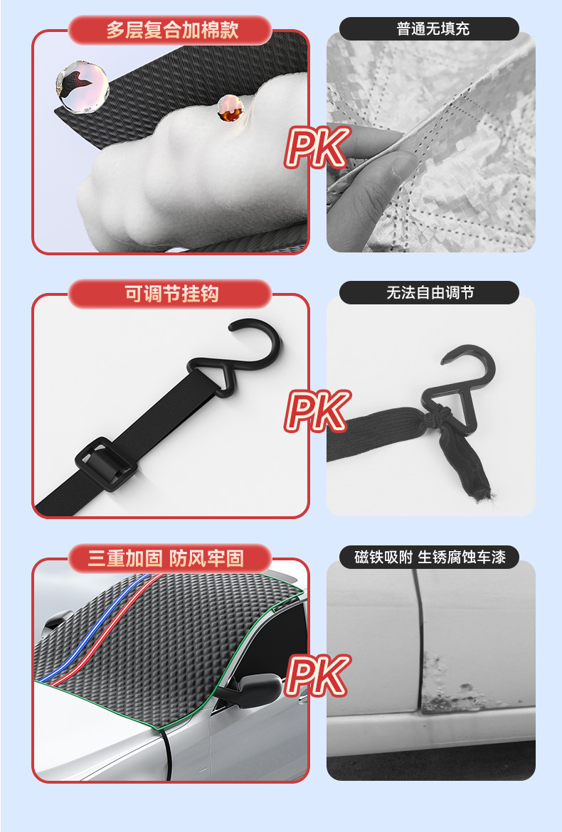 1、加厚膜材质,不伤车漆,防晒、隔热、防雨雪、防风尘、防划痕、防紫外线、抗拉力强。