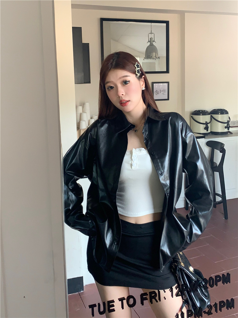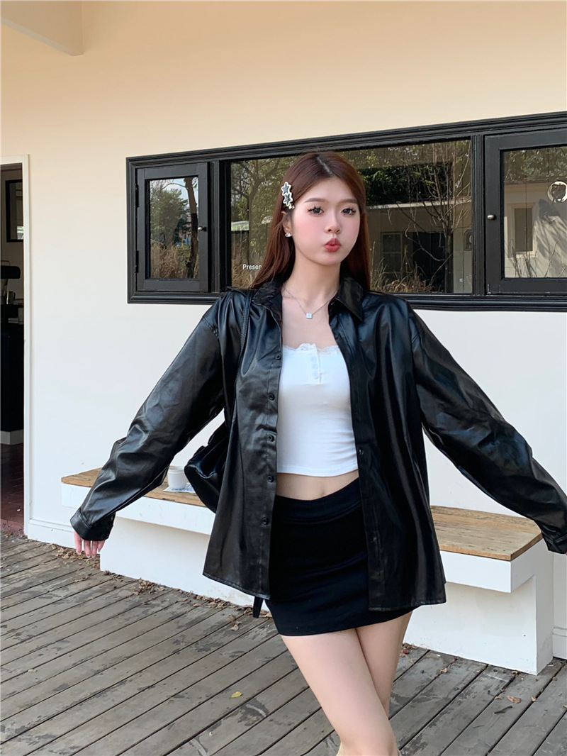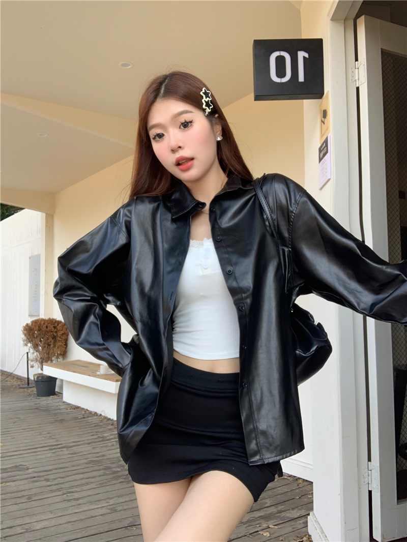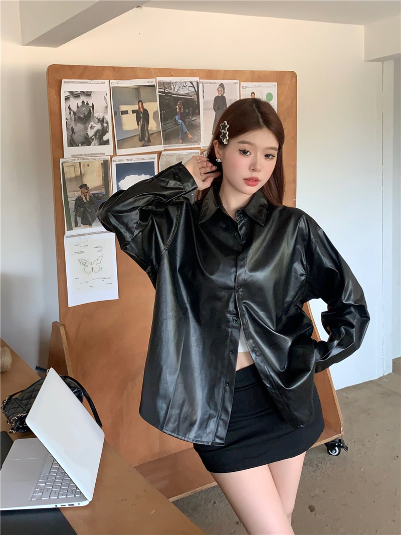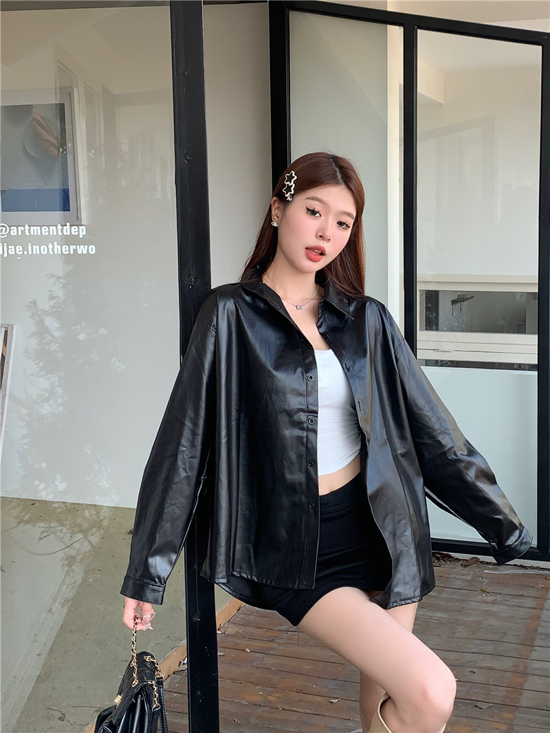 공장 재고 2023 가을과 겨울 새로운 PU 캐주얼 셔츠 가죽 코트 여자의 뜨거운 소녀 패션 느슨한 셔츠 조수스토어 가기