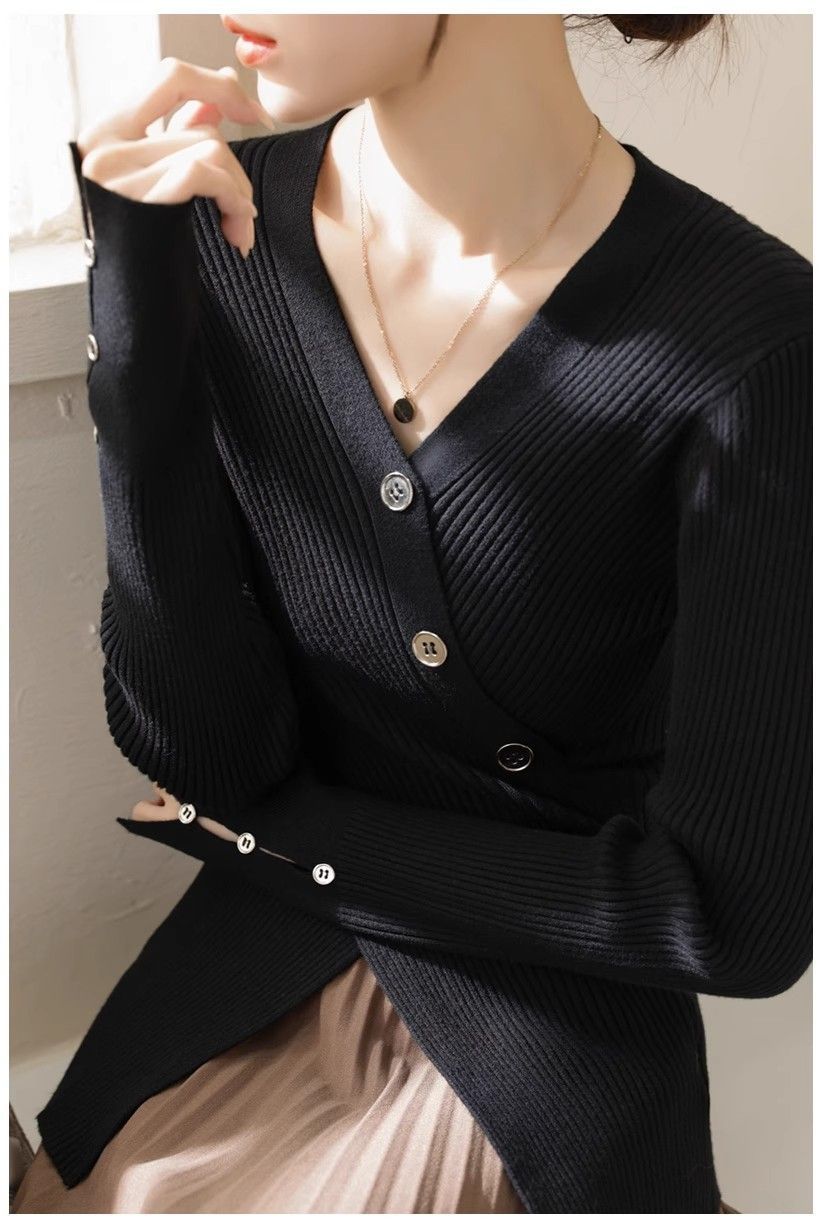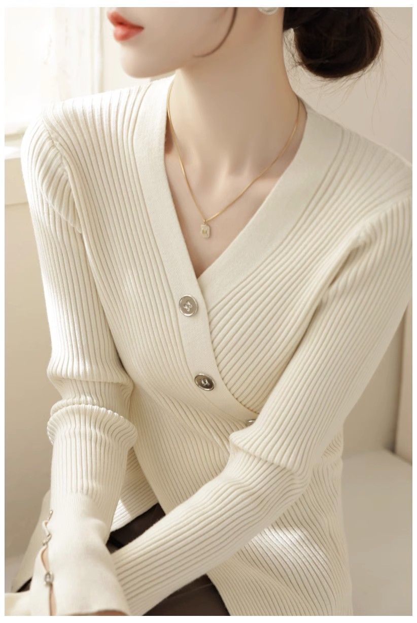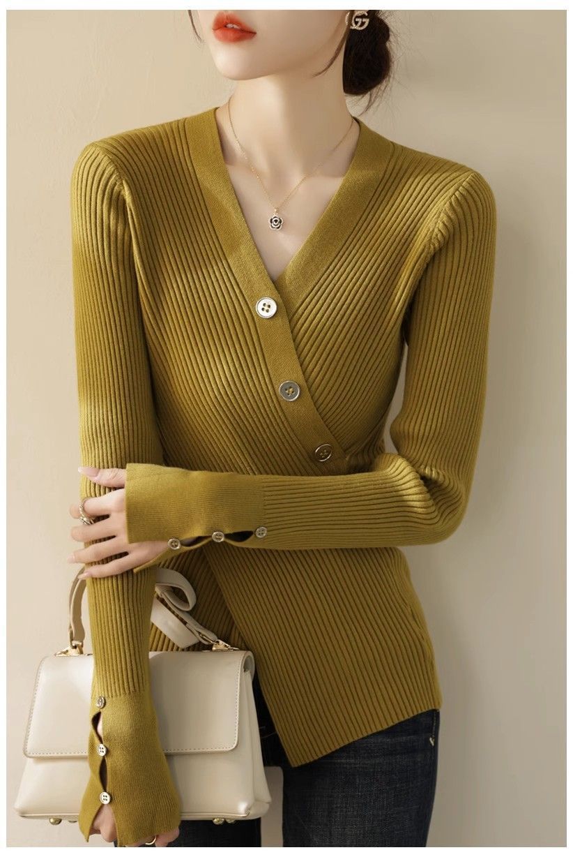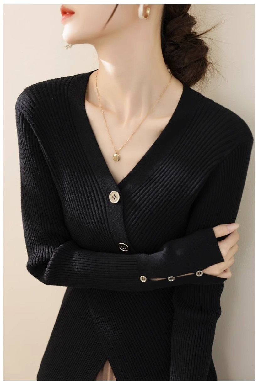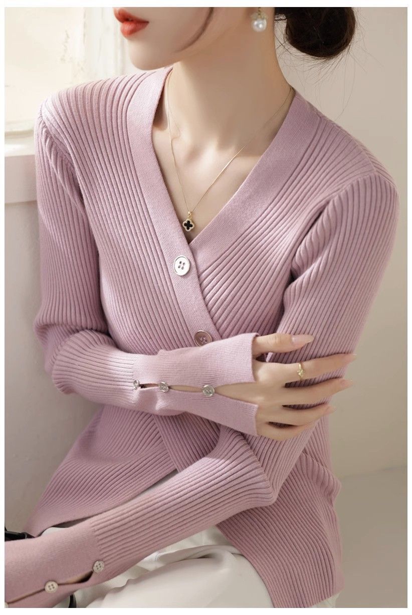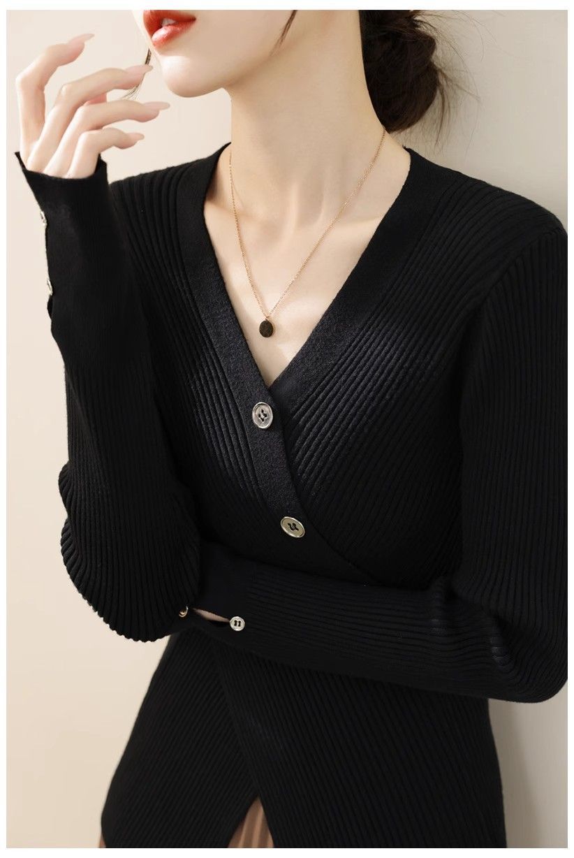 한국 V-넥 크로스 버튼 스플릿 디자인 느낌 바닥 2023 가을 새로운 긴팔 스웨터 탑 여성