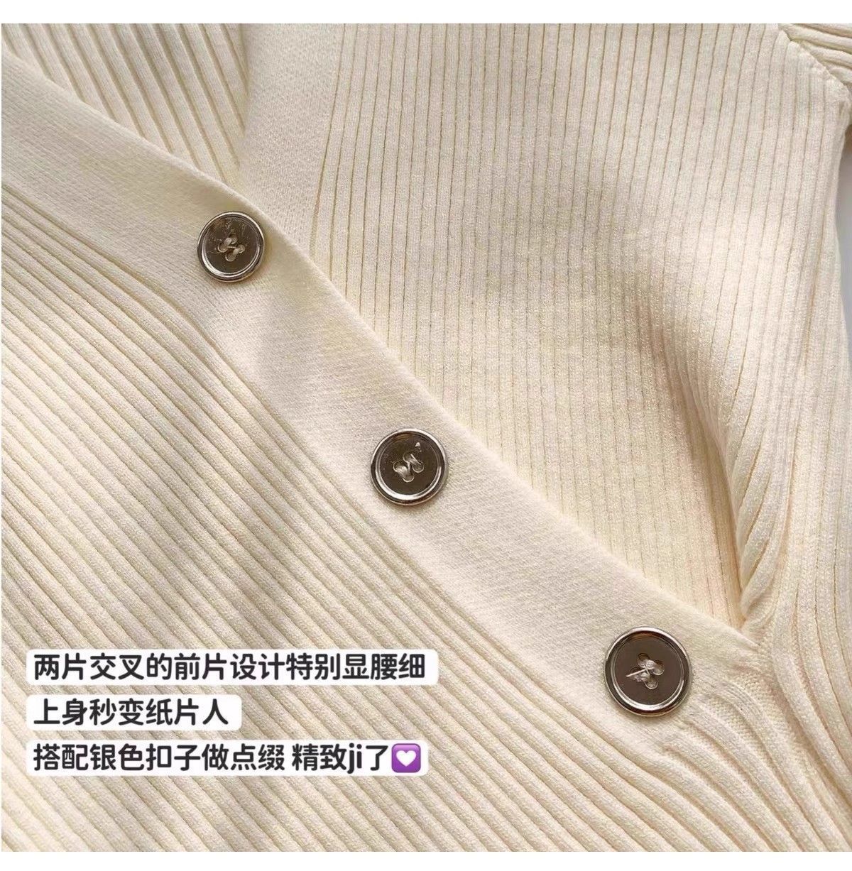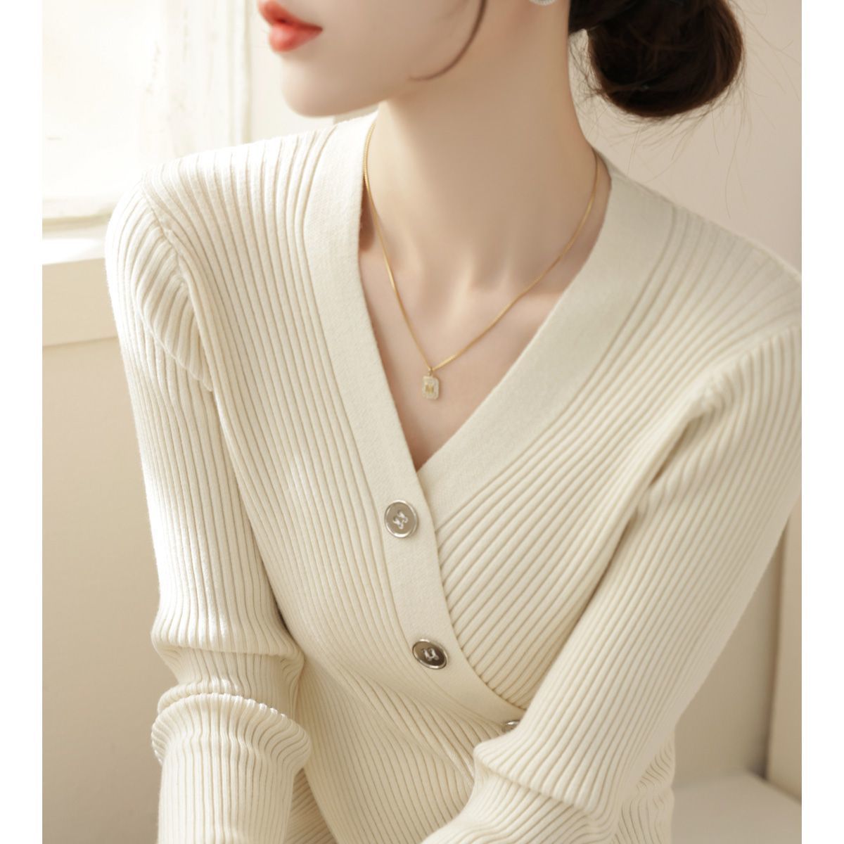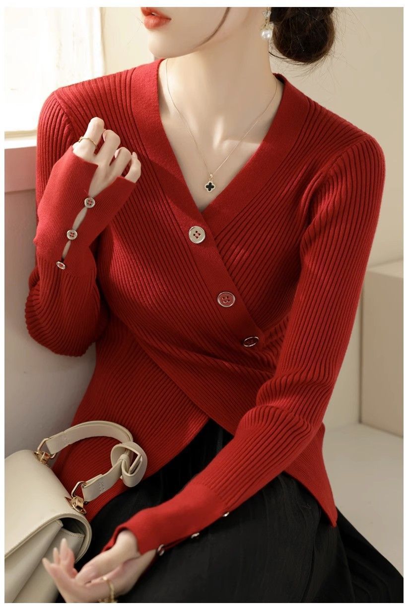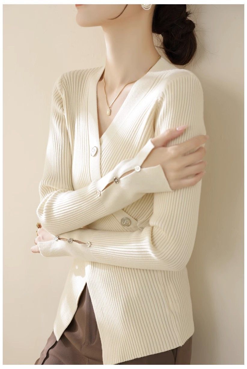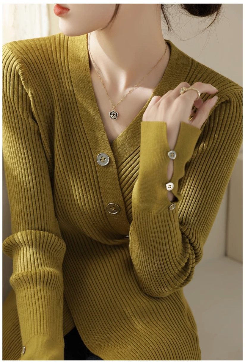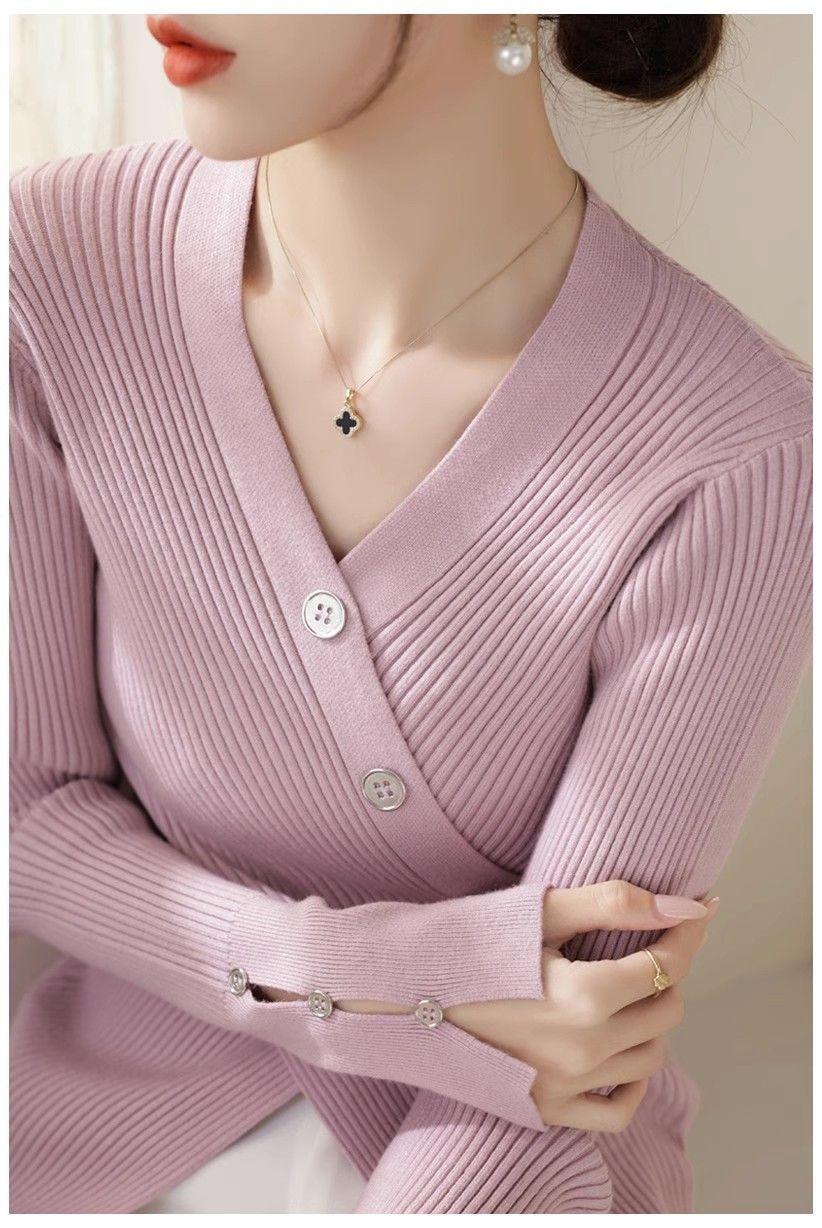 한국 V-넥 크로스 버튼 스플릿 디자인 느낌 바닥 2023 가을 새로운 긴팔 스웨터 탑 여성