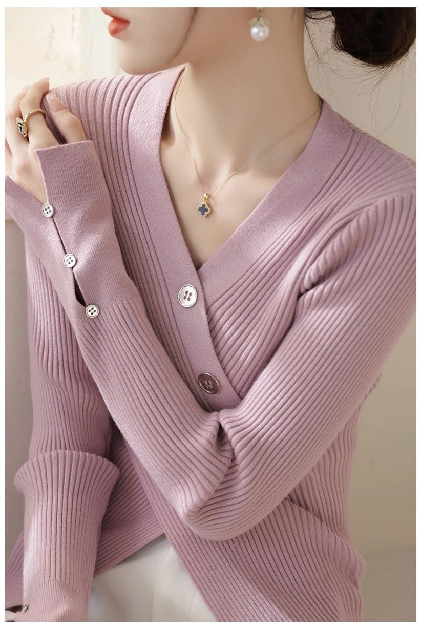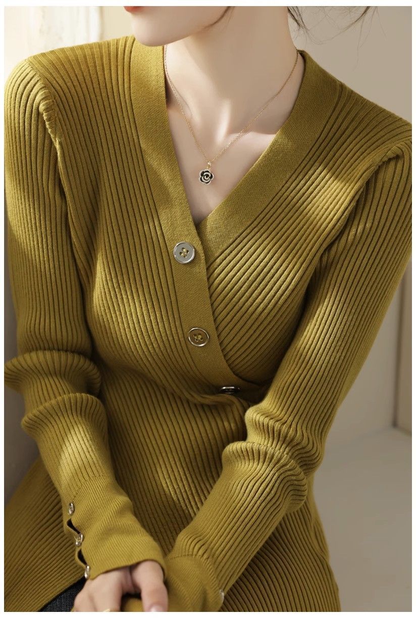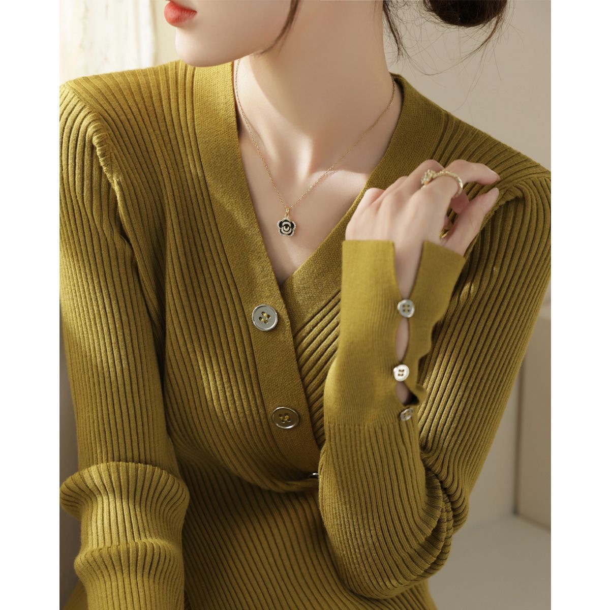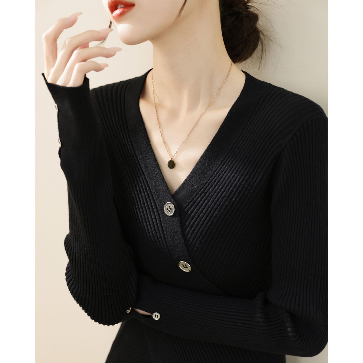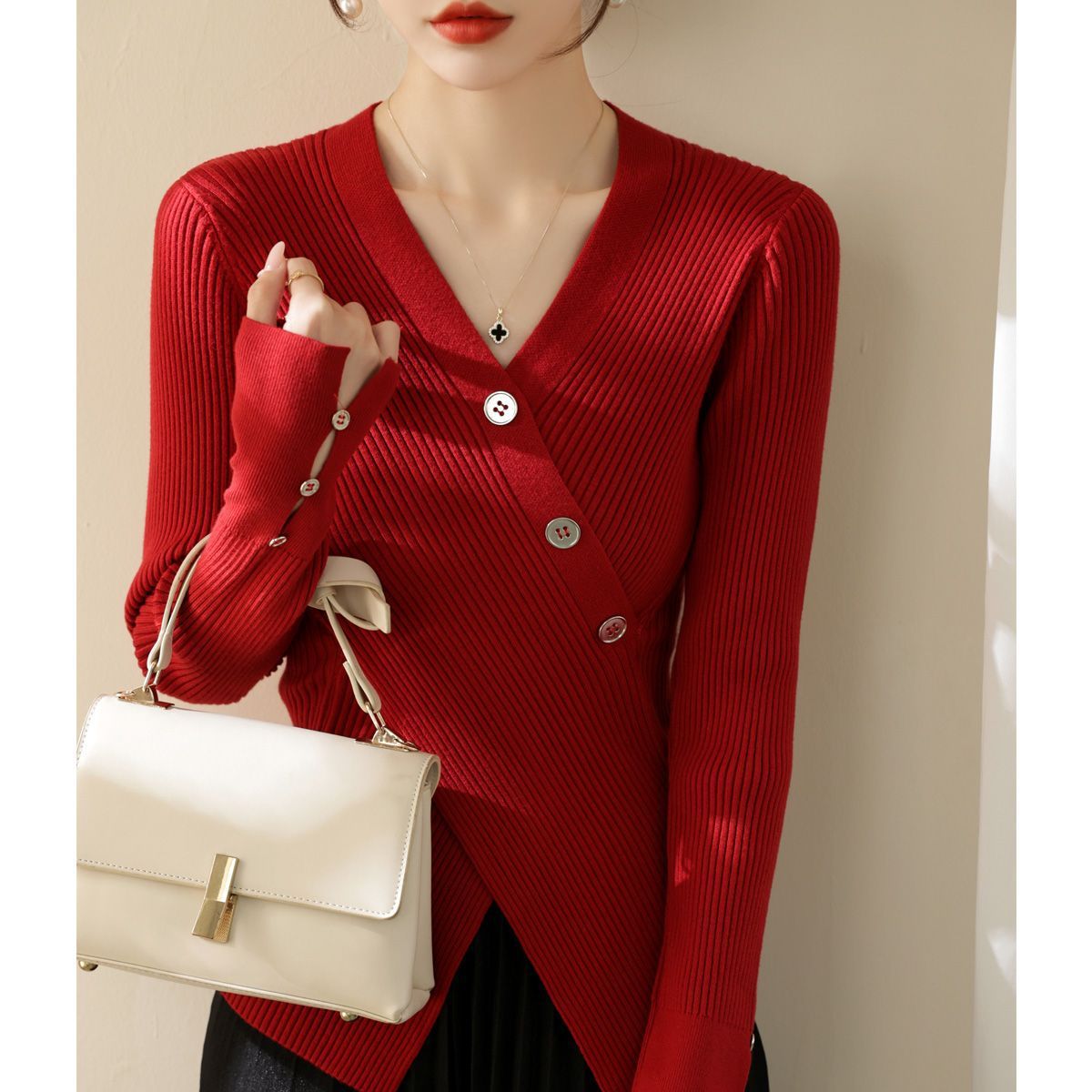 한국 V-넥 크로스 버튼 스플릿 디자인 느낌 바닥 2023 가을 새로운 긴팔 스웨터 탑 여성