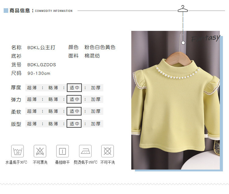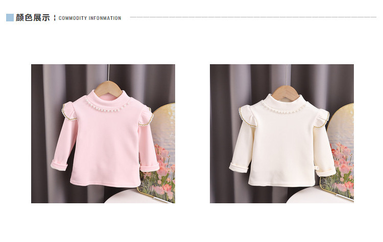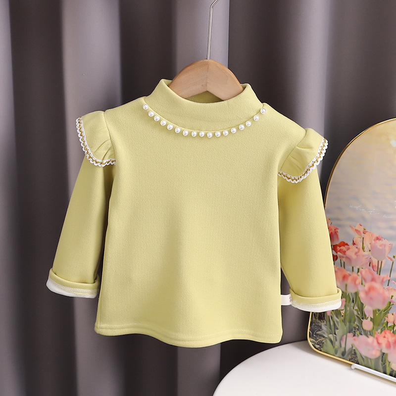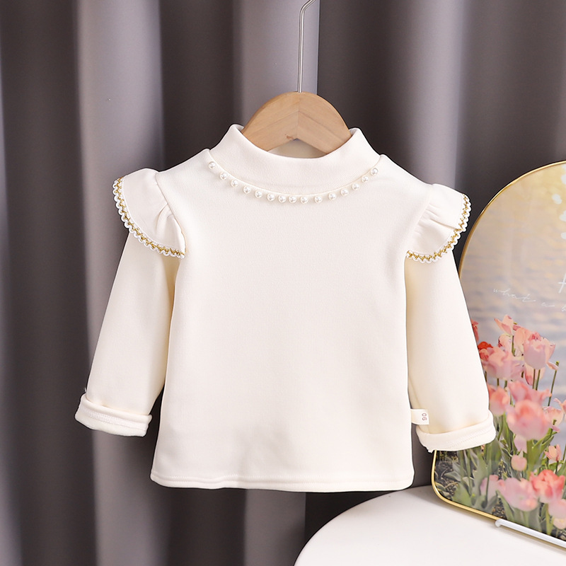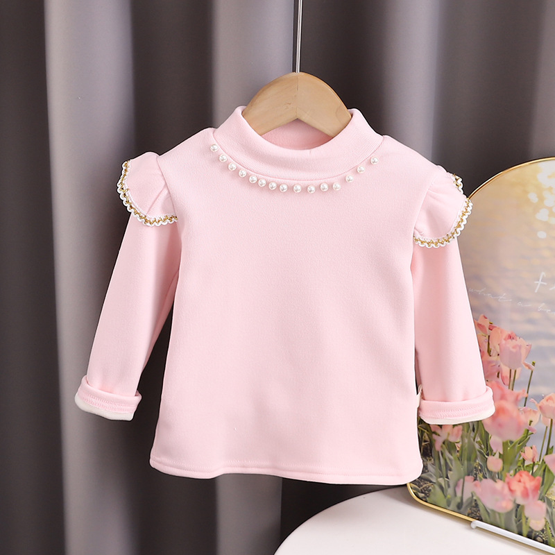 하이 퀄리티 소녀 최고의 가을과 겨울 서양식 진주 둥근 목 긴 소매 어린이 공주 기모 밑바닥 셔츠 최고 아동복
