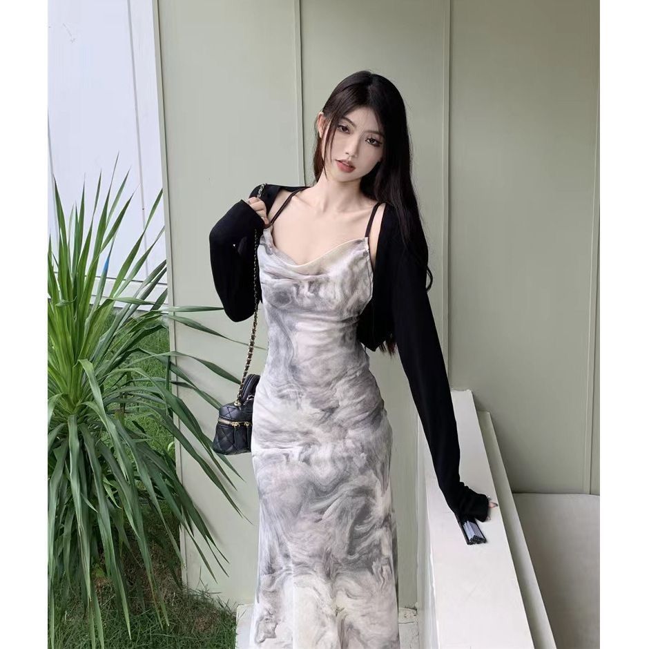 우아한 사교계 하이 웨이스트 슬링 원피스 여름 2023 새로운 프랑스 등이없는 디자인 시크 중간 길이 원피스스토어 가기