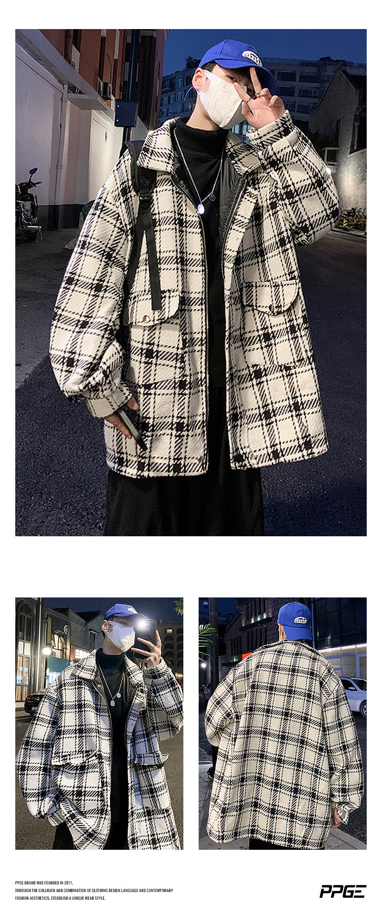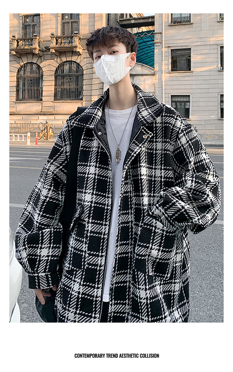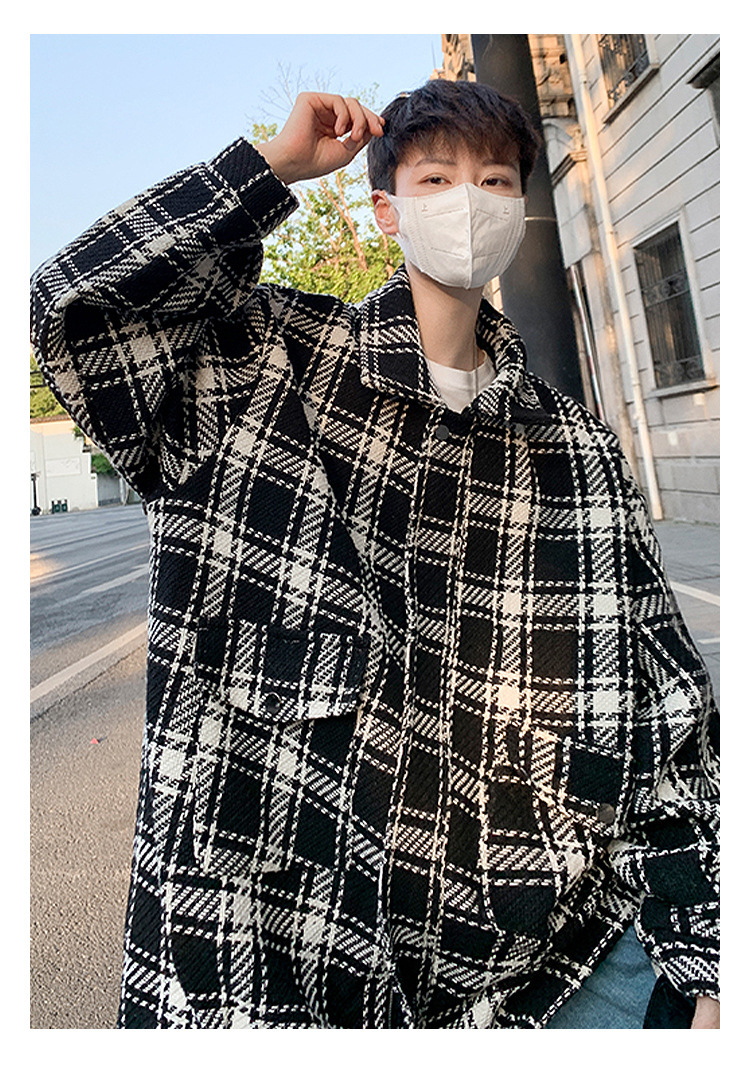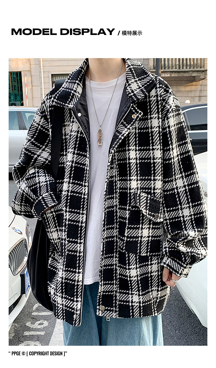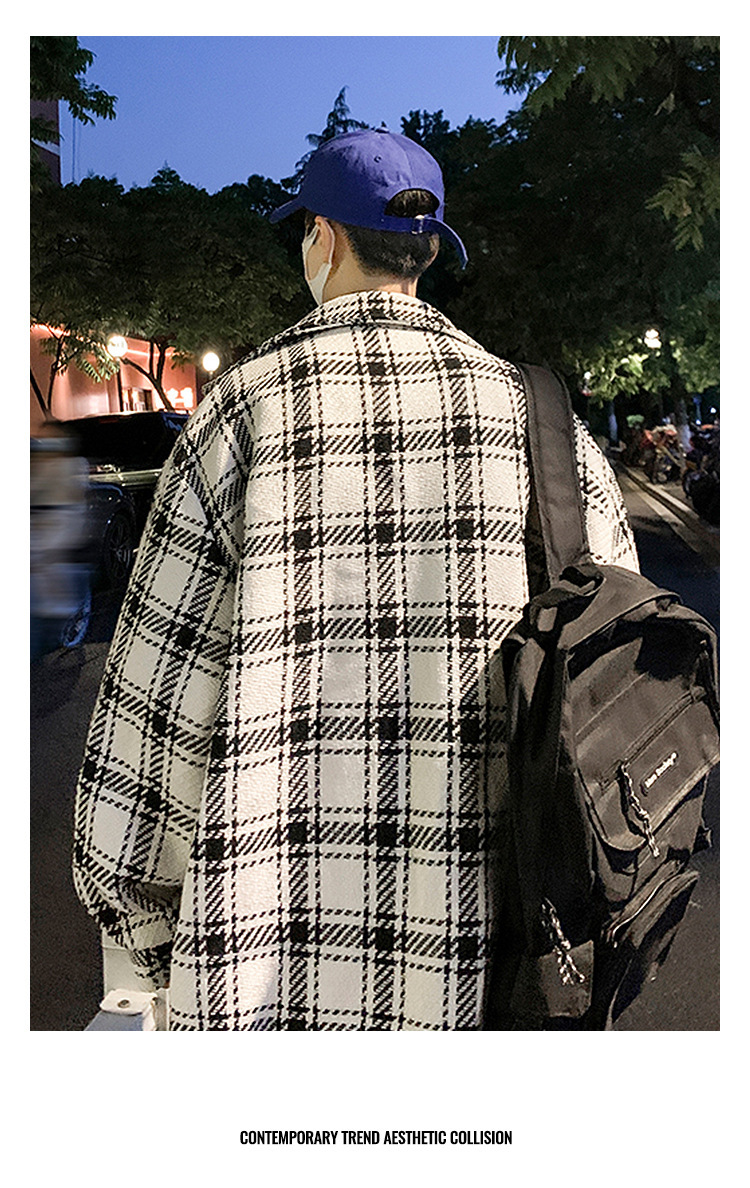 小香风外套男春秋新款格子毛呢大衣痞帅oversize夹克高街潮牌大码