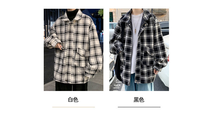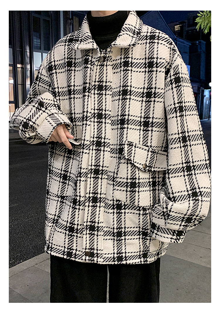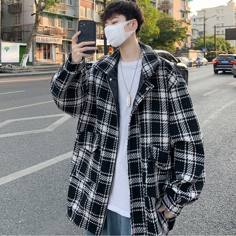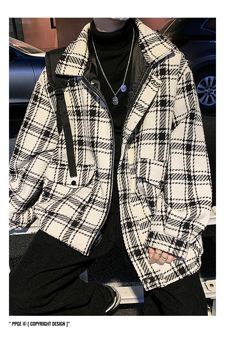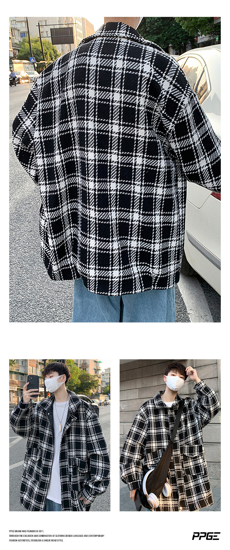 小香风外套男春秋新款格子毛呢大衣痞帅oversize夹克高街潮牌大码