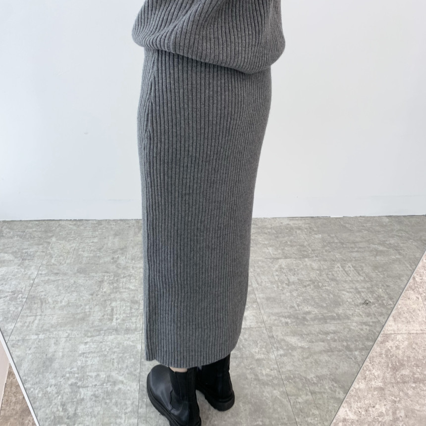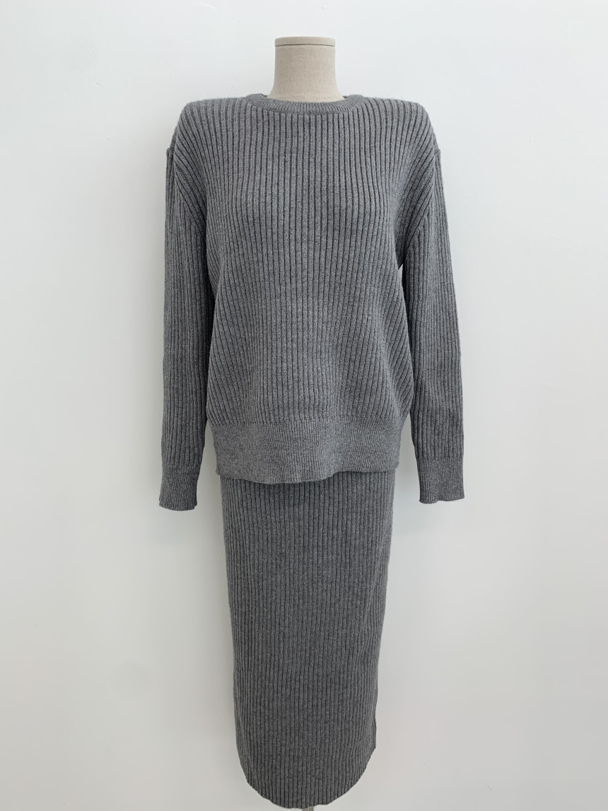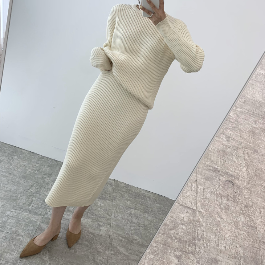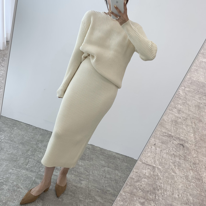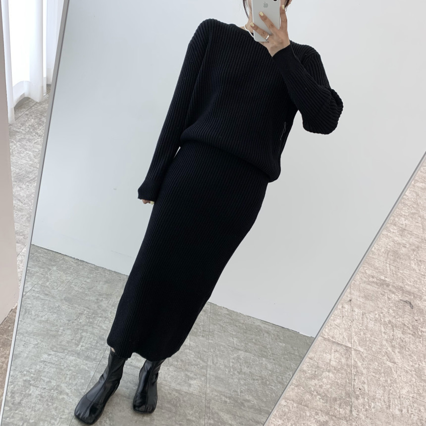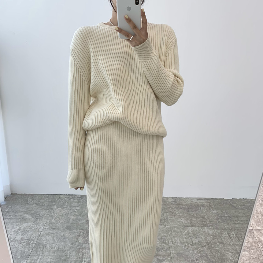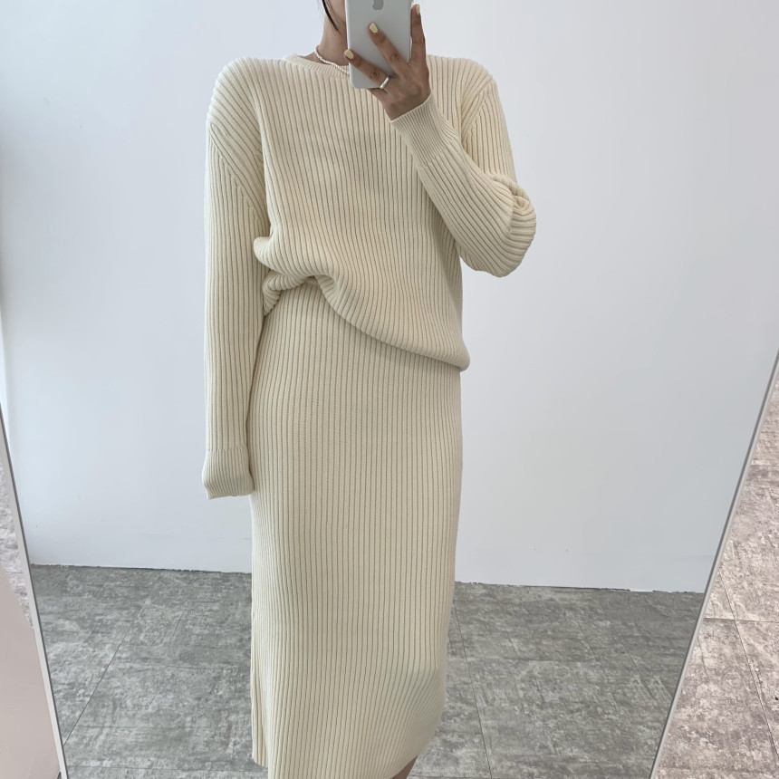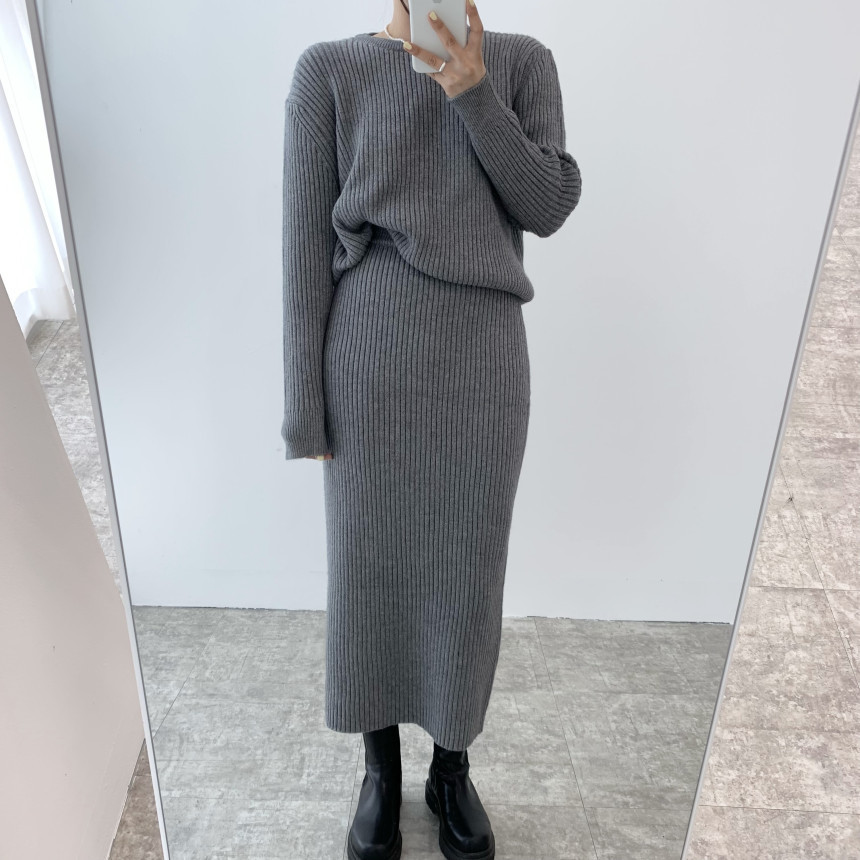재고 한국 복고풍 간단한 두꺼운 라운드 넥 긴 소매 스웨터 + 니트 스커트 투피스 세트 여성용스토어 가기