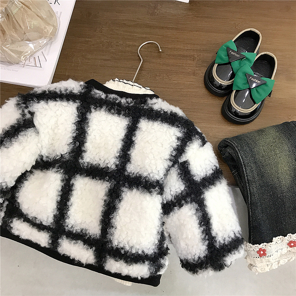 한국 소녀의 양고기 울 코트 겨울 새로운 어린이 두꺼운 격자 무늬 아기의 서양 스타일 따뜻한 울 스웨터 대외 무역스토어 가기