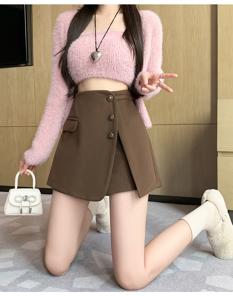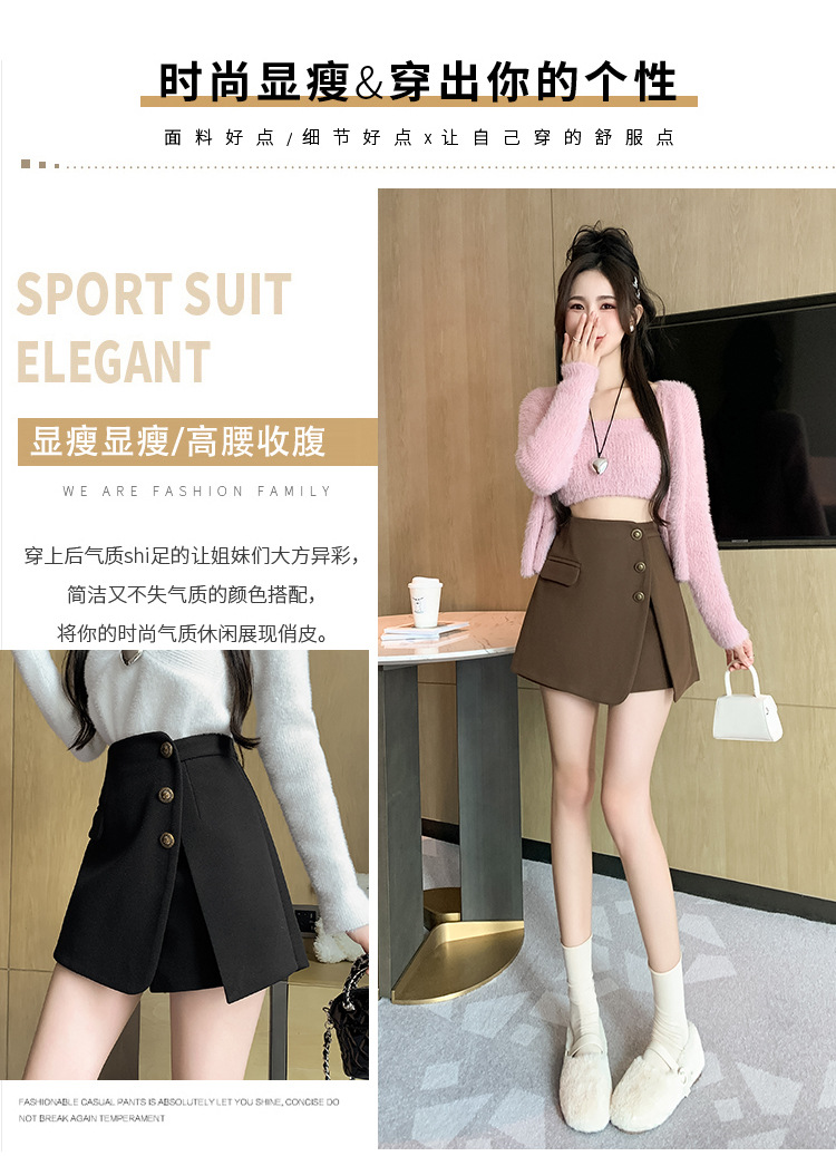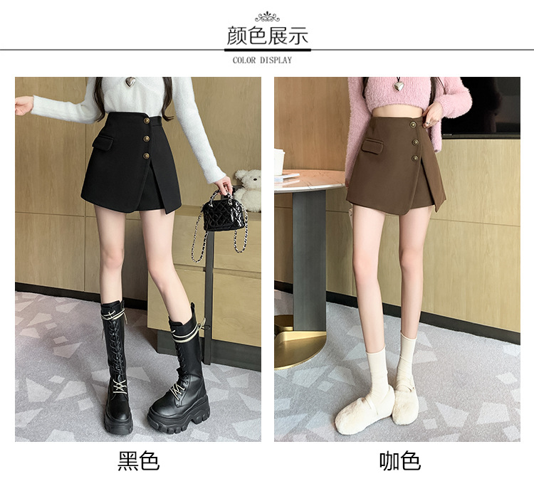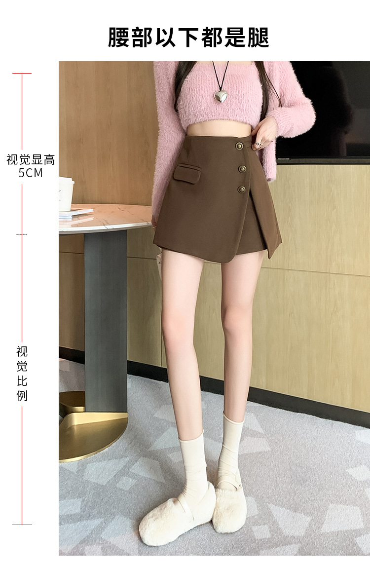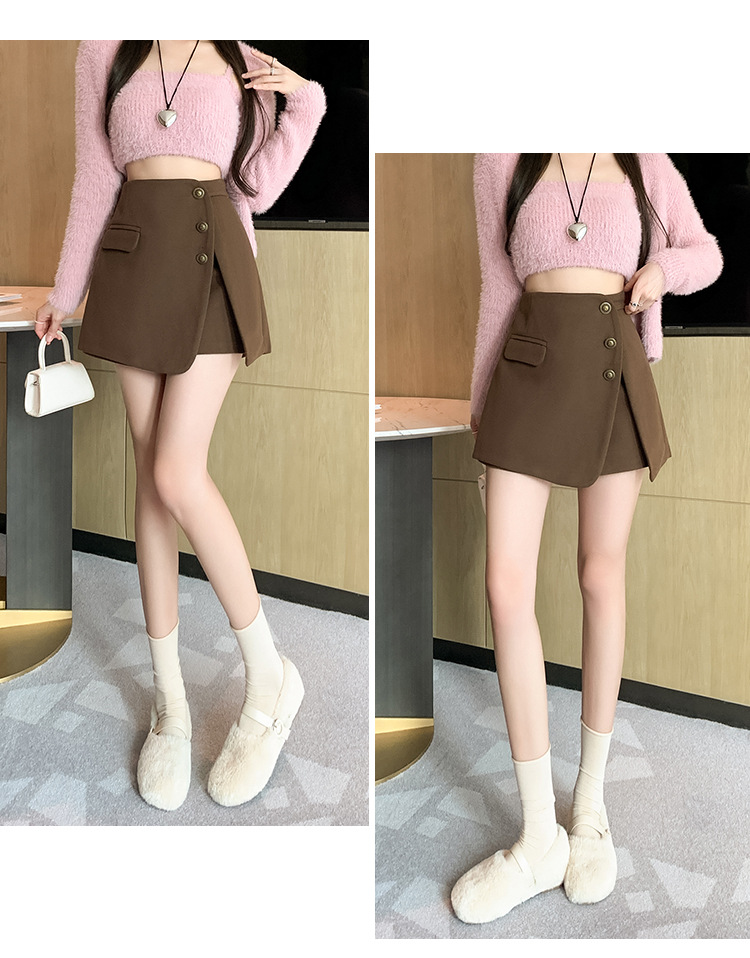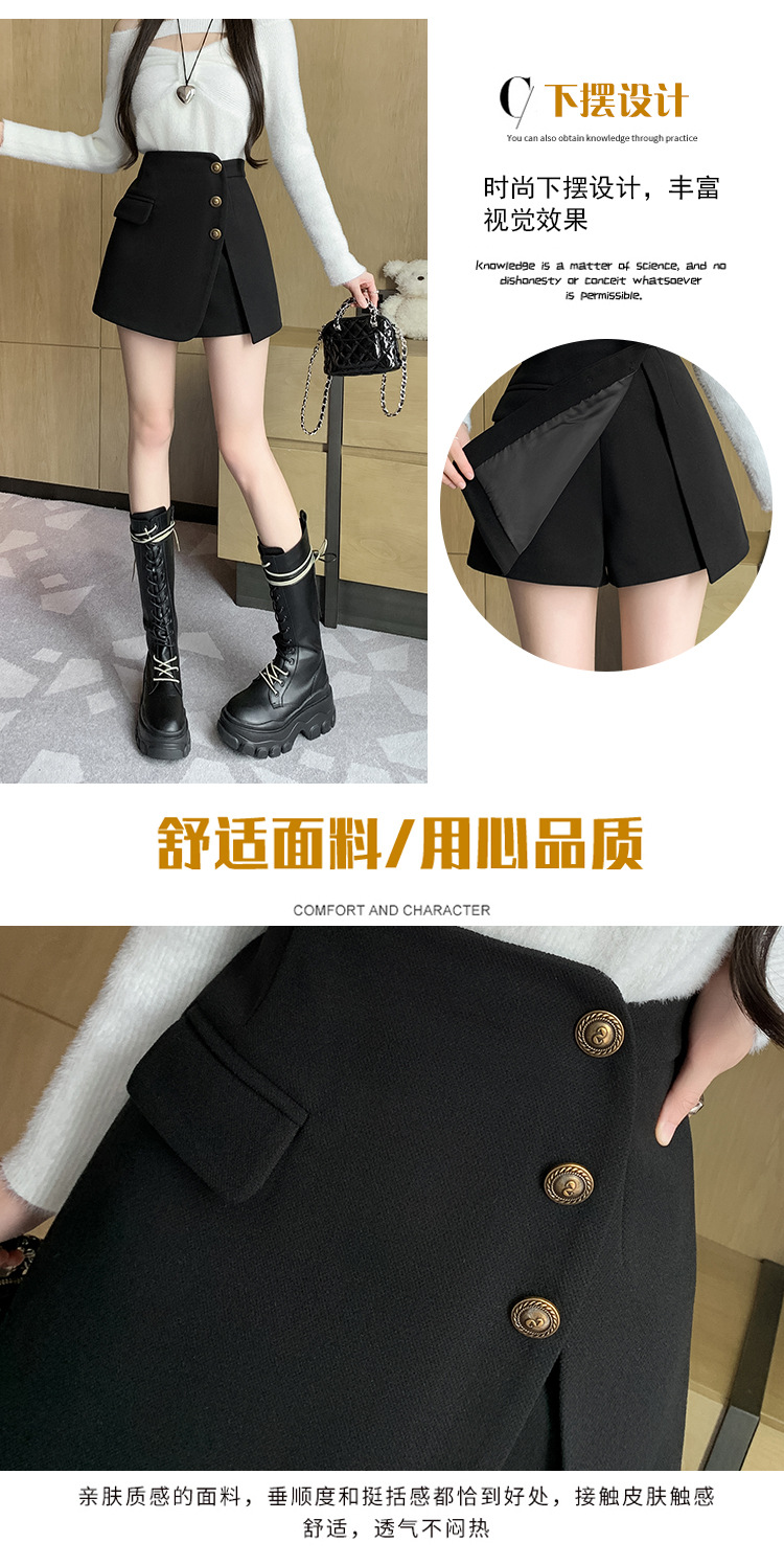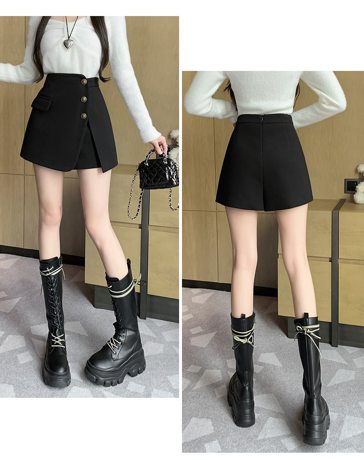 모직 반바지 여성용 2024 가을 겨울 신상 모직 A라인 스커트 팬츠 하이웨이스트 와이드 레그 부츠 팬츠 여성용 외출용 단추 장식 팬츠 스커트스토어 가기