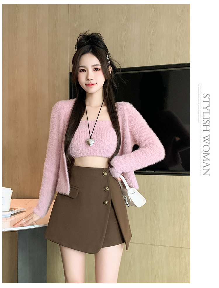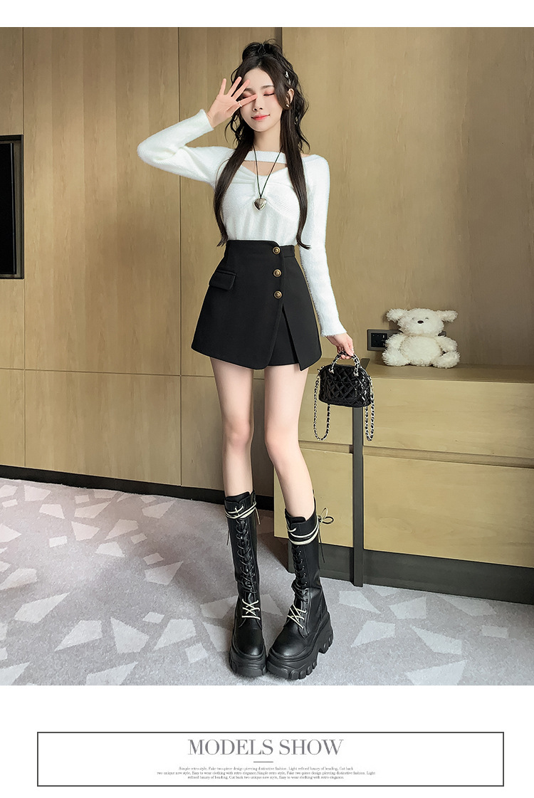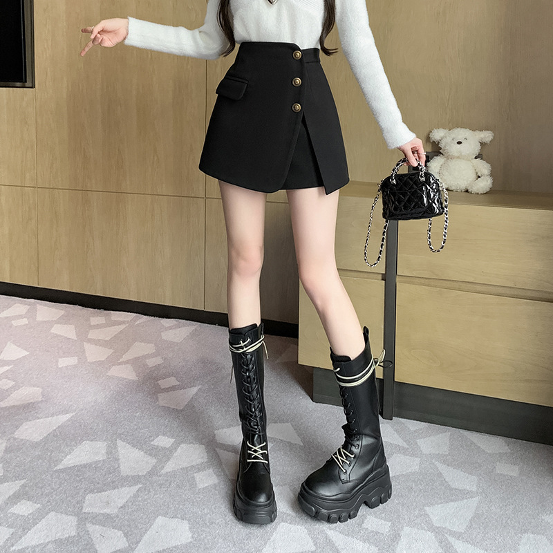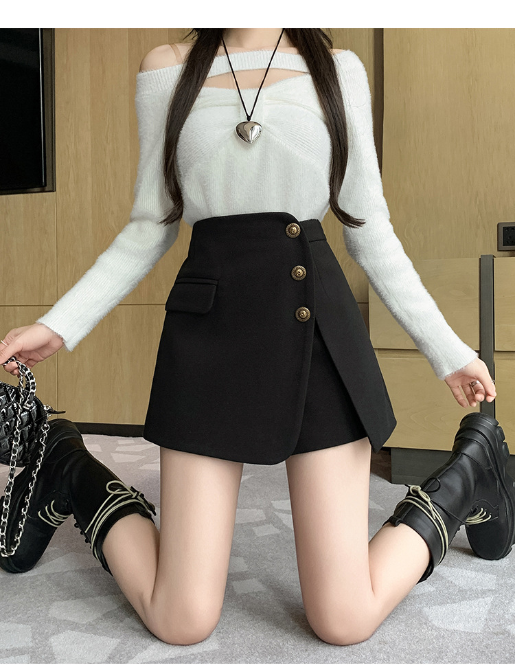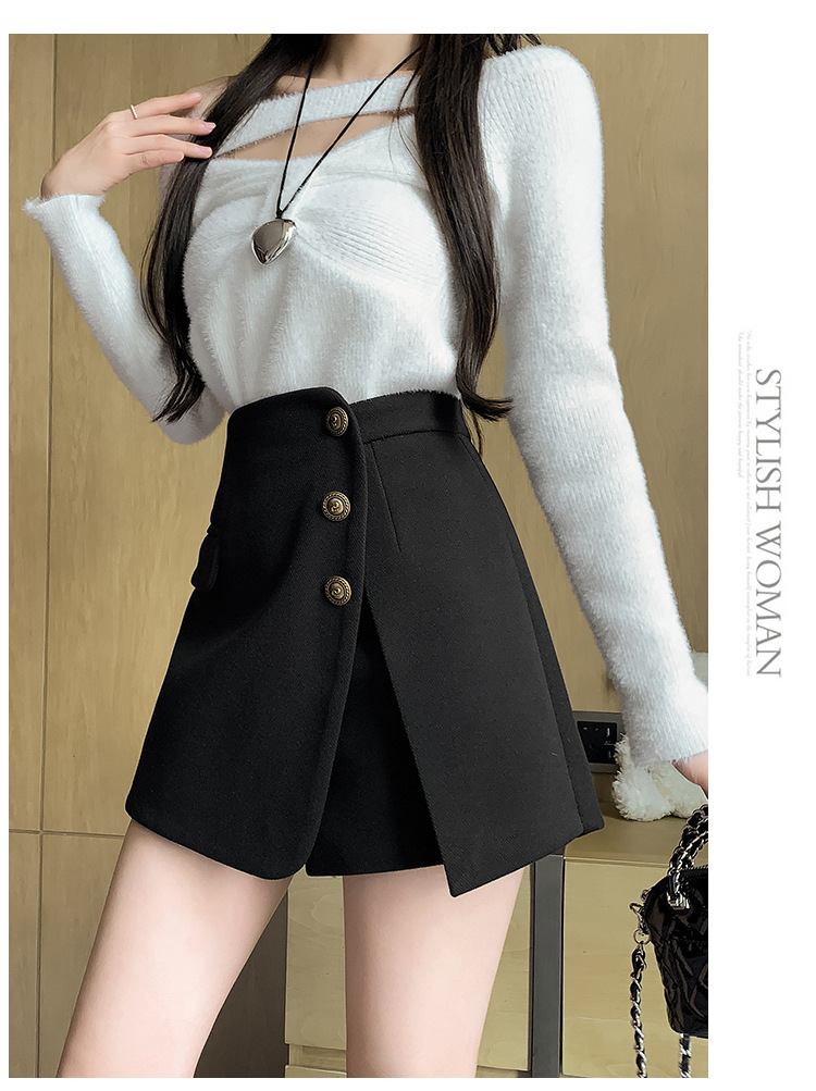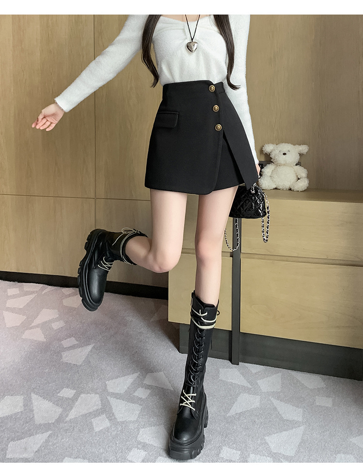모직 반바지 여성용 2024 가을 겨울 신상 모직 A라인 스커트 팬츠 하이웨이스트 와이드 레그 부츠 팬츠 여성용 외출용 단추 장식 팬츠 스커트