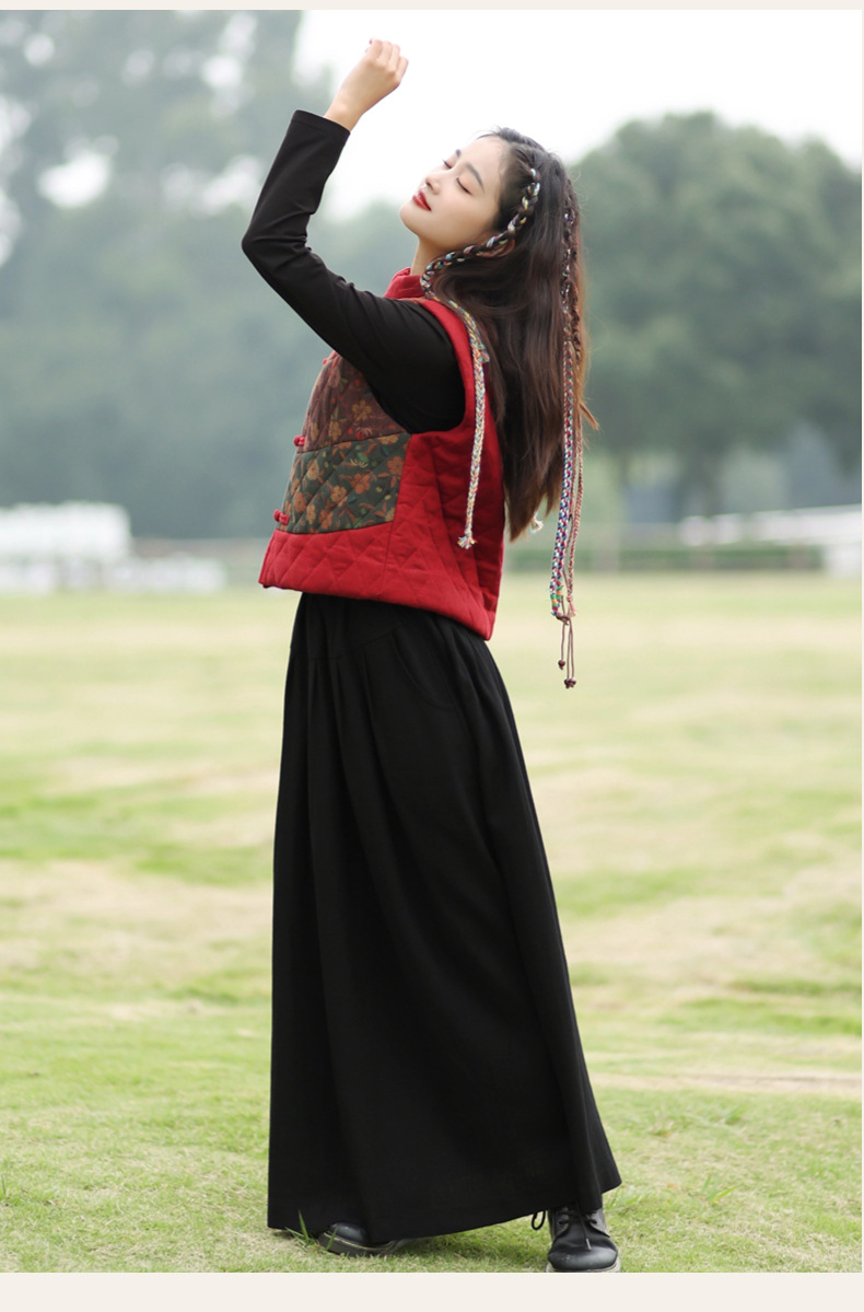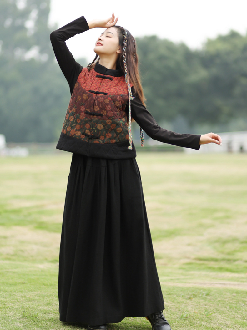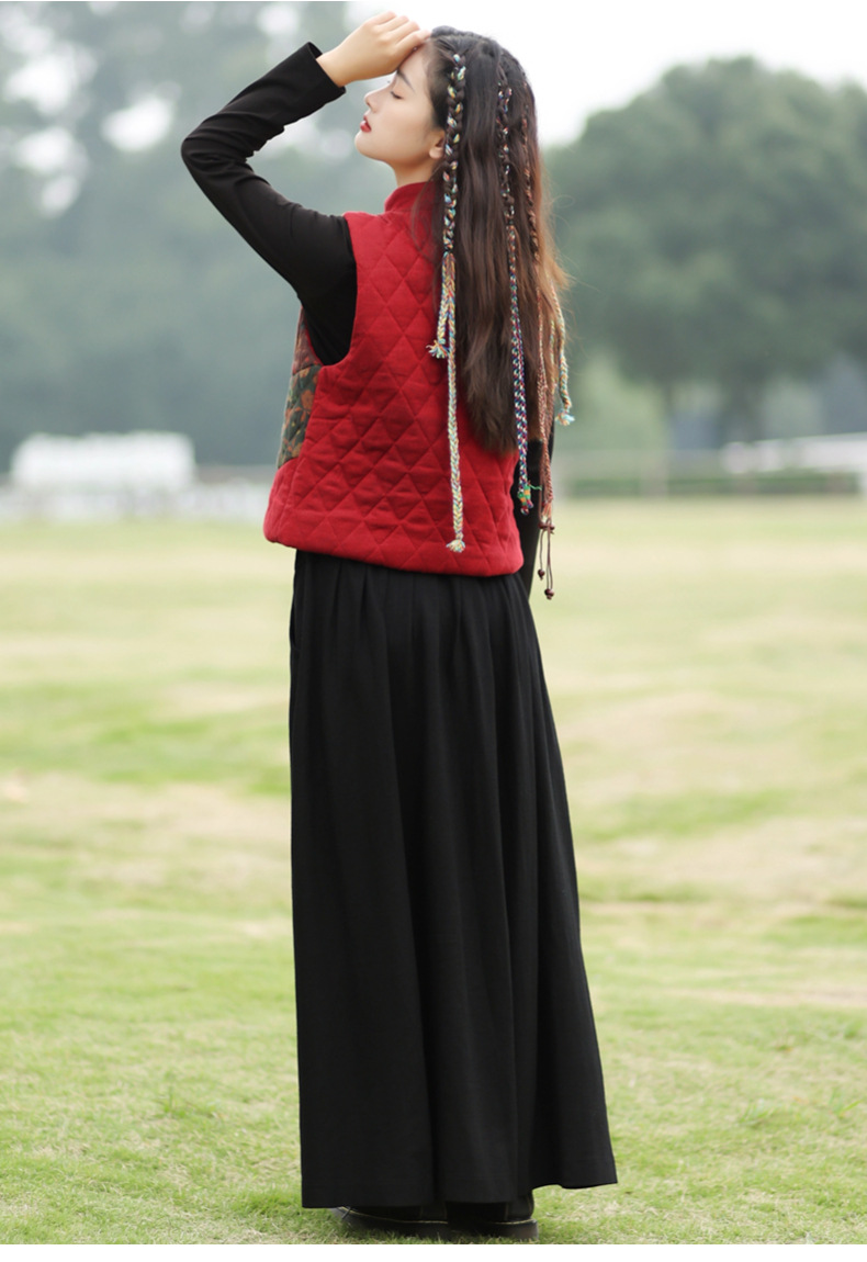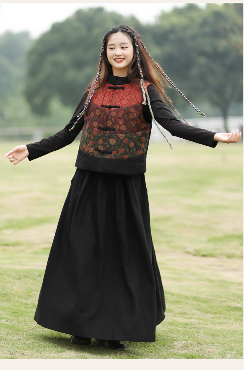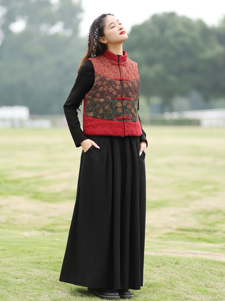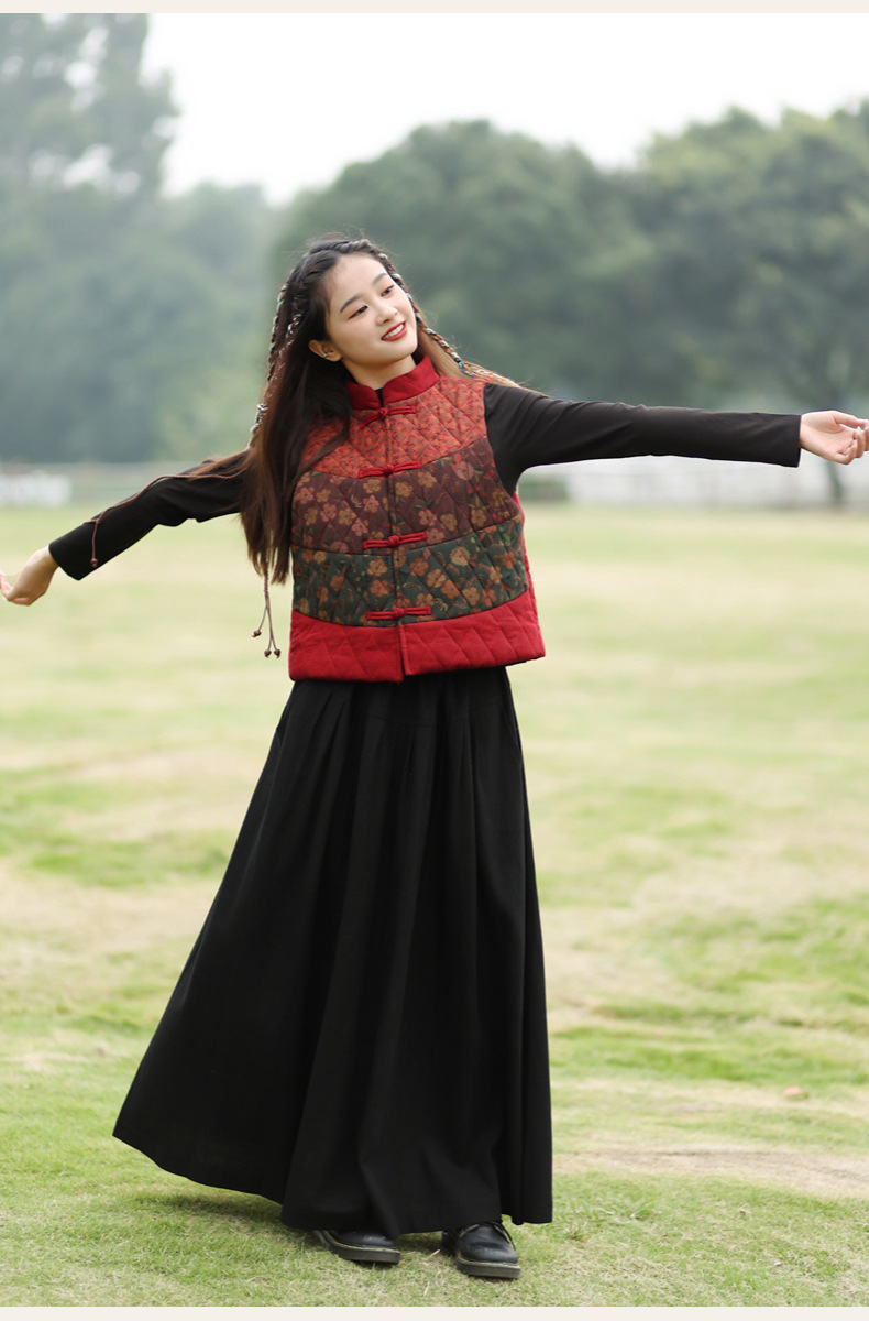 여성용 짧은 면 조끼 2025 가을 겨울 신상 중국풍 레트로 민족풍 배색 스티치 누빔 민소매 면 조끼