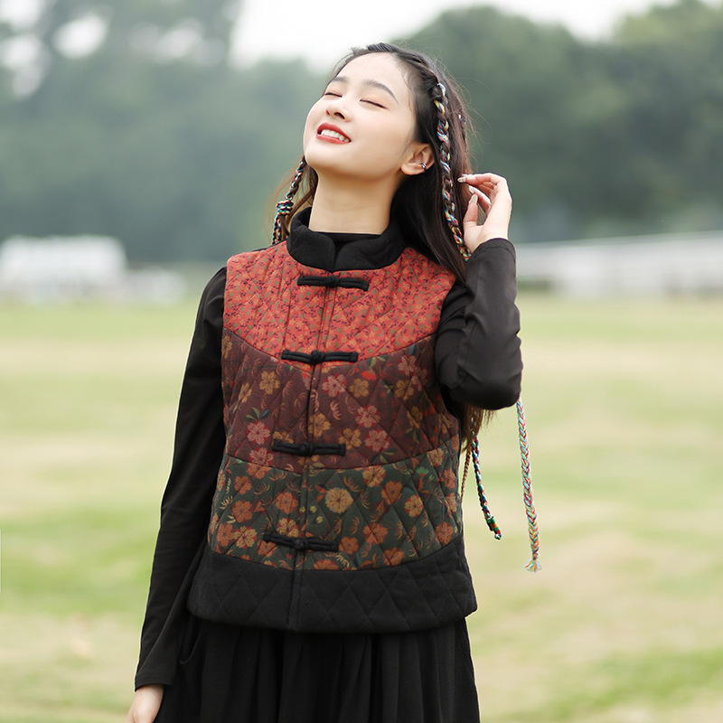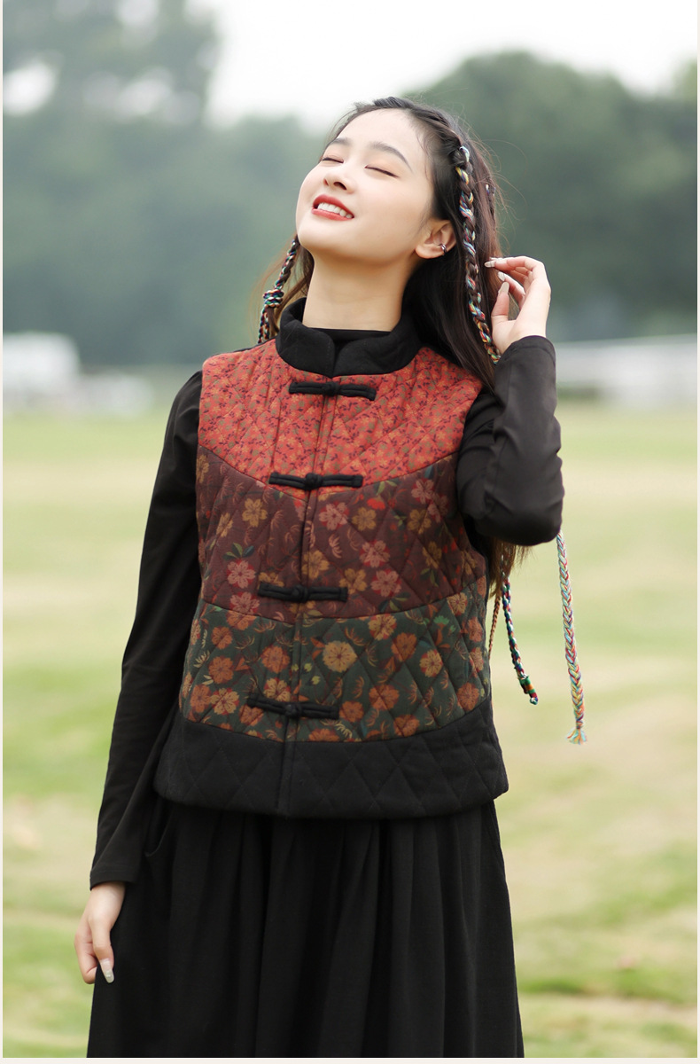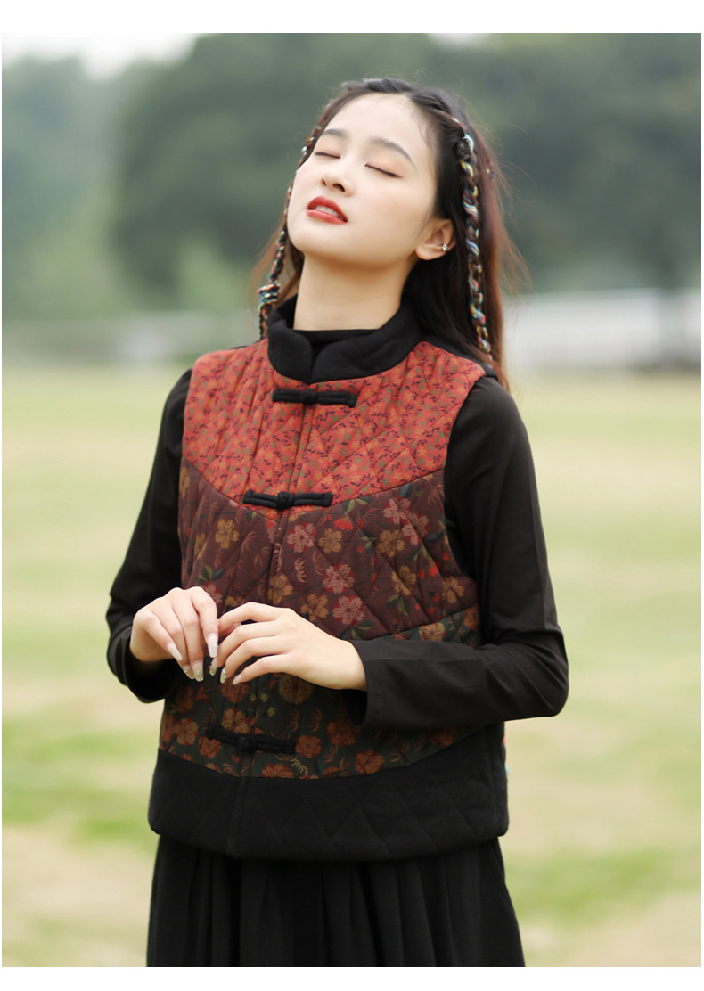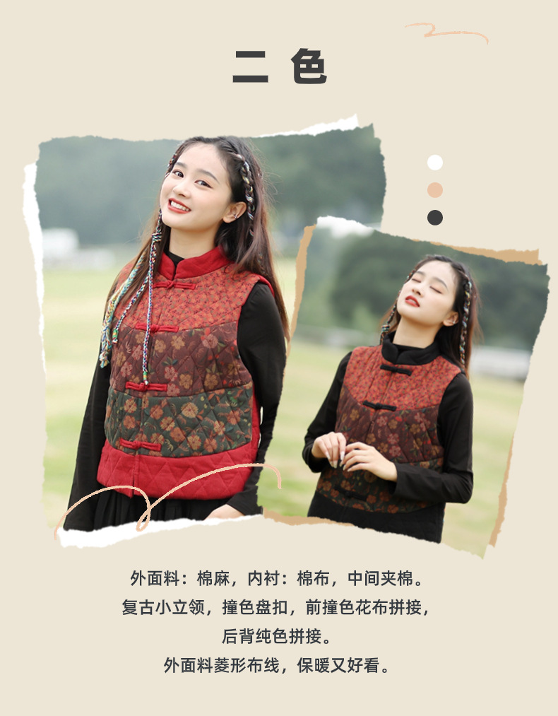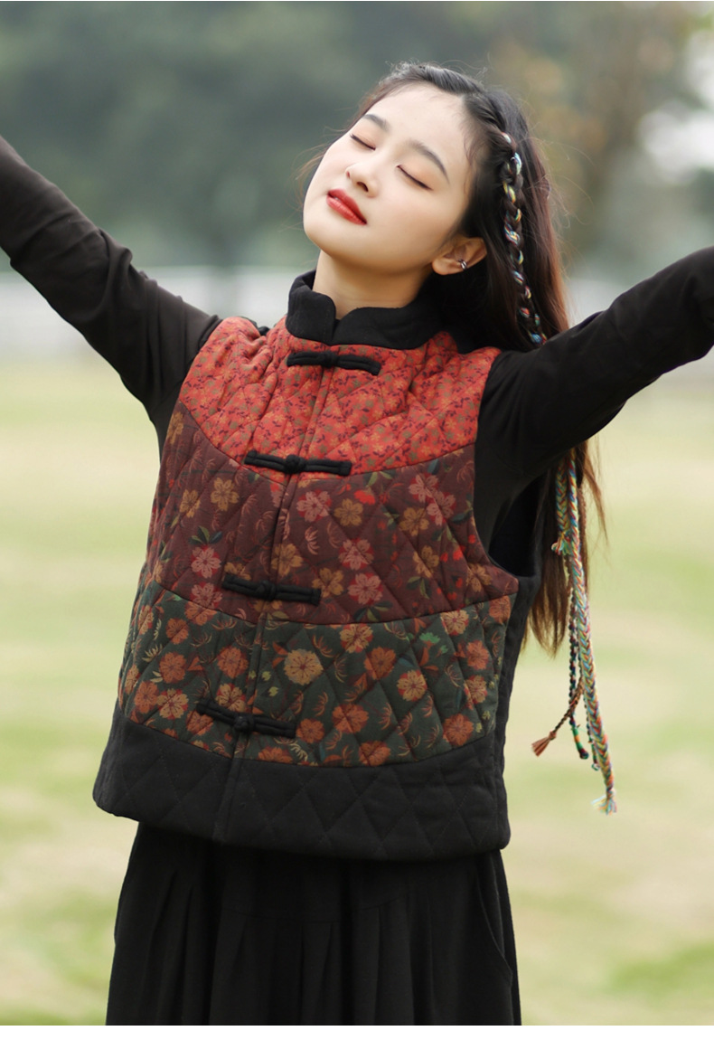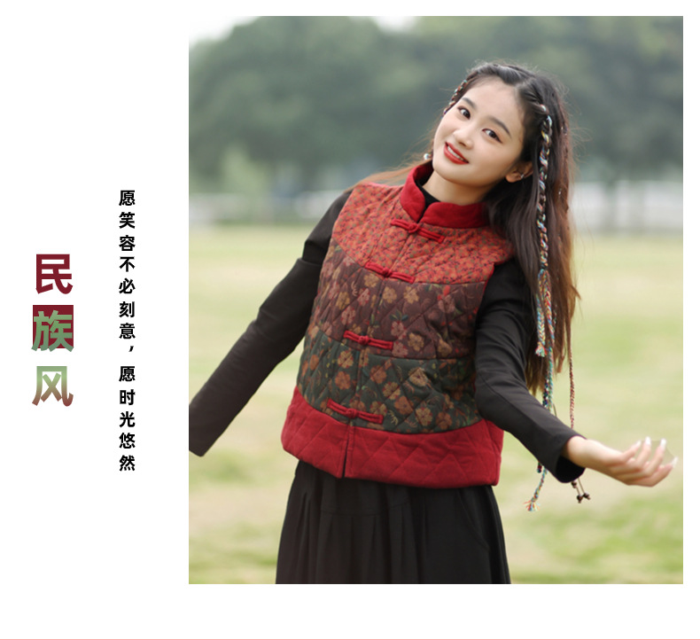 여성용 짧은 면 조끼 2025 가을 겨울 신상 중국풍 레트로 민족풍 배색 스티치 누빔 민소매 면 조끼스토어 가기