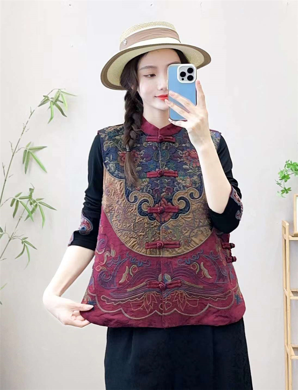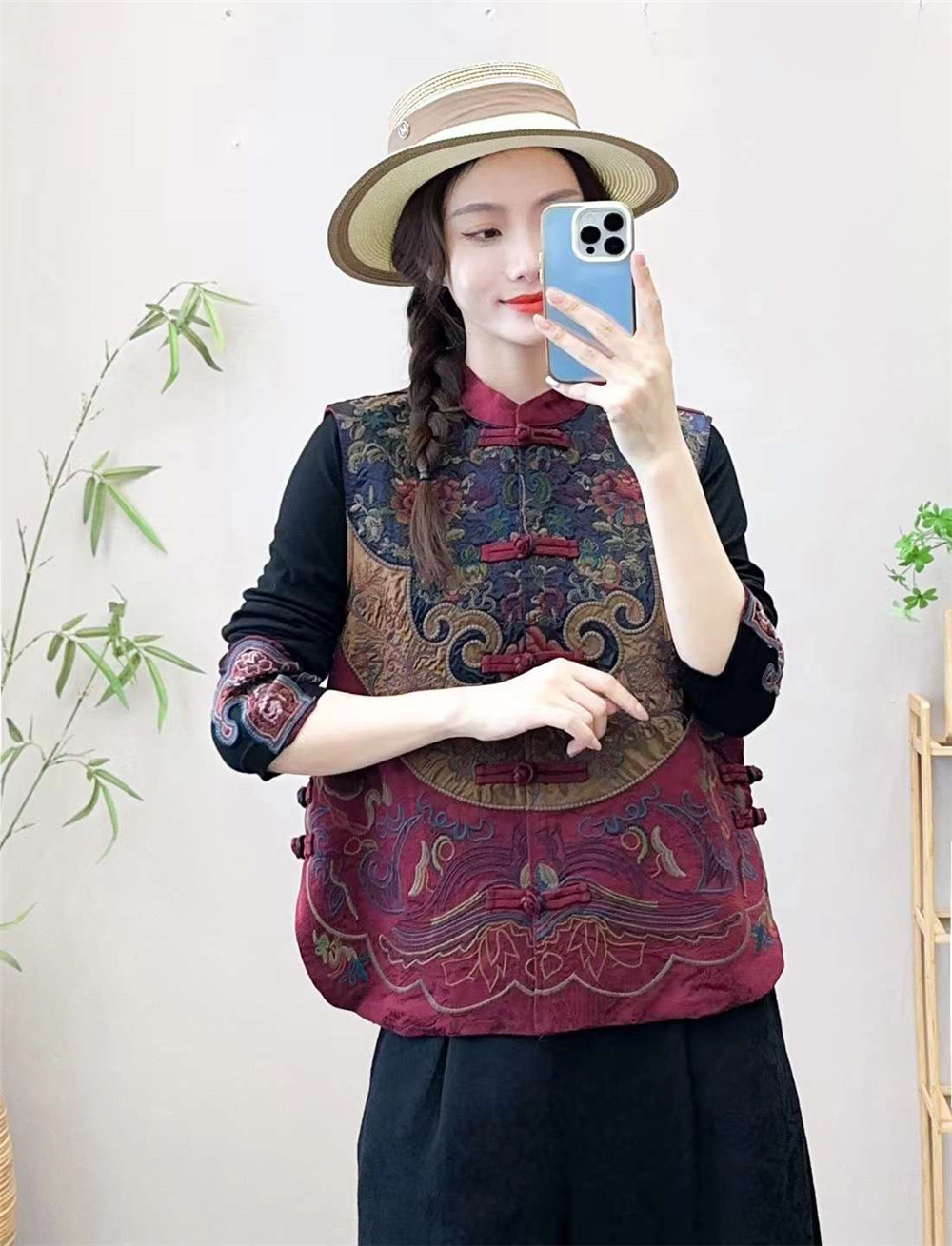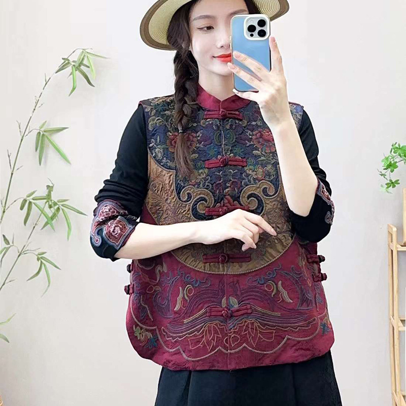 2025년 가을 새틴 자카드 민족풍 자수 스탠드 칼라 여성용 단추 장식 전통 조끼 도매스토어 가기