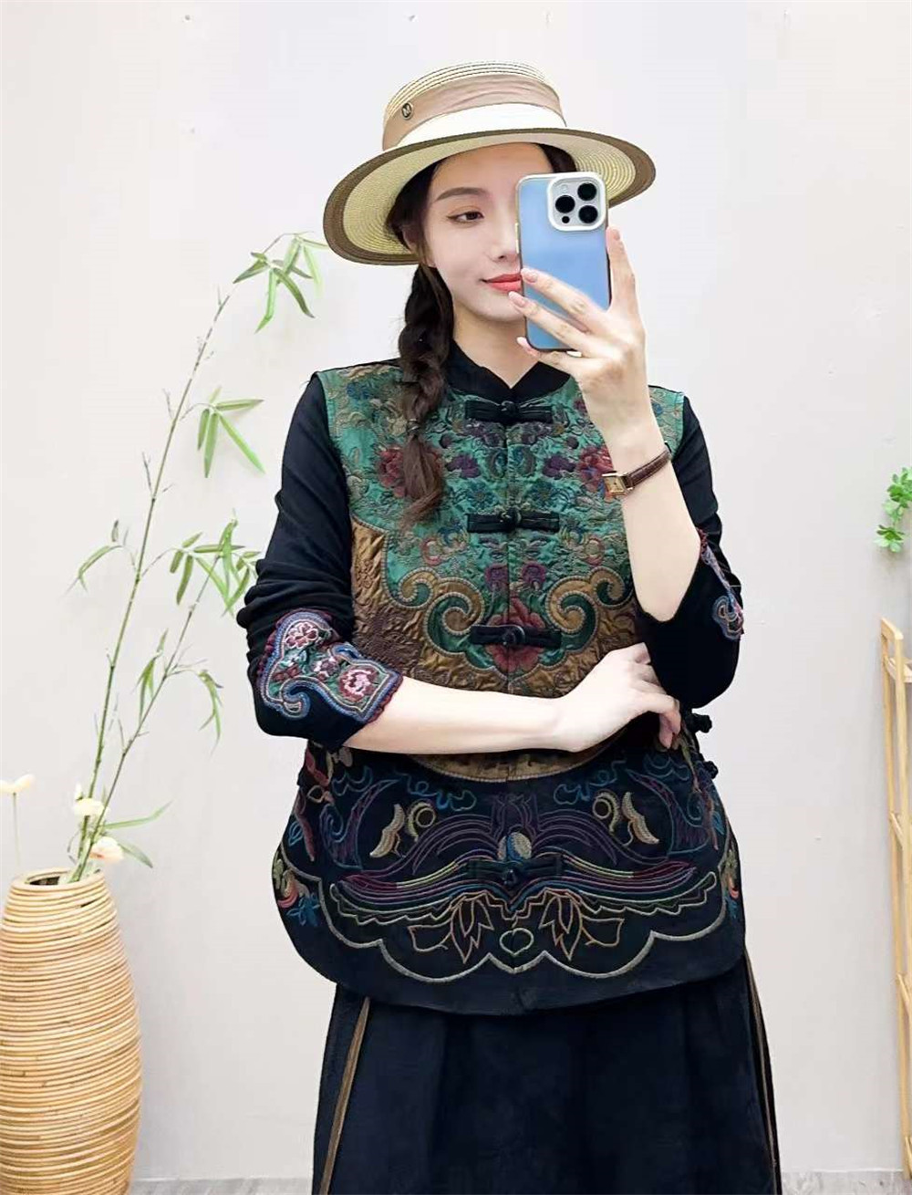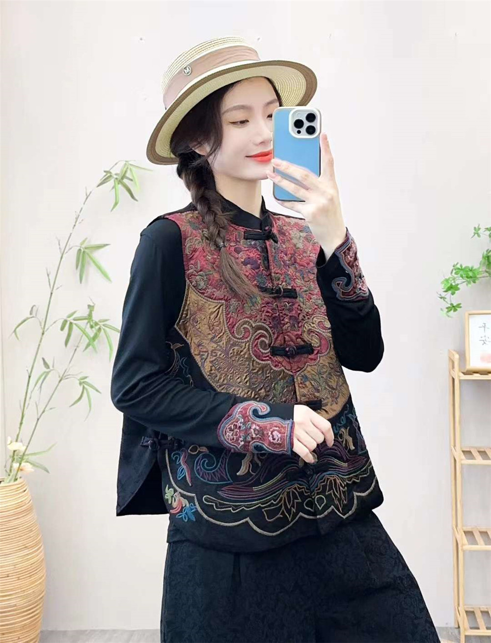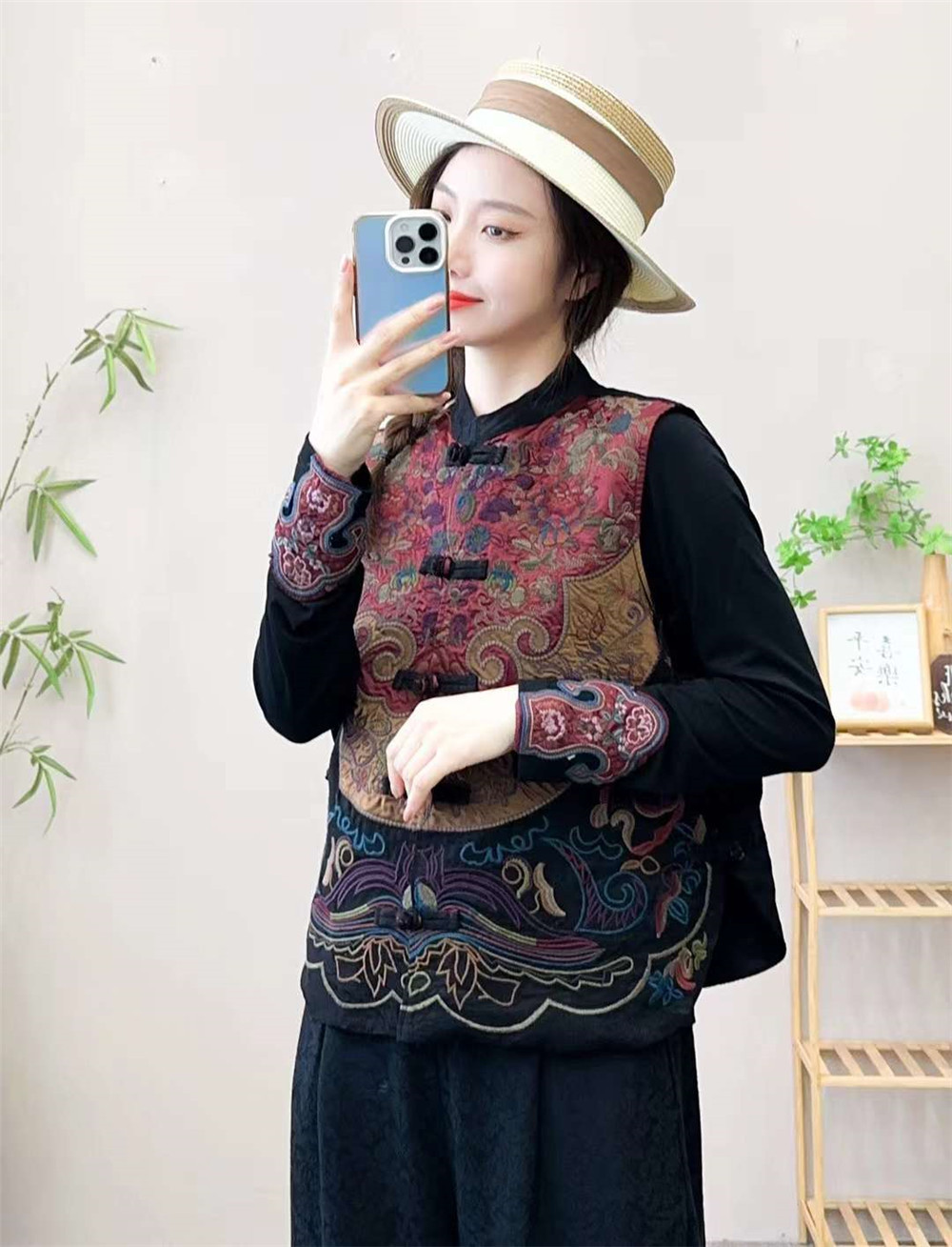 2025년 가을 새틴 자카드 민족풍 자수 스탠드 칼라 여성용 단추 장식 전통 조끼 도매스토어 가기