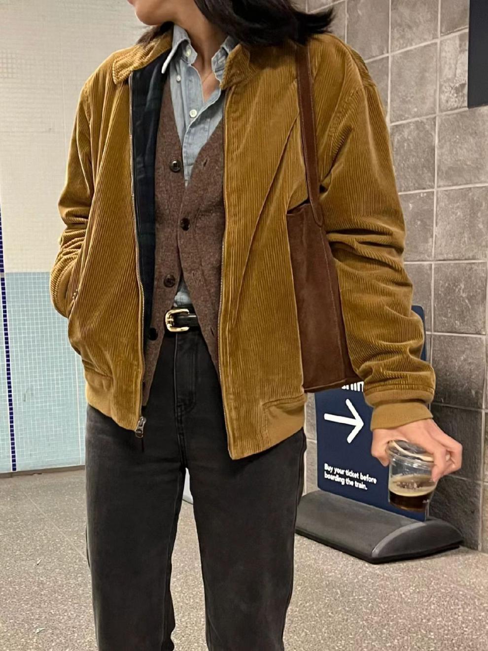 재고! 남성과 여성을위한 패션 페어 스타 자수 코듀로이 더블 레이어 재킷스토어 가기