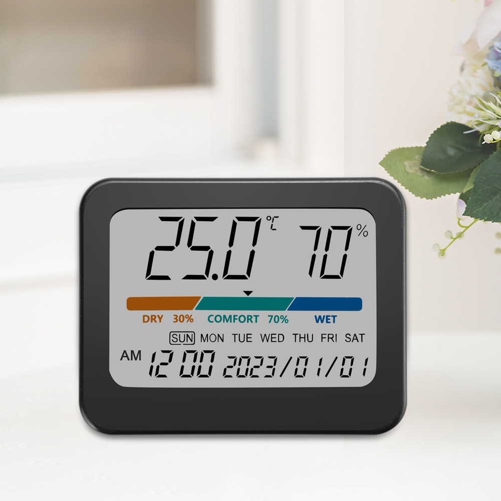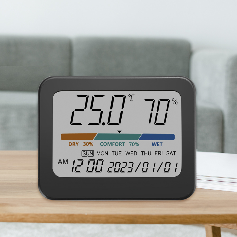 2、同屏显示温度、湿度、舒适度、时间、日期和星期,数字清晰,一目了然;
