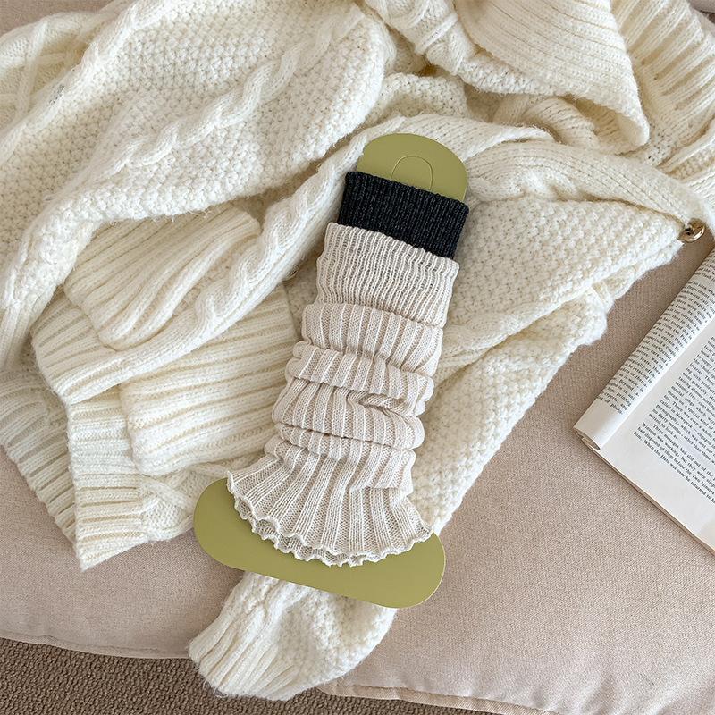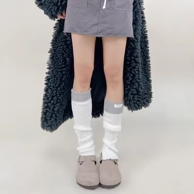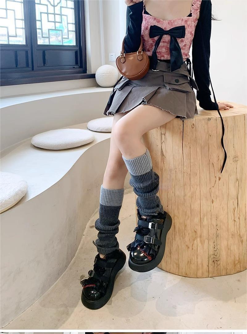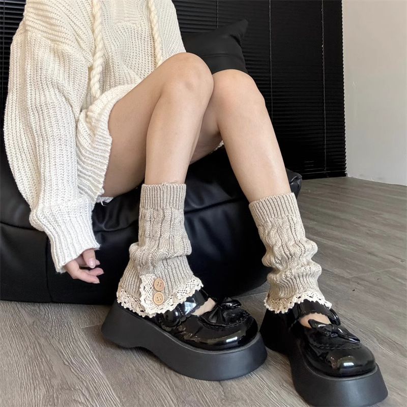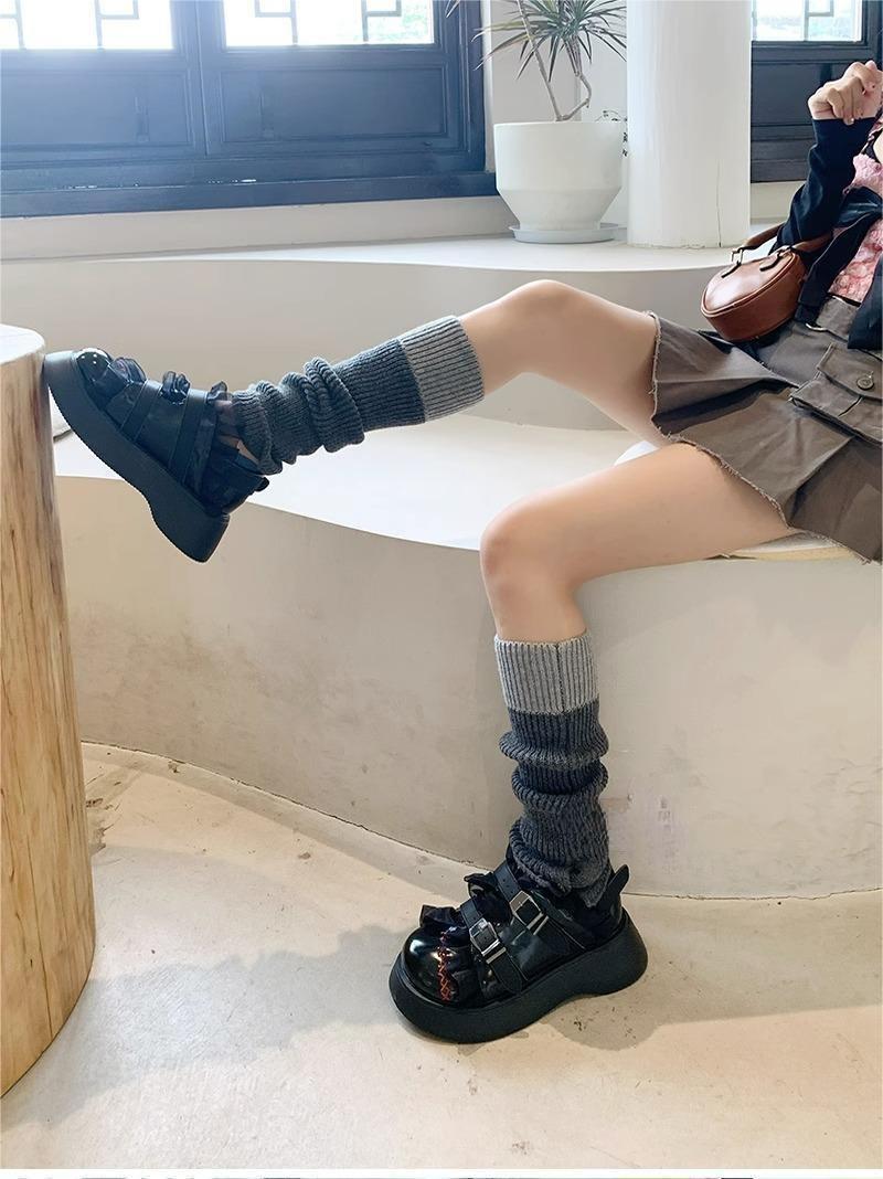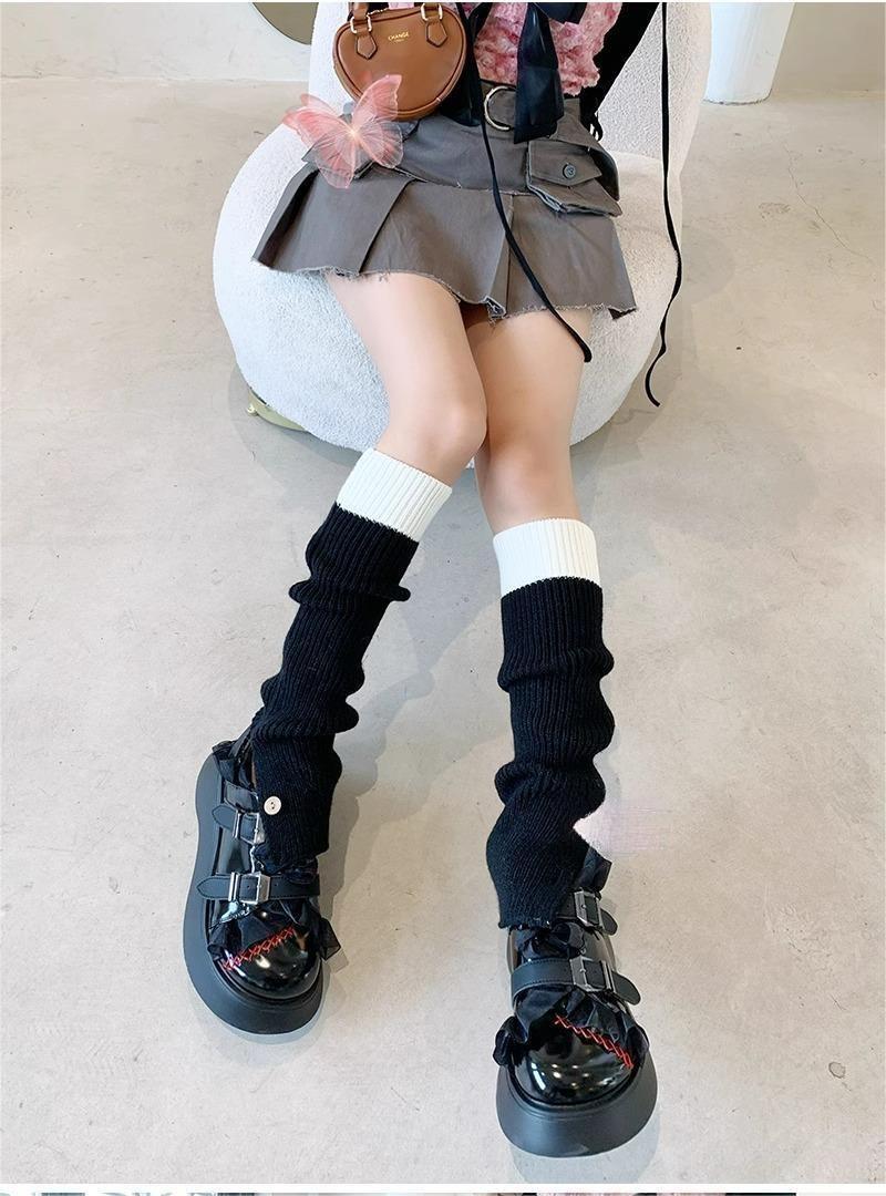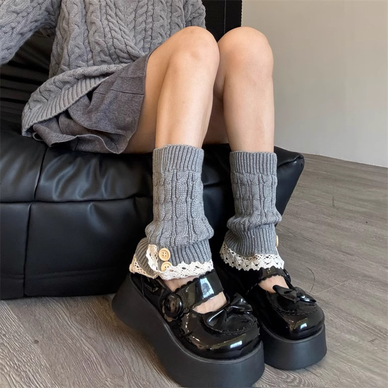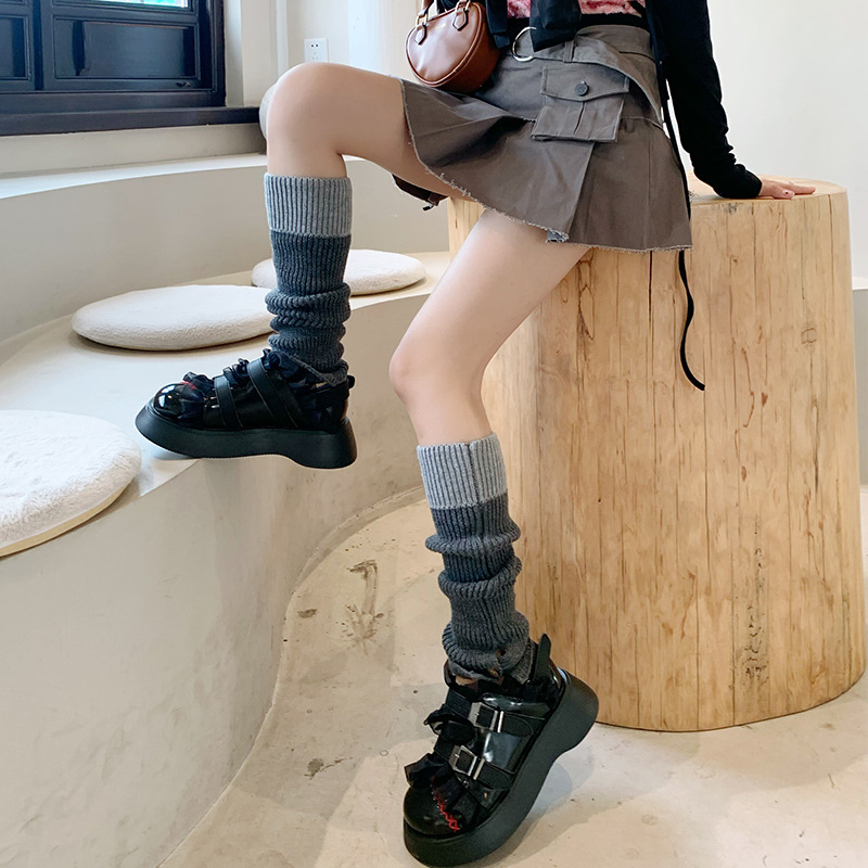 니트 스태킹 양말 여성의 가을과 겨울 일본식 JK 그레이 블랙 스티칭 버튼 양말 따뜻한 중간 길이 양말 대비 색상 분할 다리 커버