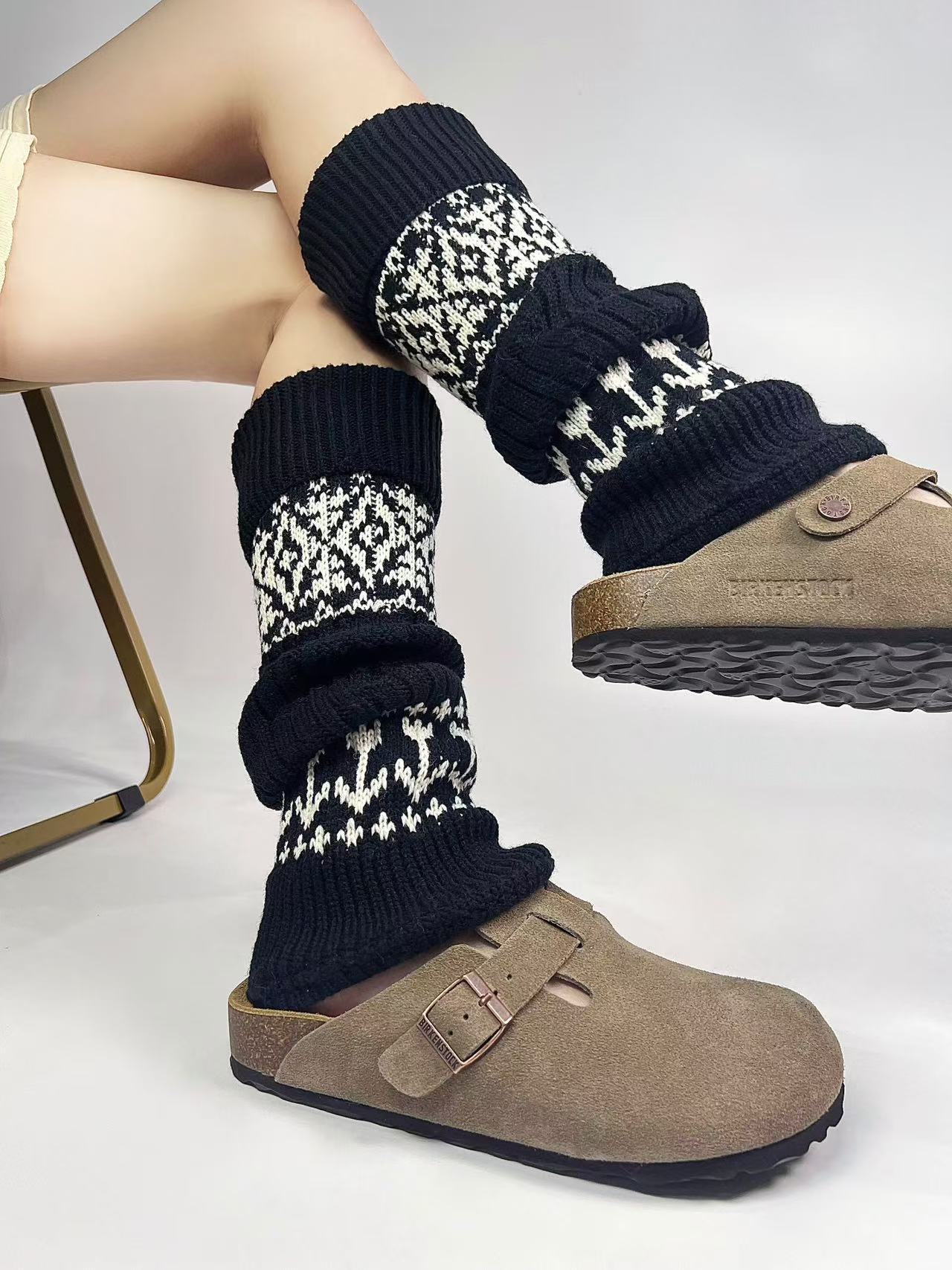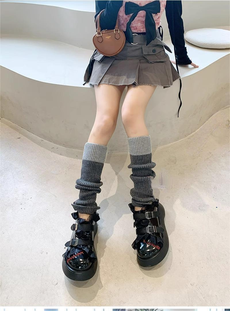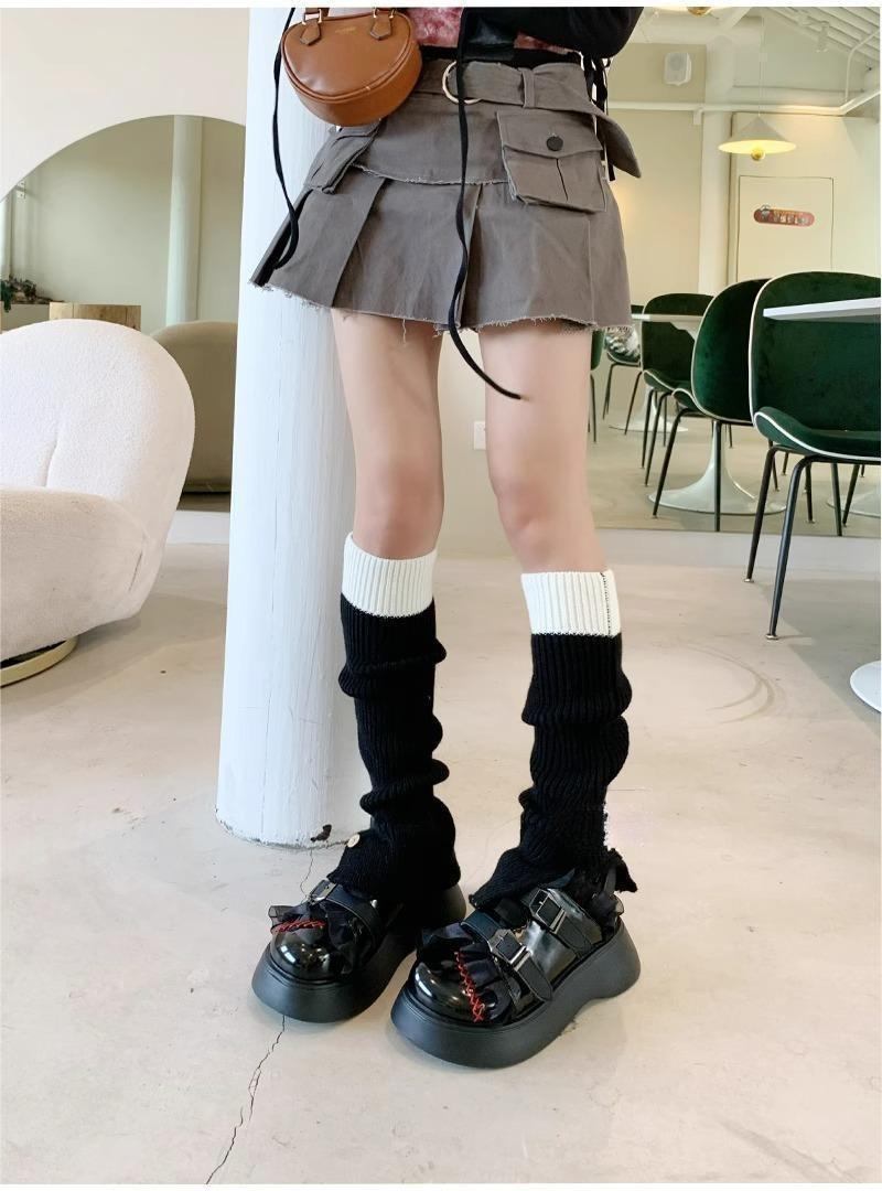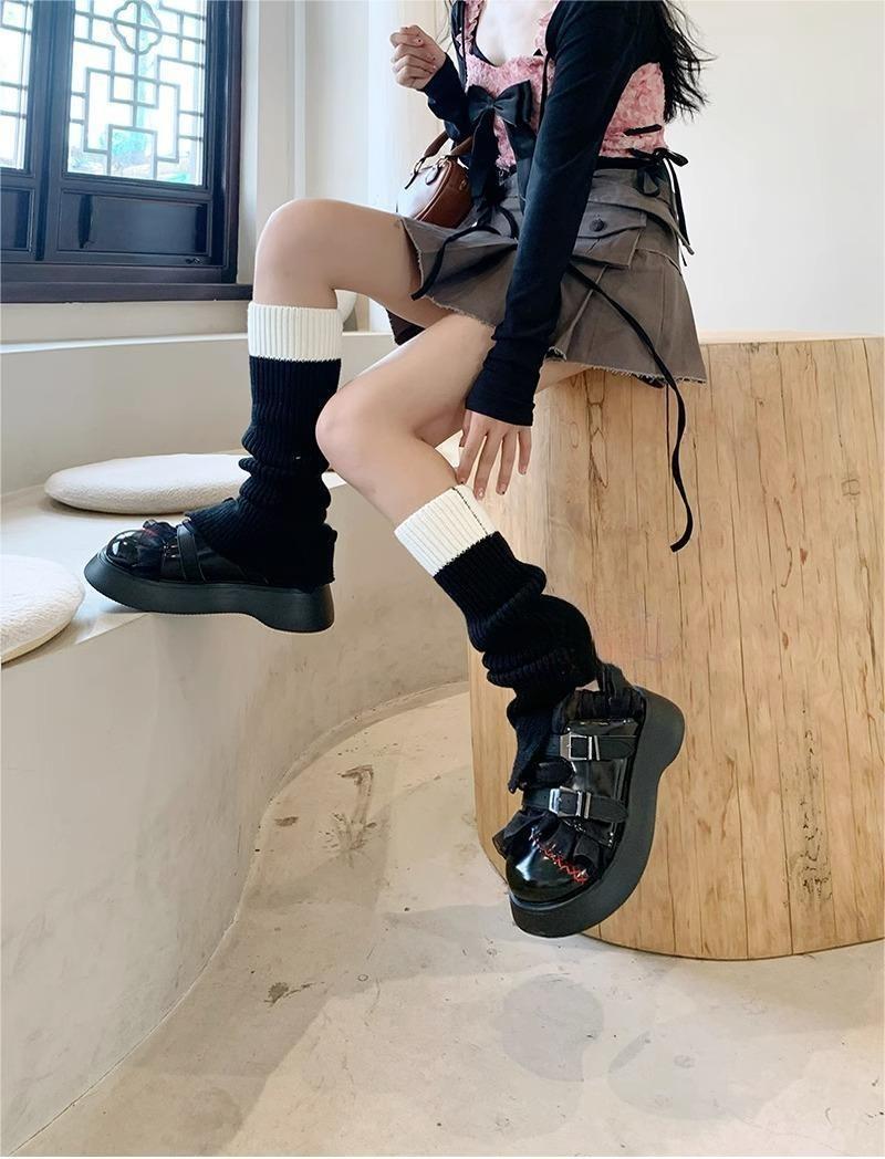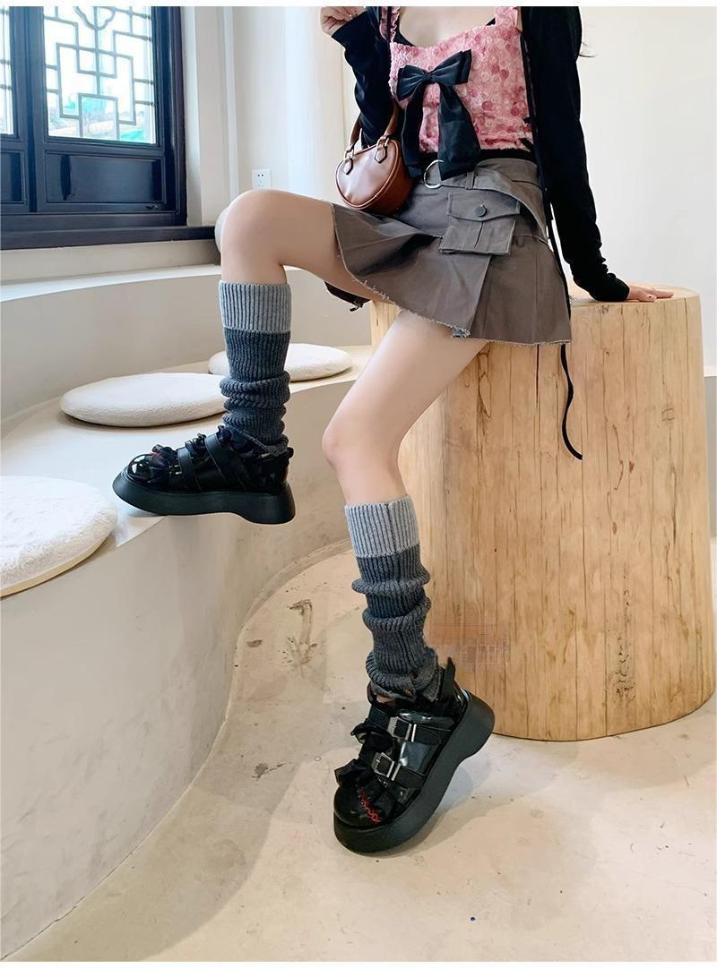 니트 스태킹 양말 여성의 가을과 겨울 일본식 JK 그레이 블랙 스티칭 버튼 양말 따뜻한 중간 길이 양말 대비 색상 분할 다리 커버