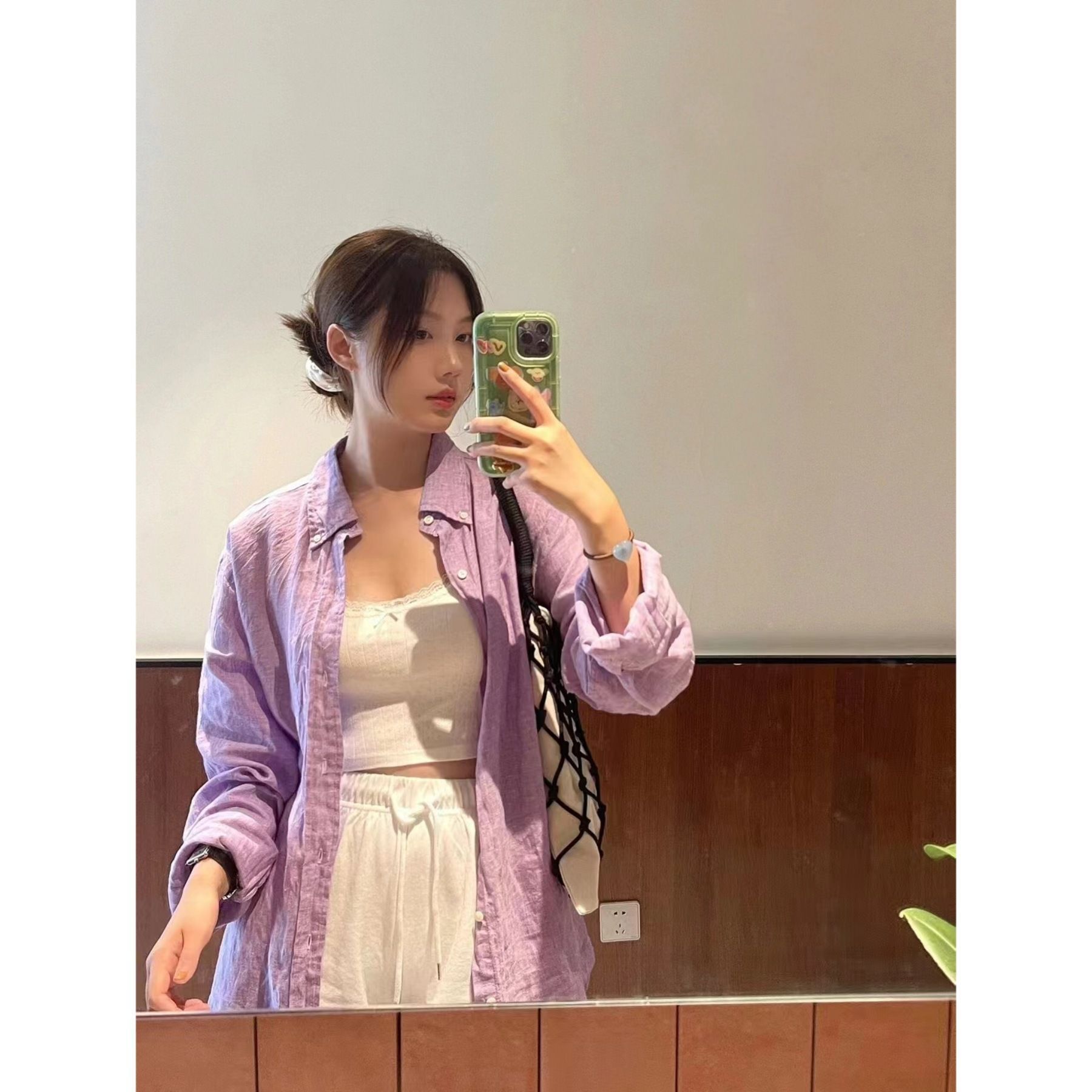 RL 클래식 포니 로고 라프 린넨 셔츠 여성용 긴팔 루즈 카디건 탑 여성용 통근 자외선 차단제 화이트 셔츠스토어 가기