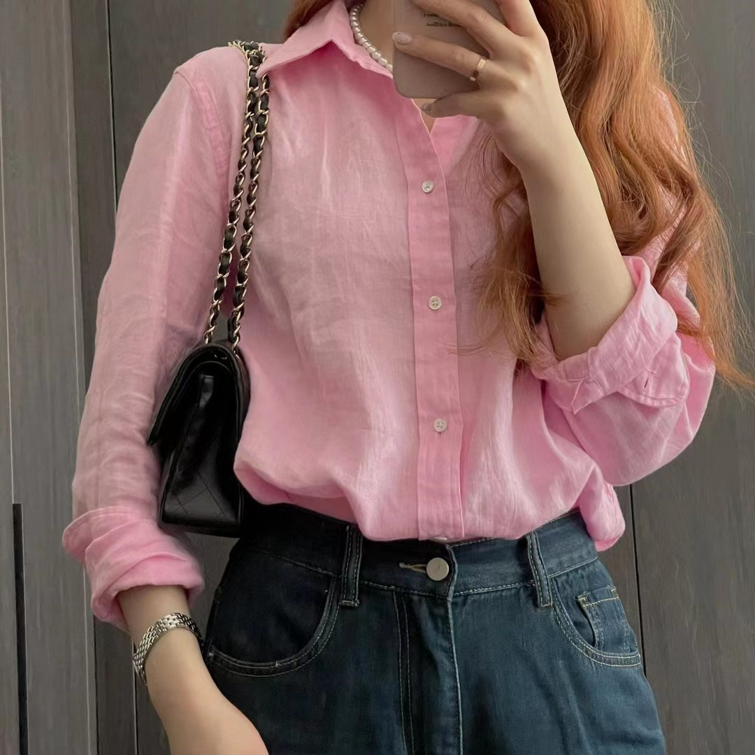 RL 클래식 포니 로고 라프 린넨 셔츠 여성용 긴팔 루즈 카디건 탑 여성용 통근 자외선 차단제 화이트 셔츠