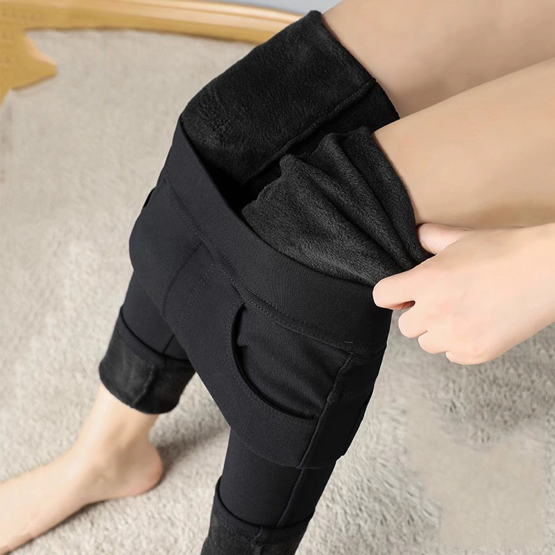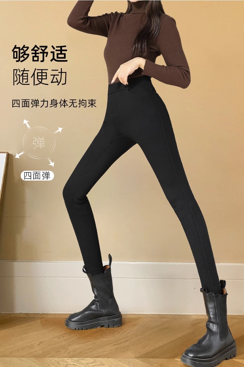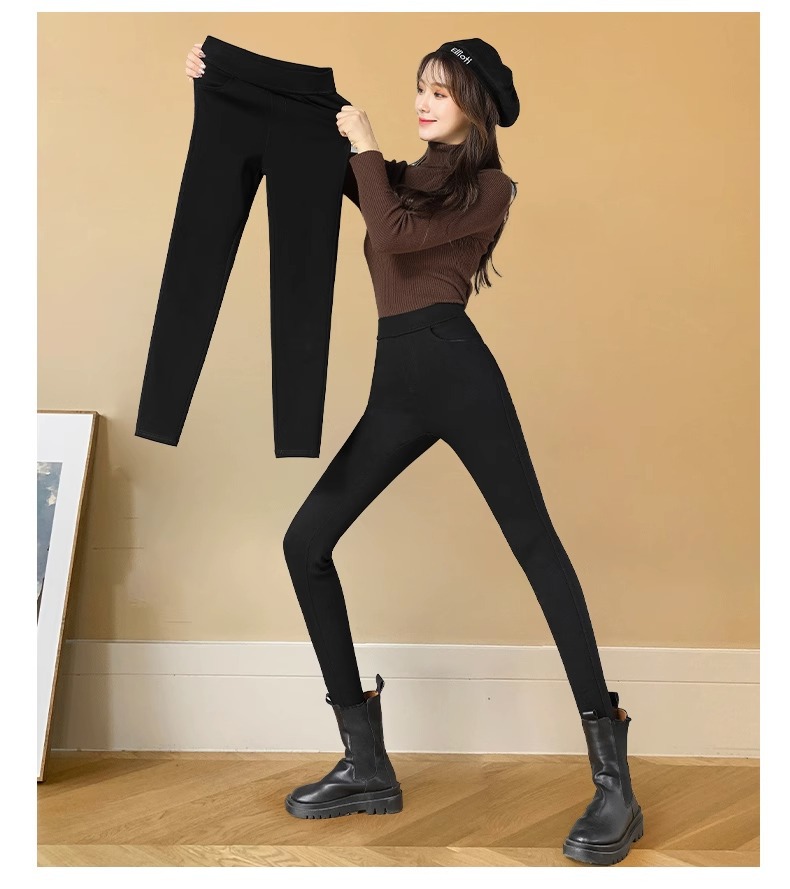 가을 겨울용 여성용 기모 데님 스타일 하이웨이스트 슬림핏 외출용 매직 블랙 팬츠, 두꺼운 펜슬 팬츠