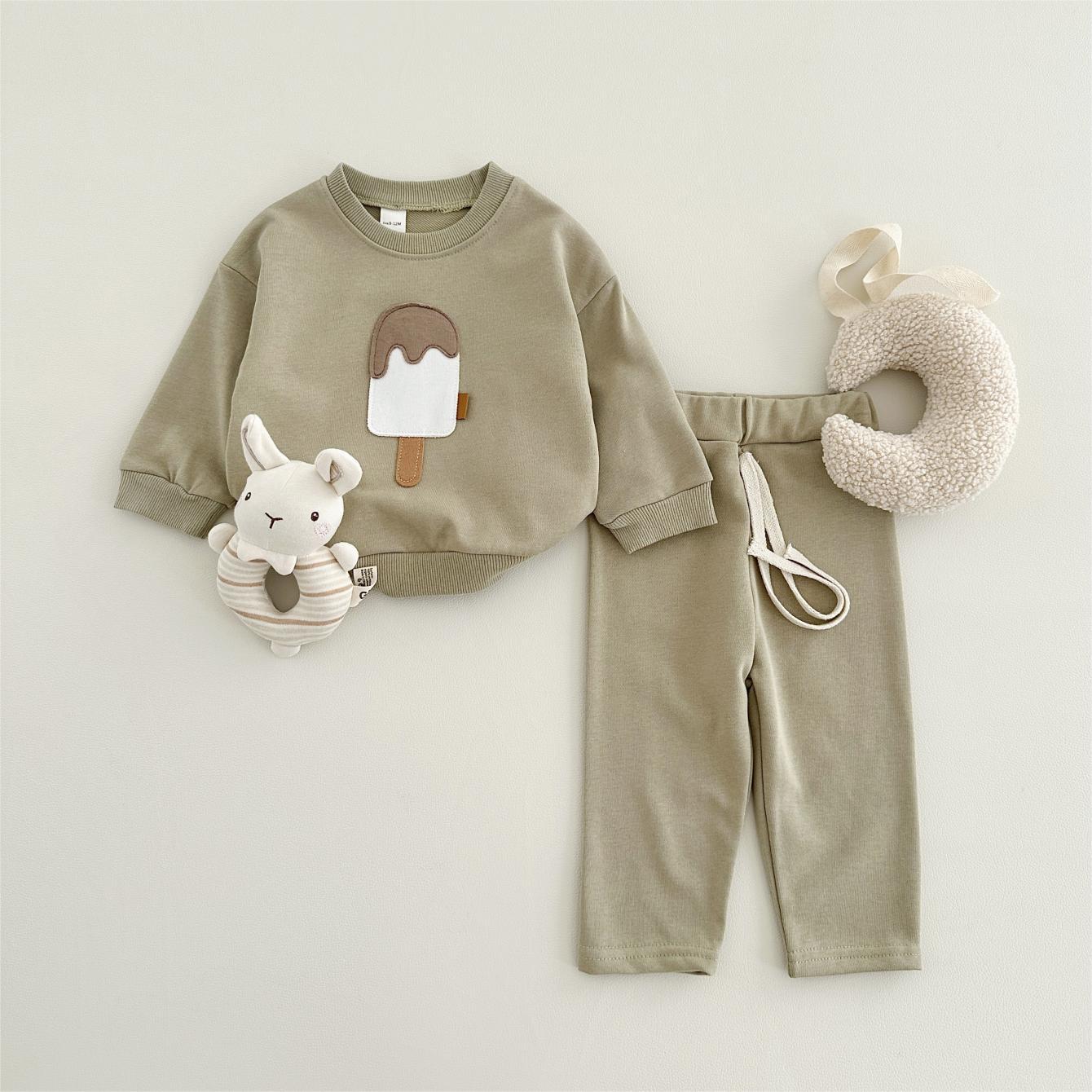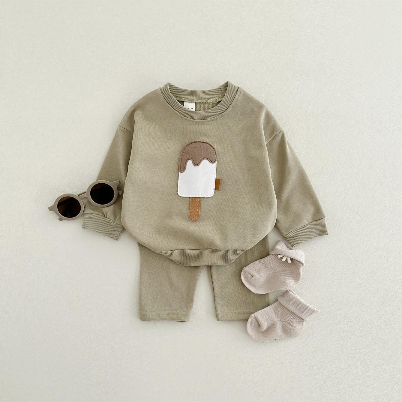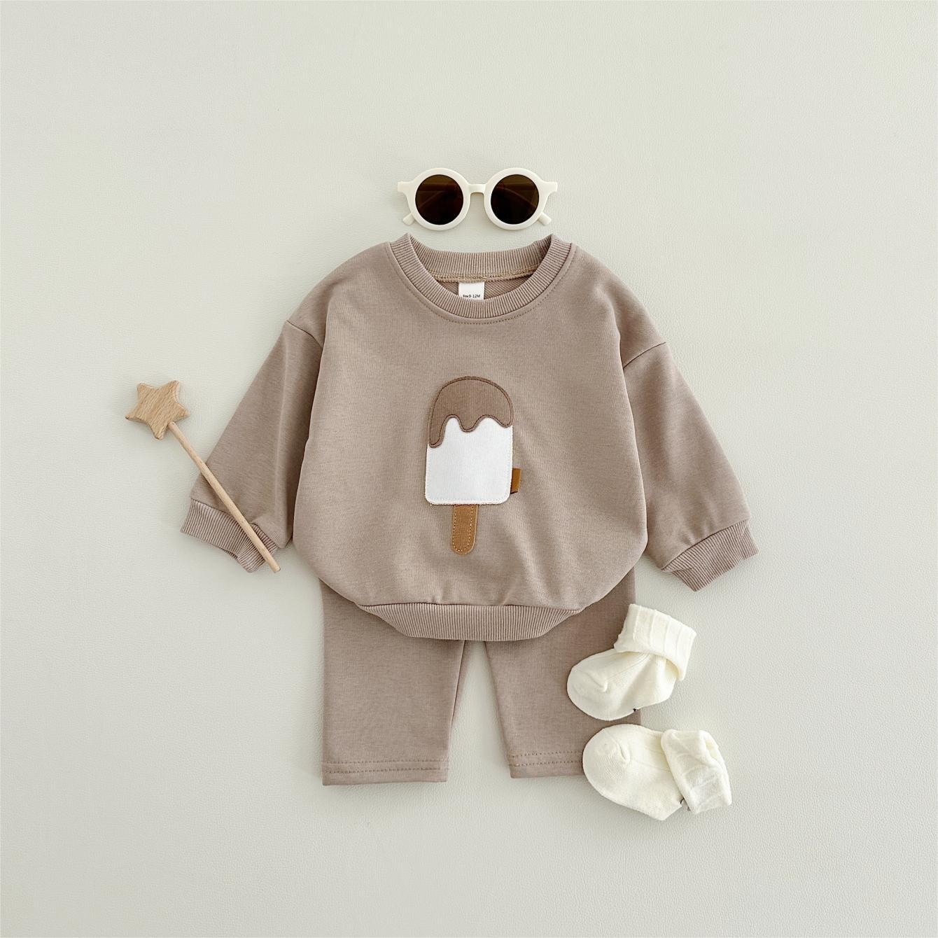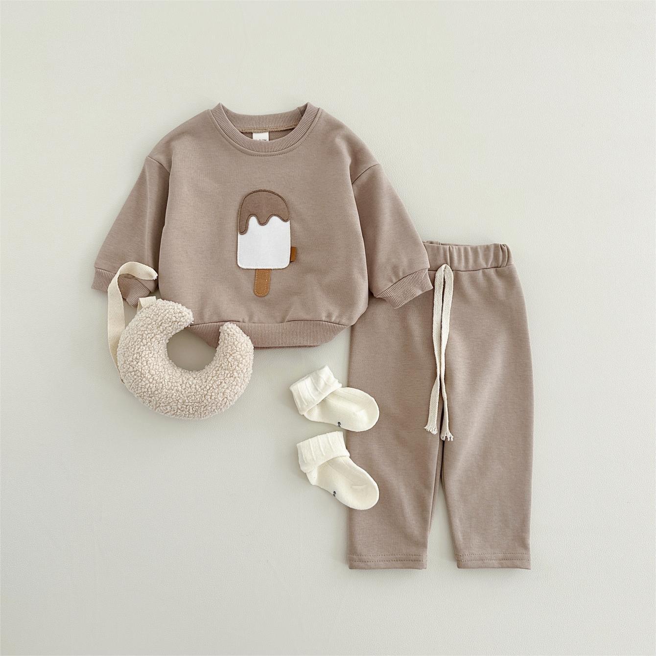 소년과 소녀를위한 투피스 세트 아기 귀여운 아이스크림 새로운 긴팔 바지 아기 세트 캐주얼 스포츠웨어 가을과 겨울스토어 가기