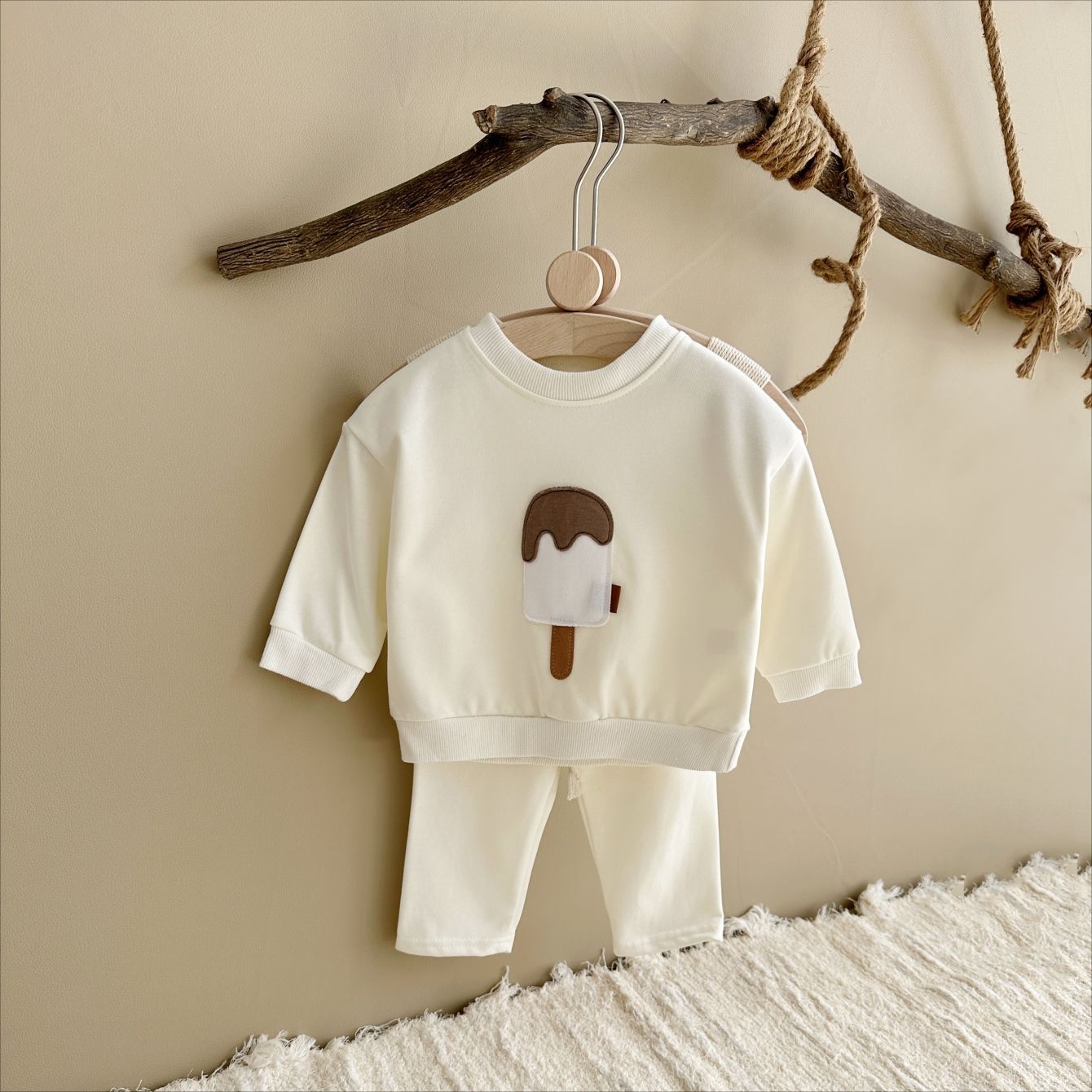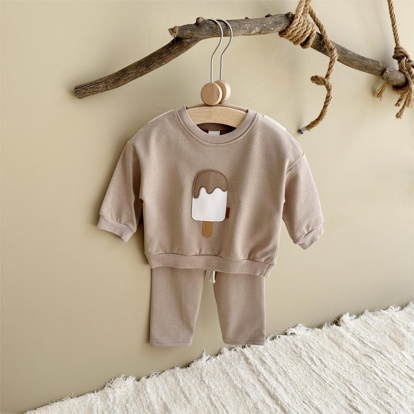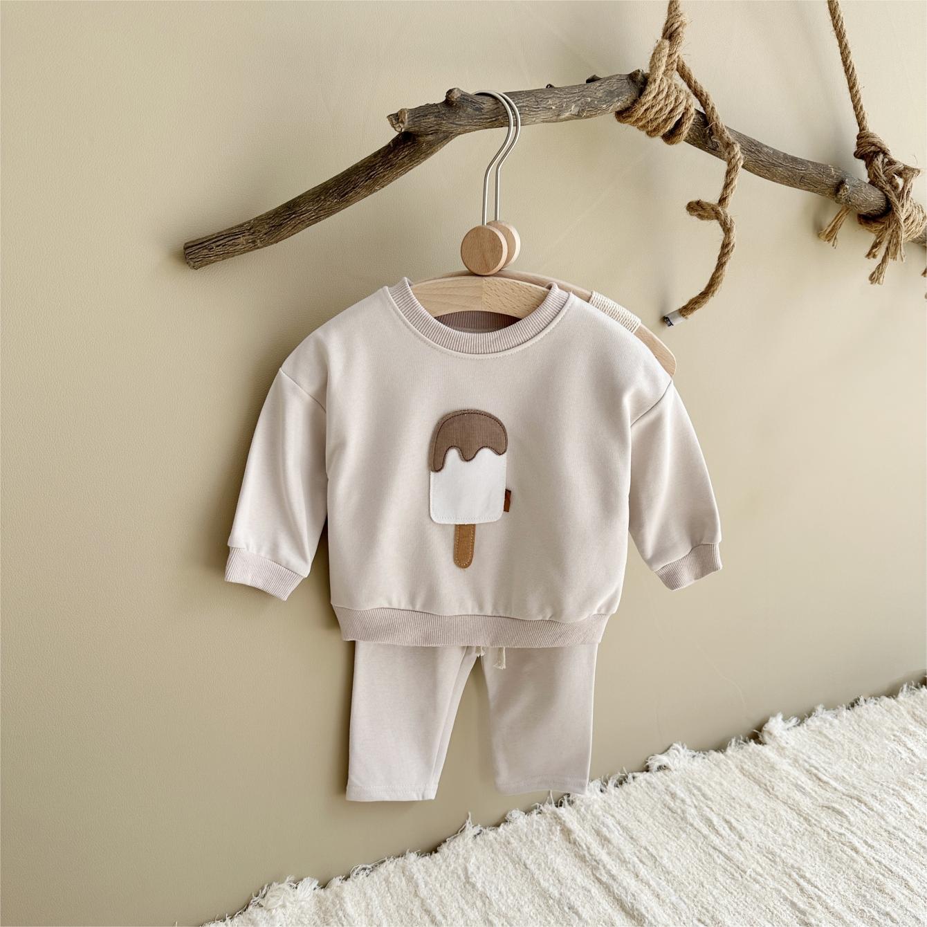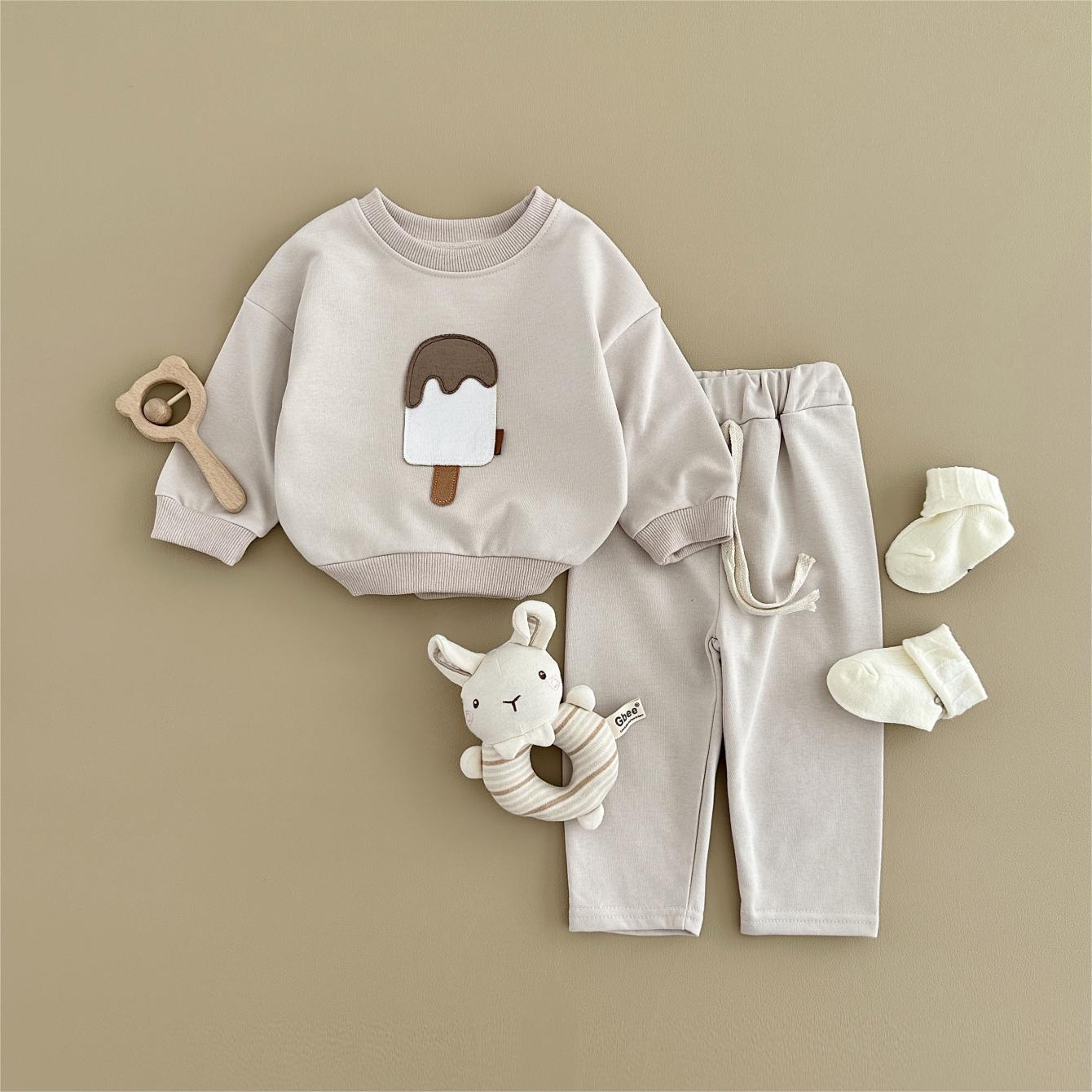 소년과 소녀를위한 투피스 세트 아기 귀여운 아이스크림 새로운 긴팔 바지 아기 세트 캐주얼 스포츠웨어 가을과 겨울스토어 가기