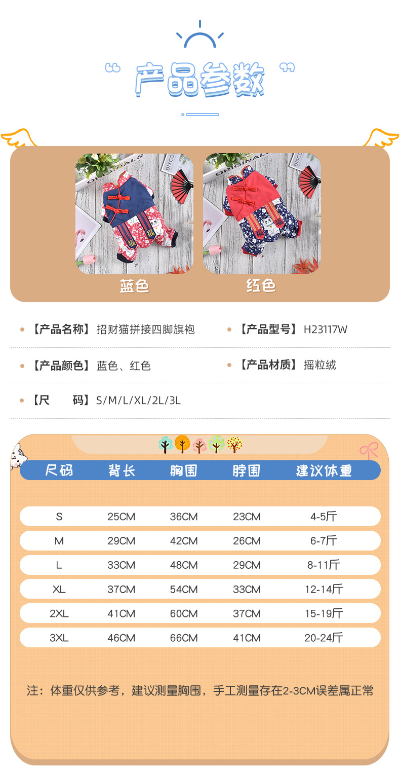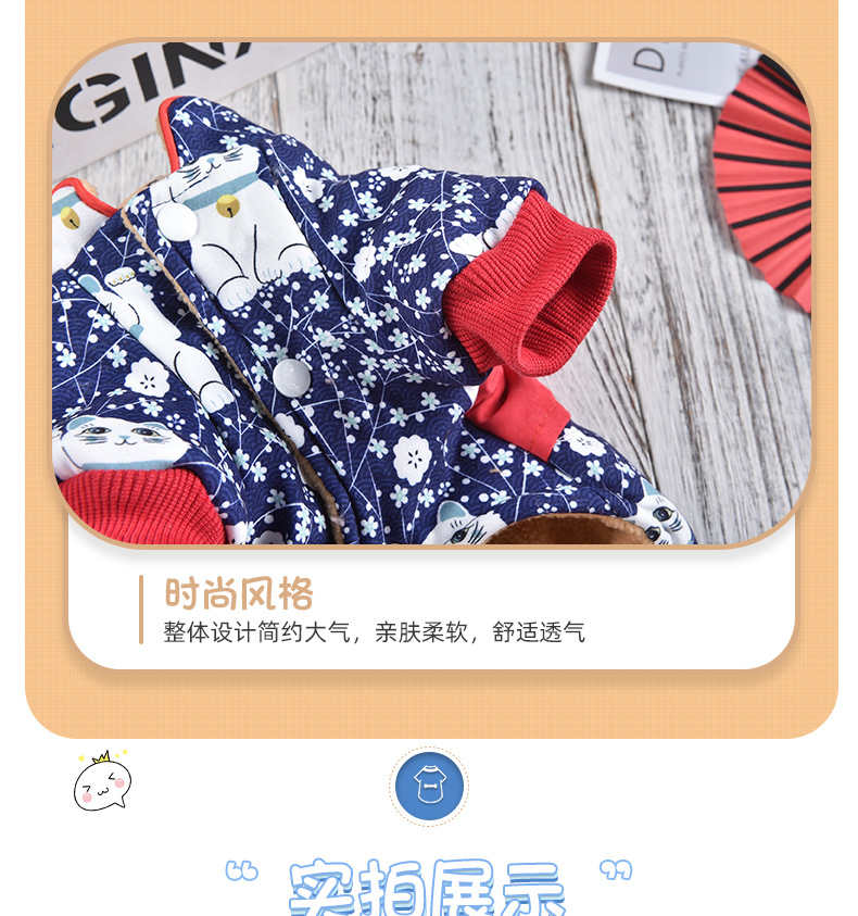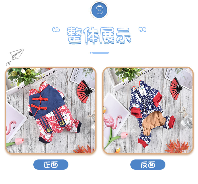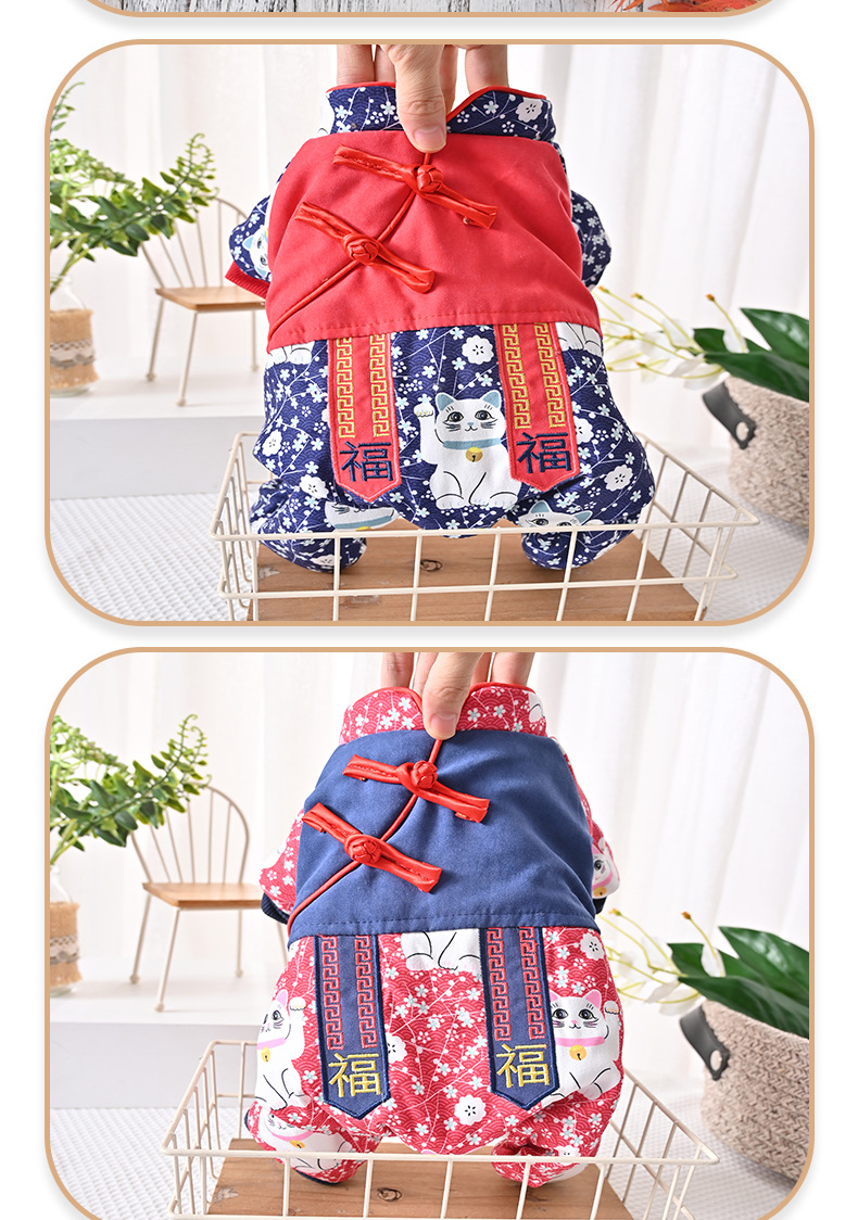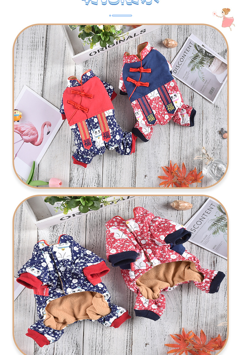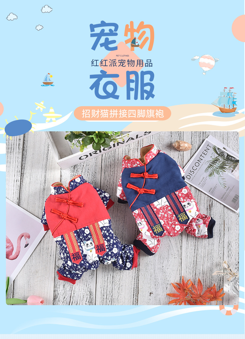 2023 새로운 럭키 캣 스티칭 4 족 치파오 애완 동물 옷 두꺼운 테디 코지 중소 개스토어 가기