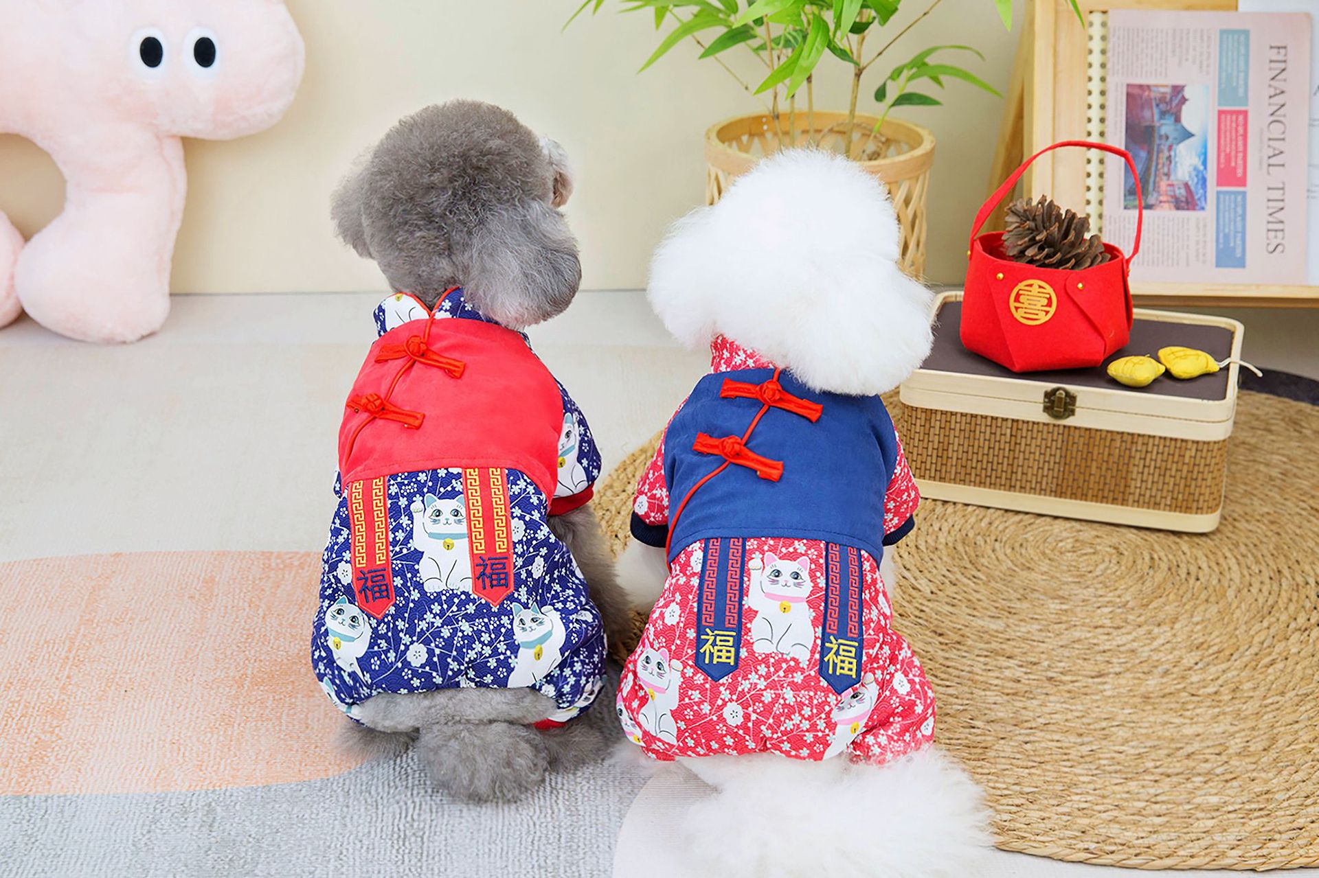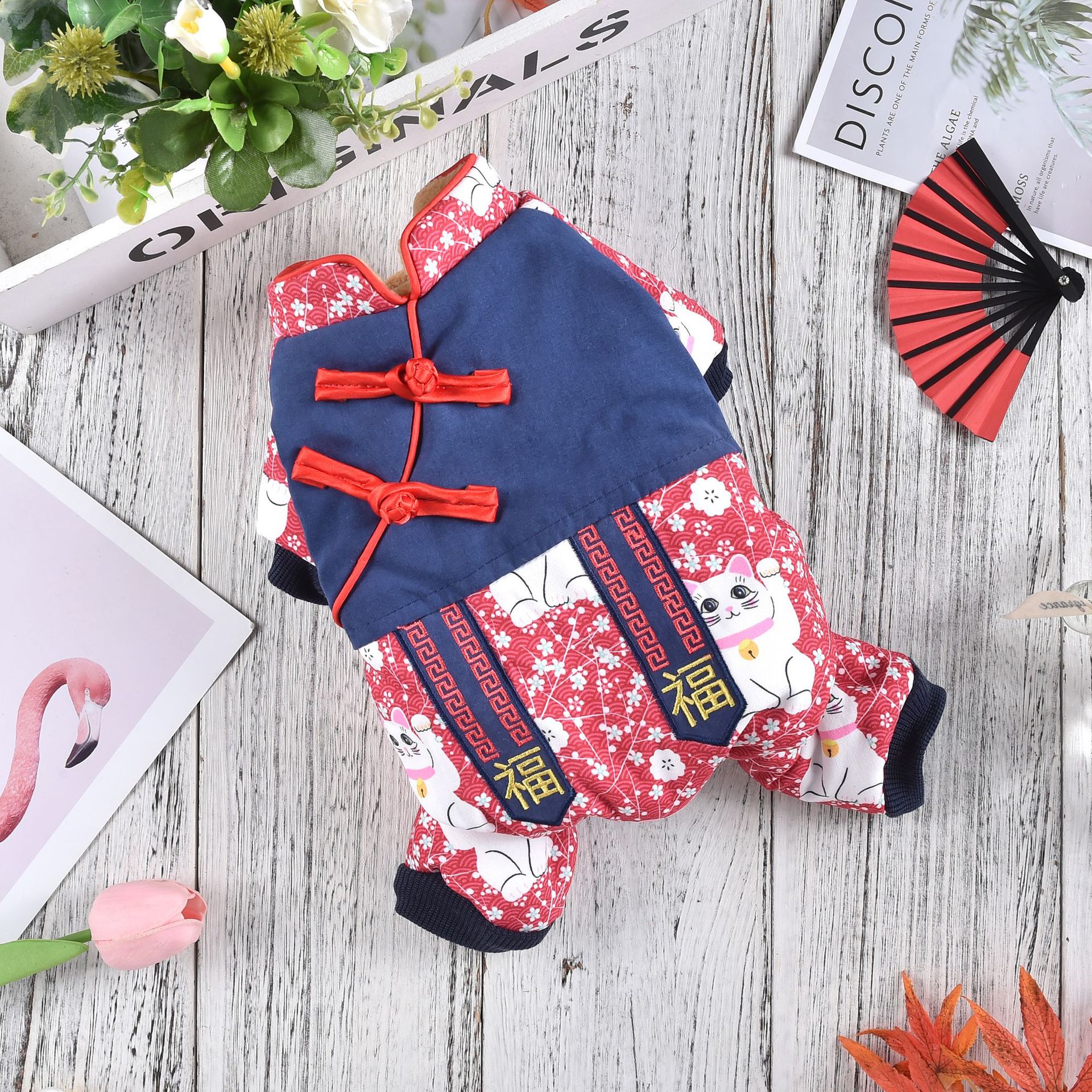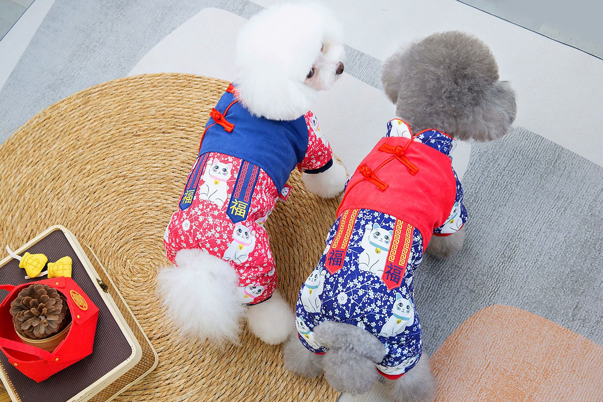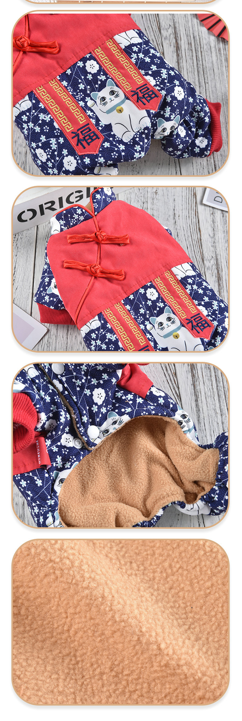 2023 새로운 럭키 캣 스티칭 4 족 치파오 애완 동물 옷 두꺼운 테디 코지 중소 개스토어 가기