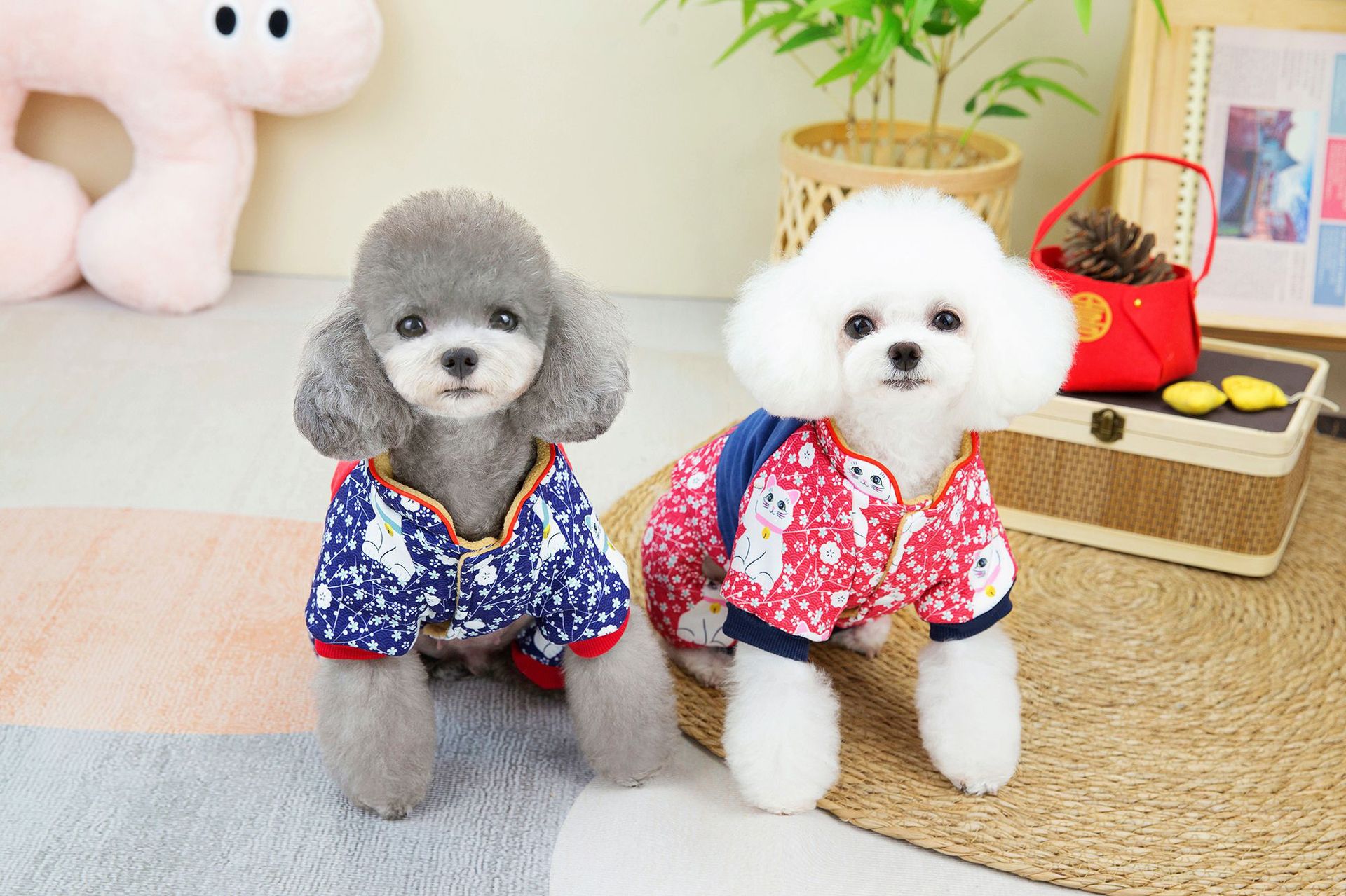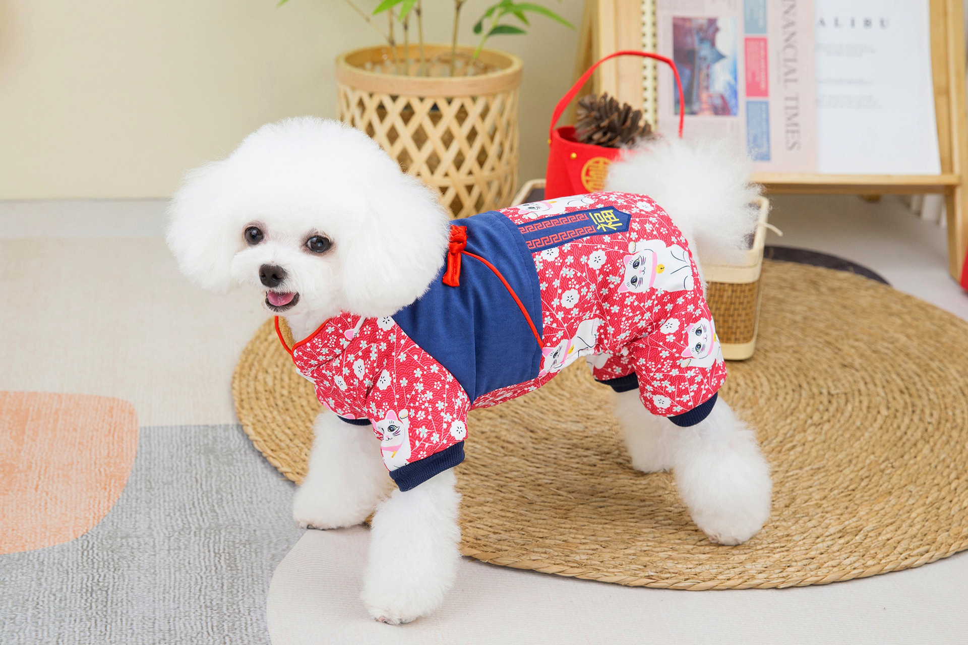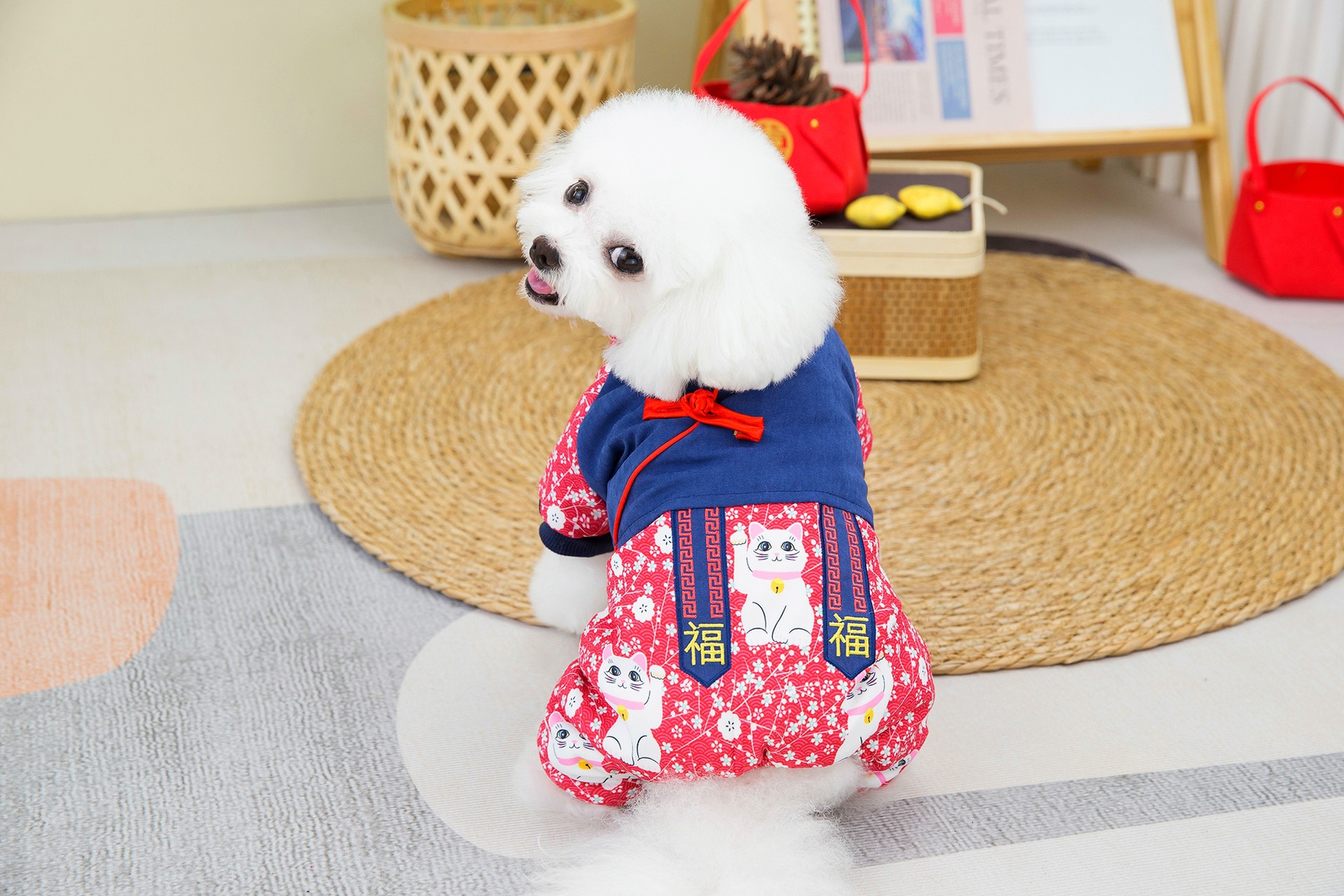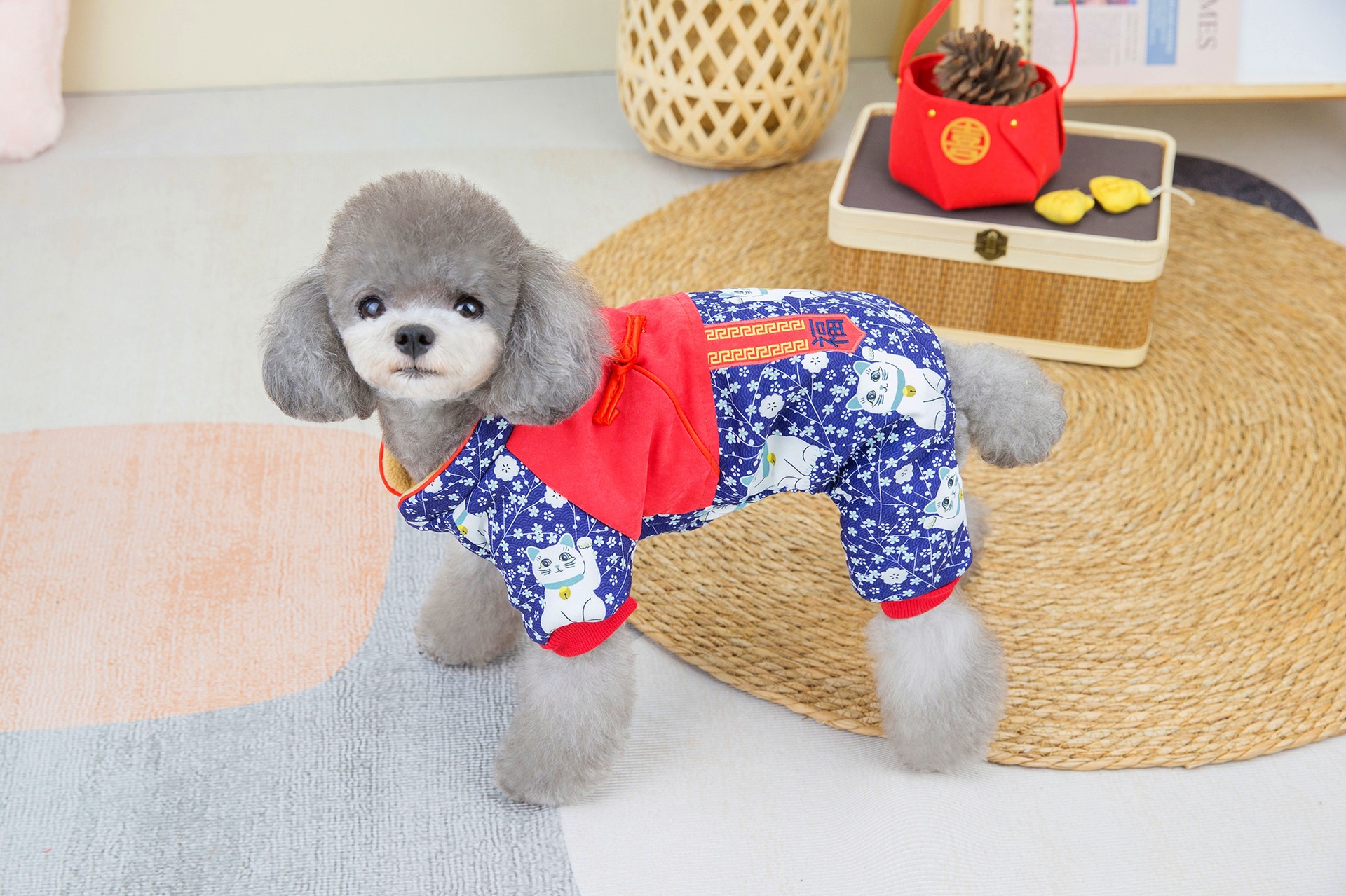 2023 새로운 럭키 캣 스티칭 4 족 치파오 애완 동물 옷 두꺼운 테디 코지 중소 개스토어 가기