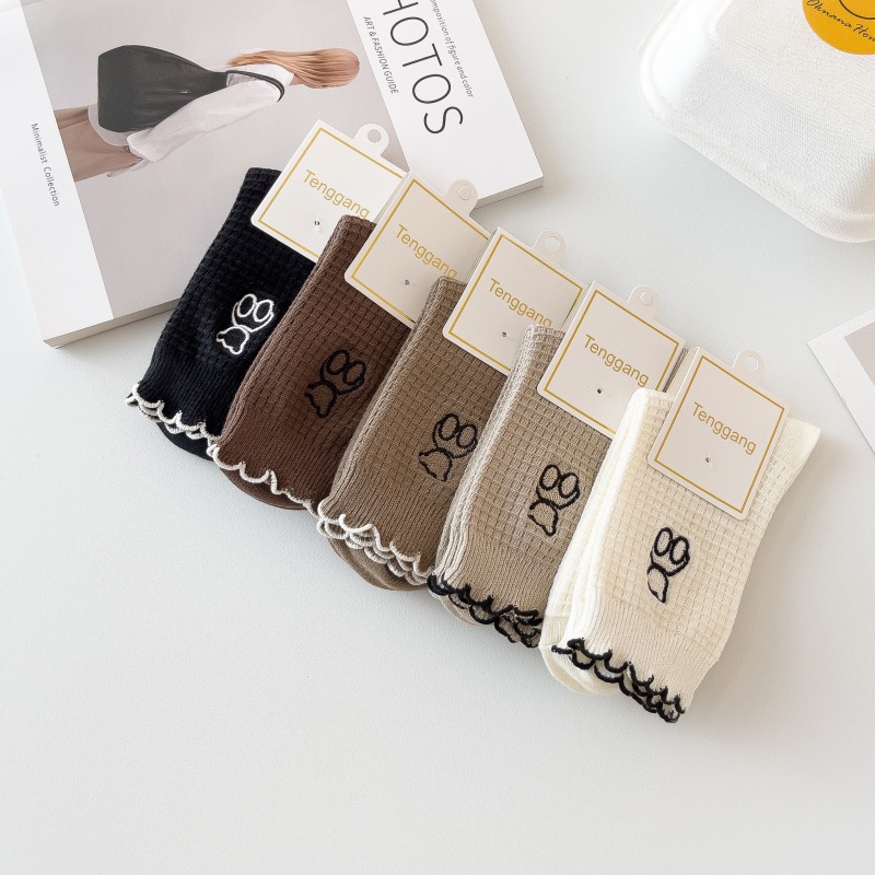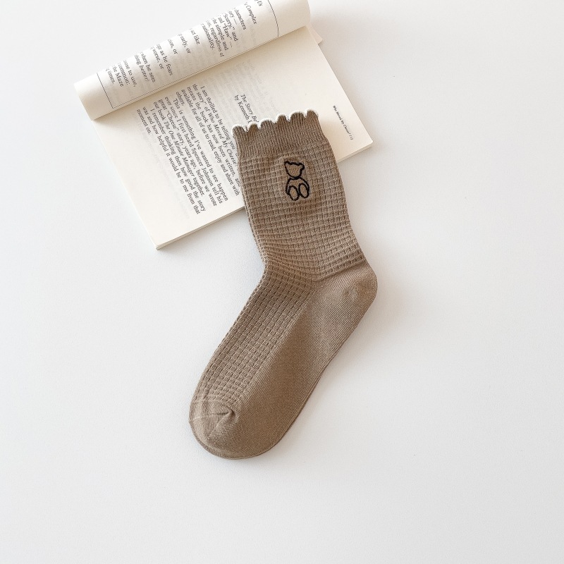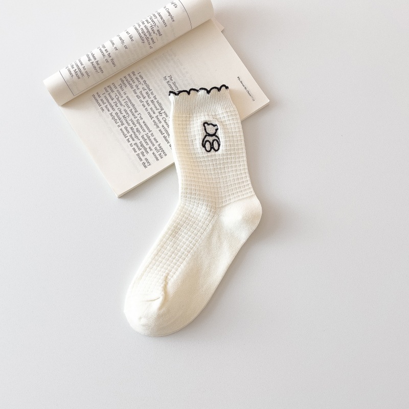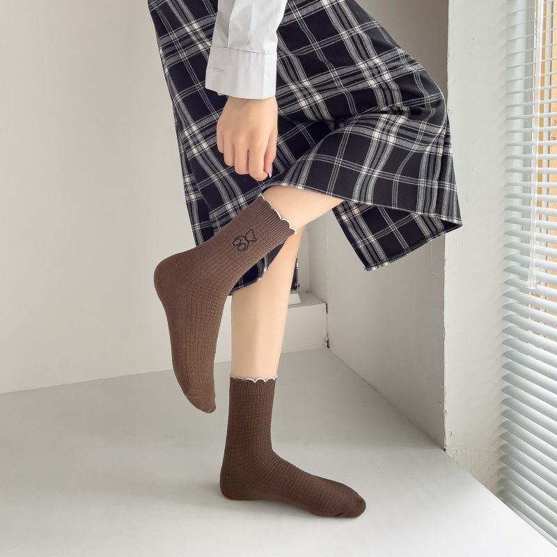 2023 가을과 겨울 얇은 양말 여성 자수 팬더 레이스 중간 길이 양말 더블 바늘 면 양말 와플 캐주얼 양말스토어 가기