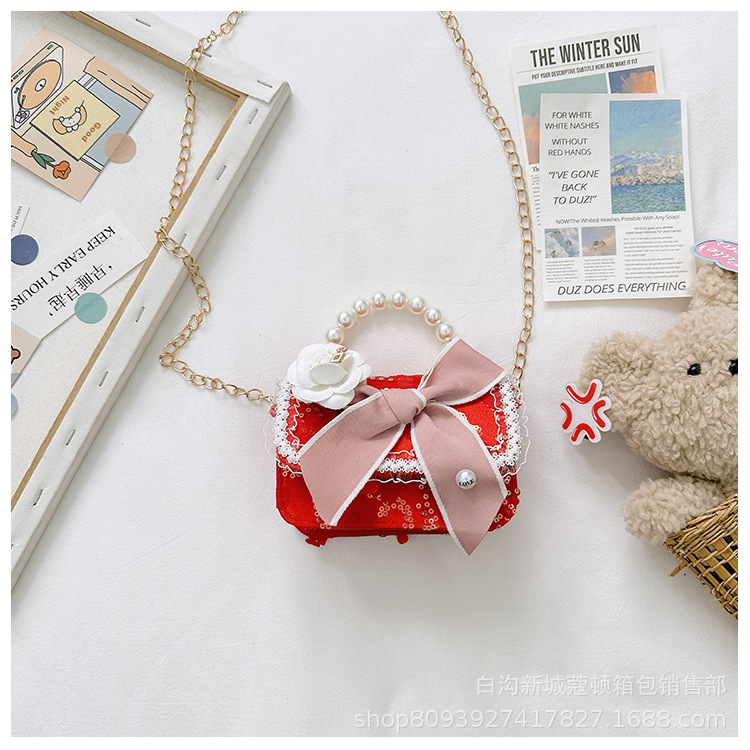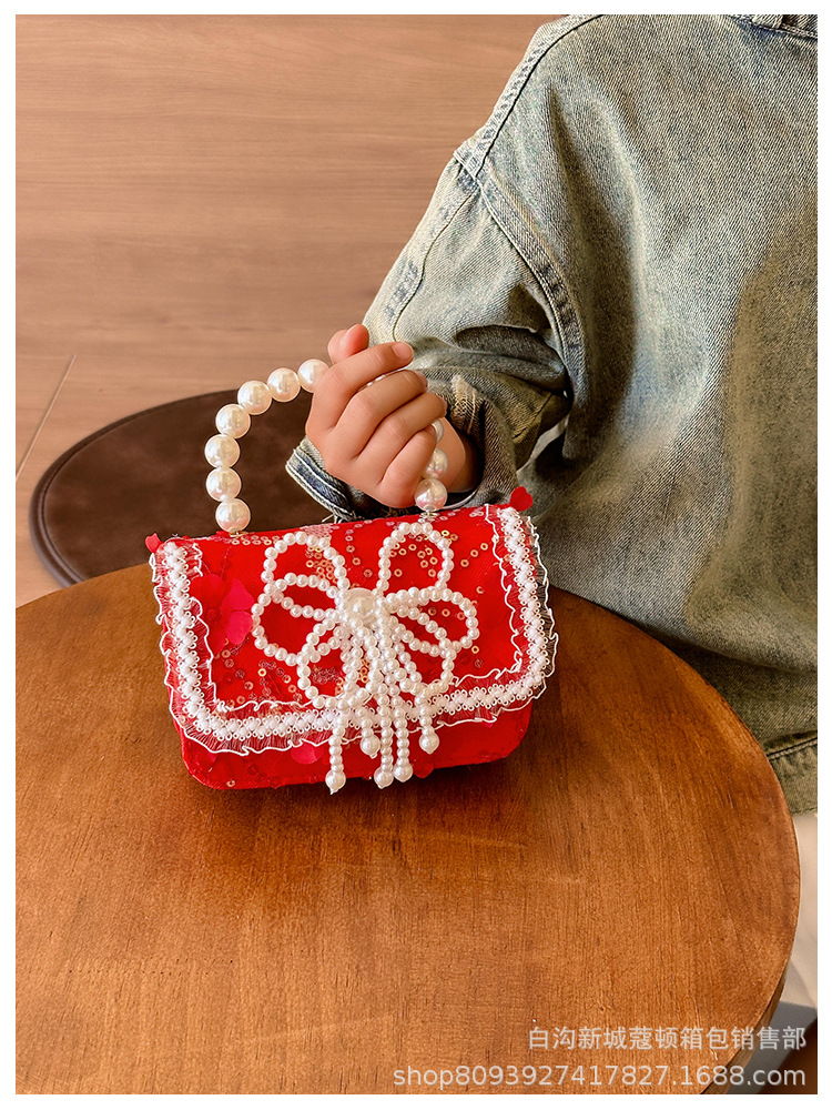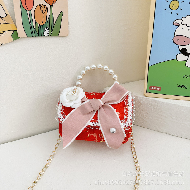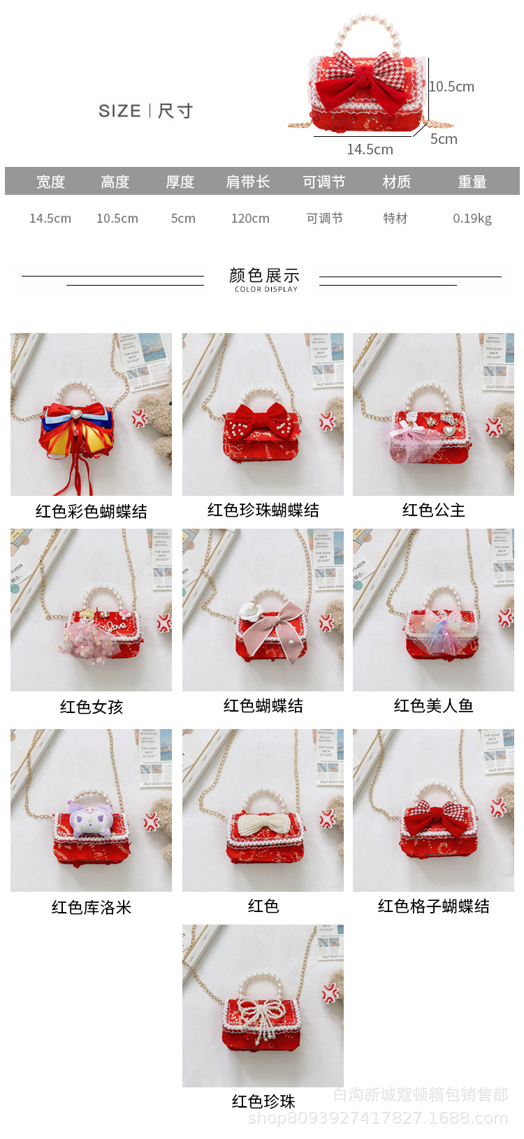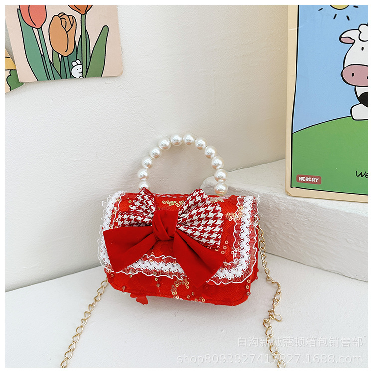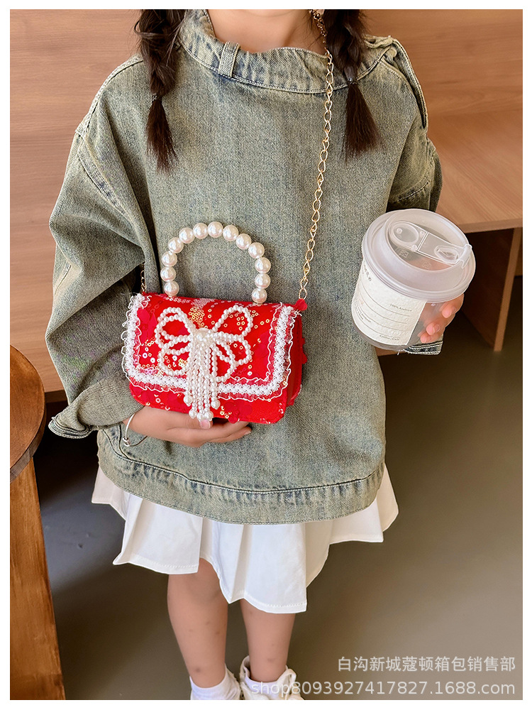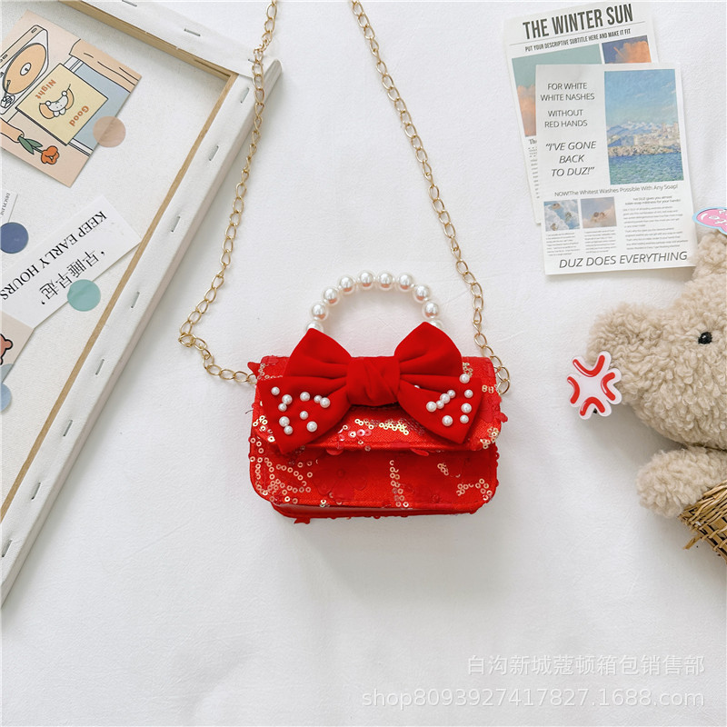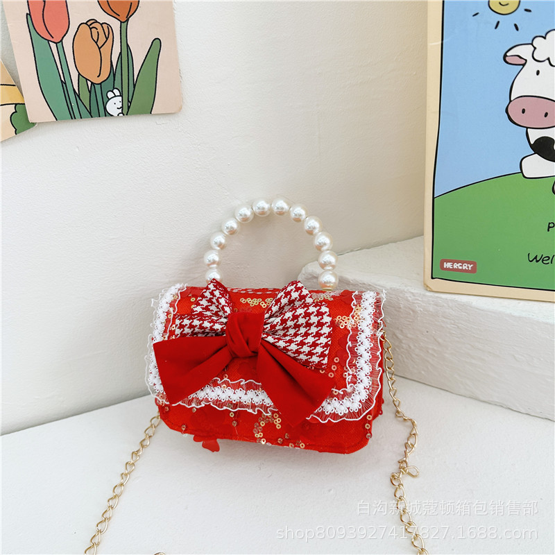 새해 빨간 샤넬 스타일 어린이 진주 핸드백 아기 귀여운 활 체인 가방 소녀 동전 지갑