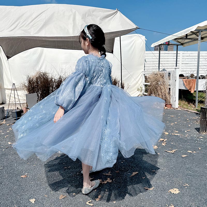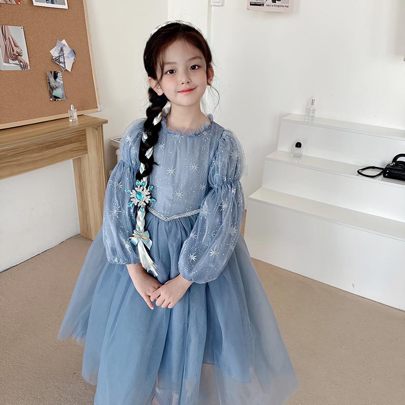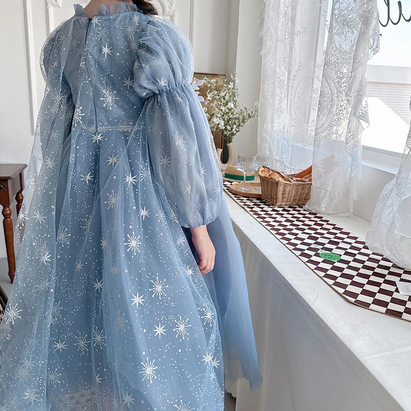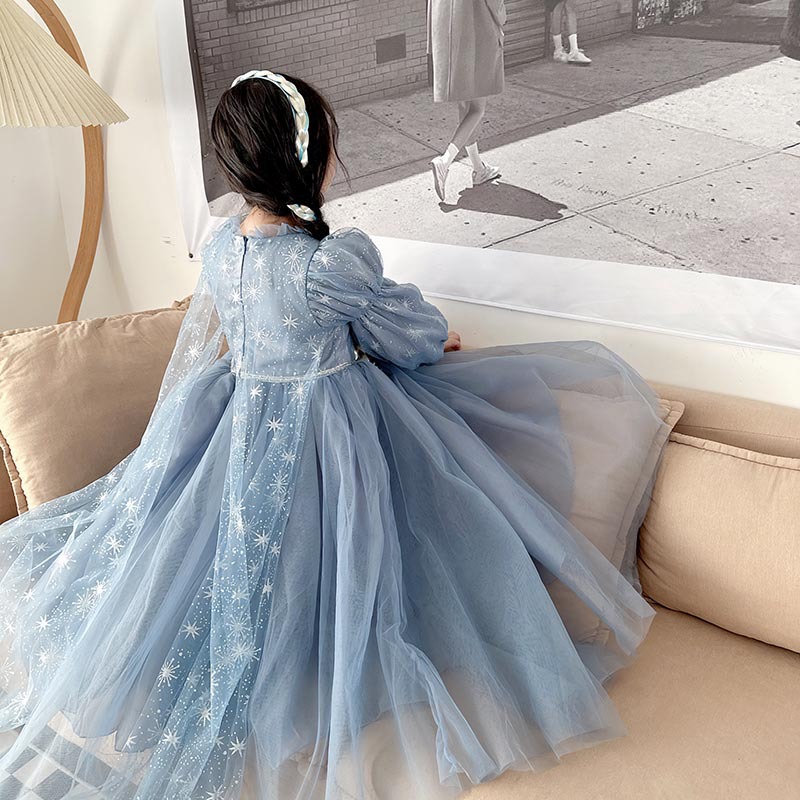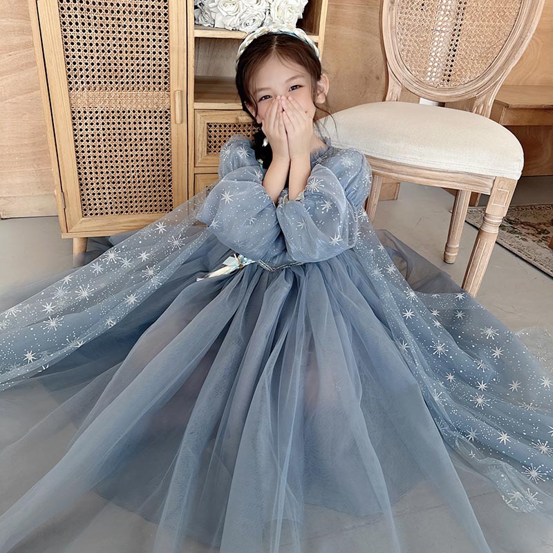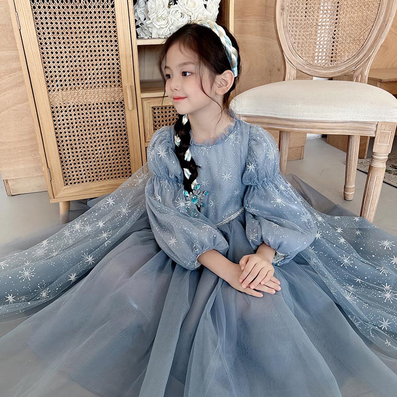 냉동 공주 원피스 가을과 겨울 소녀 아이샤 목도리 원피스 어린이 버블 슬리브 메쉬 원피스 원피스 생일스토어 가기