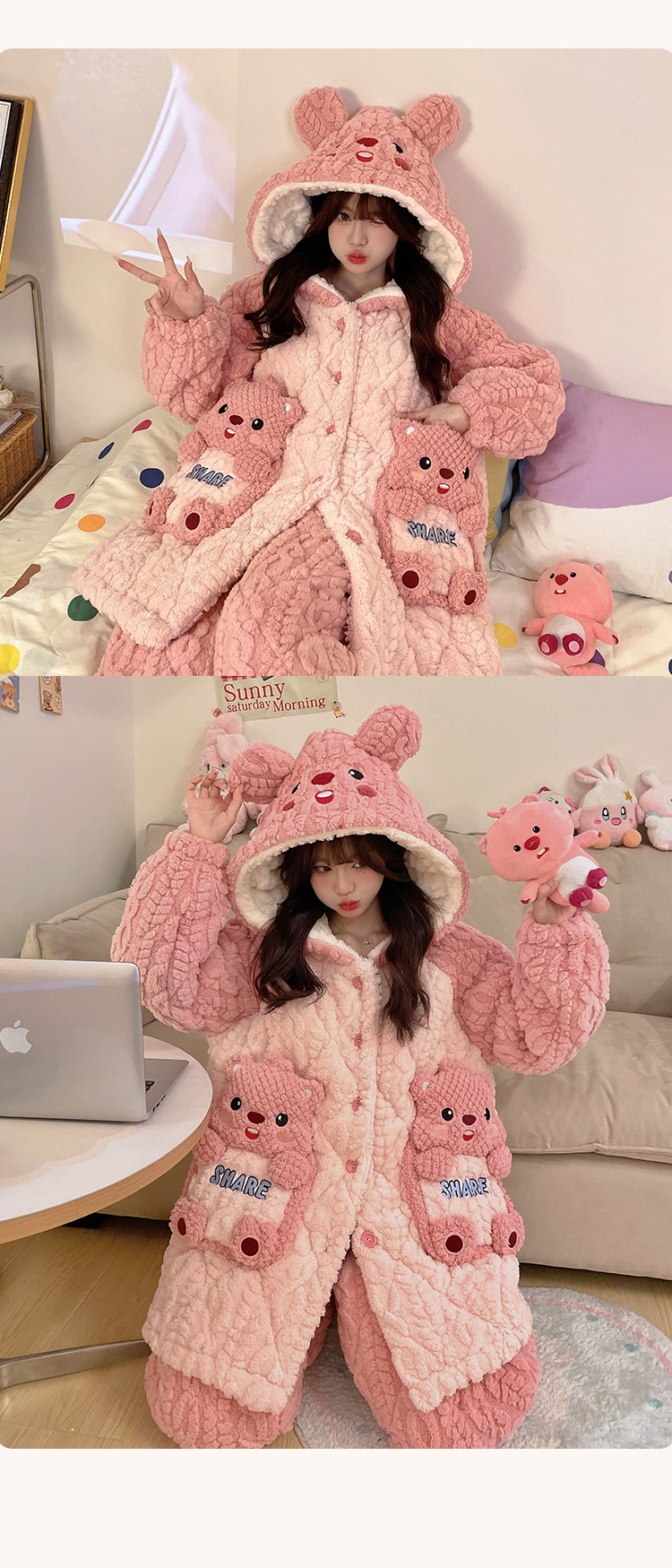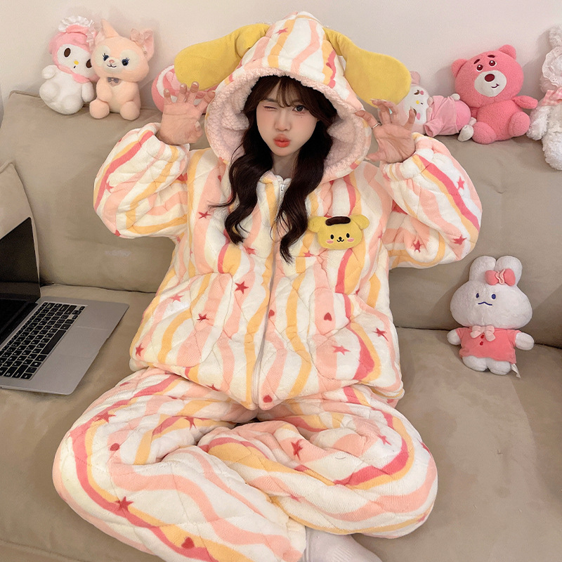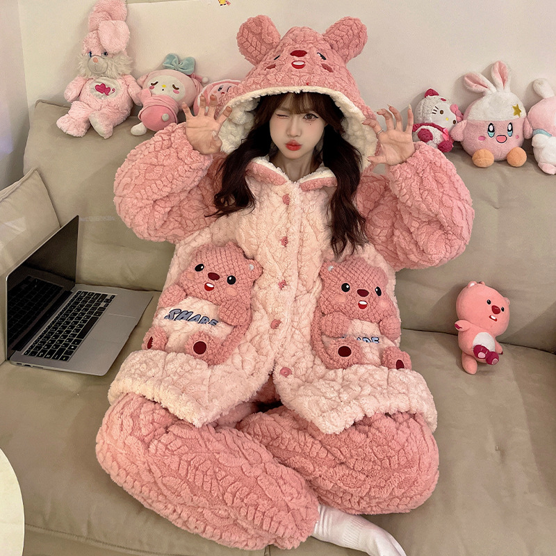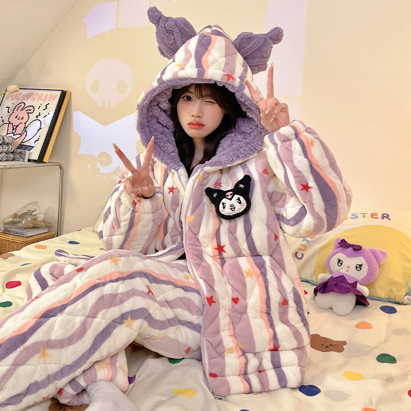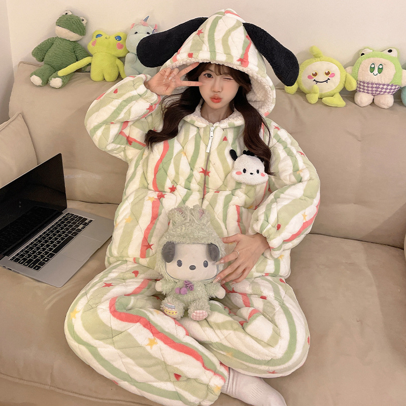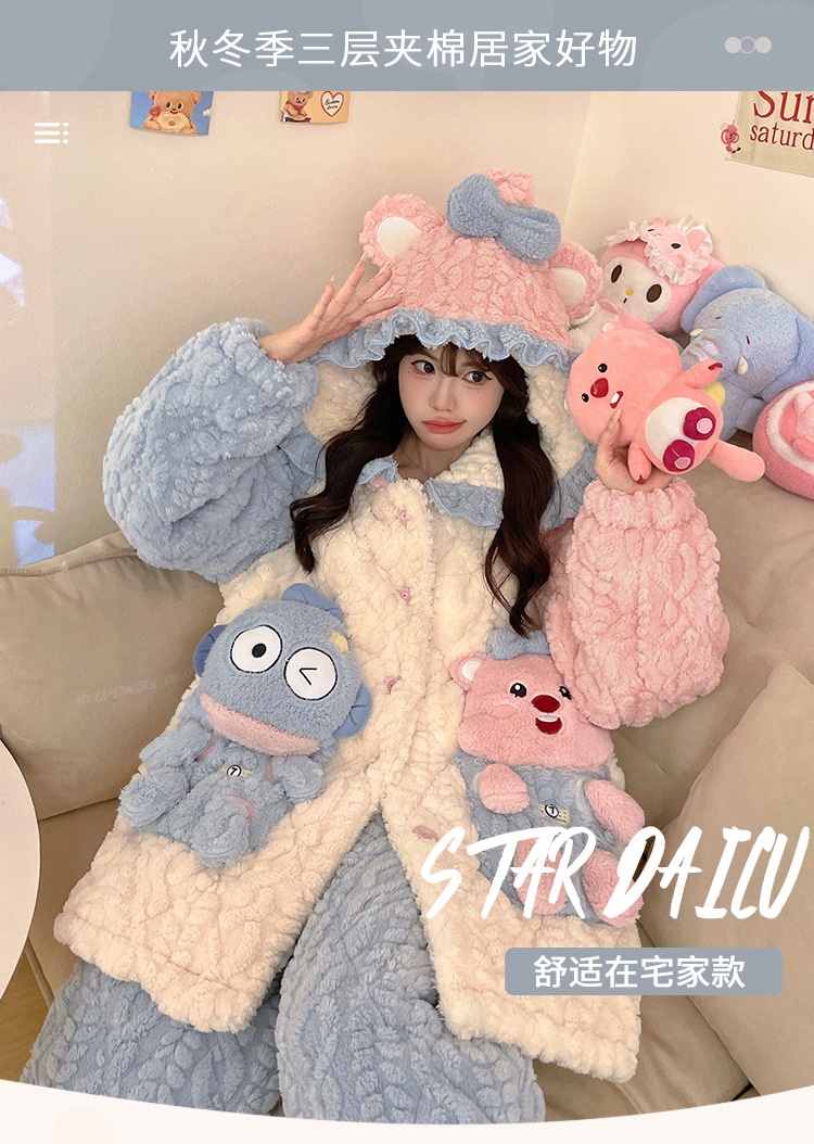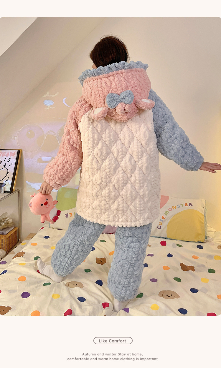 산호 양털 퀼트 3 층 두꺼운 잠옷 여자의 겨울 지퍼 후드 새로운 스타일 가정 옷 플란넬 기모 따뜻한