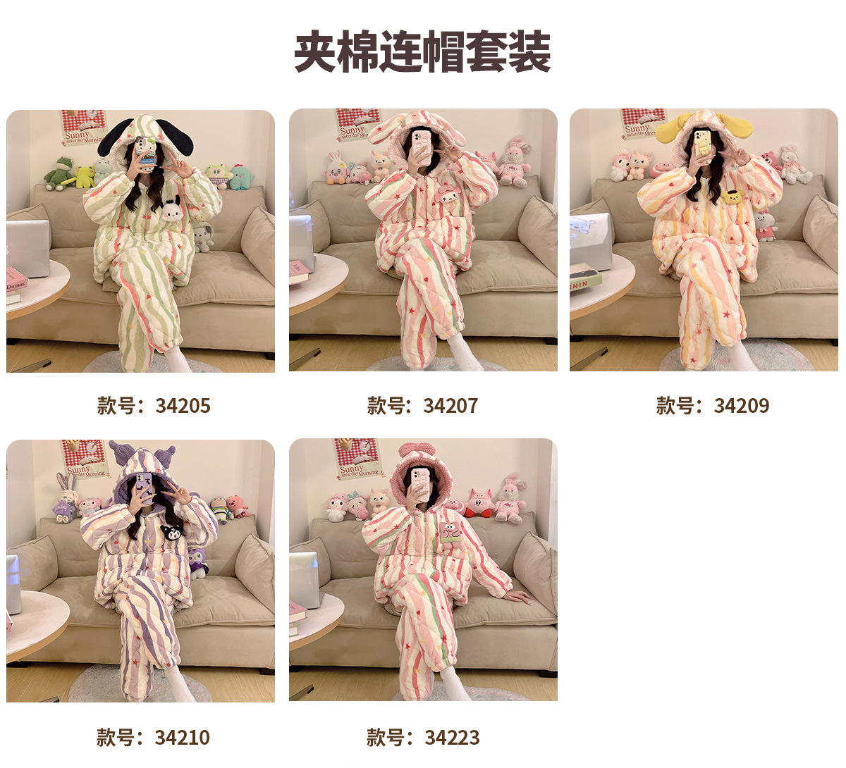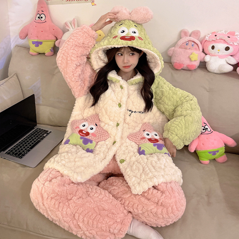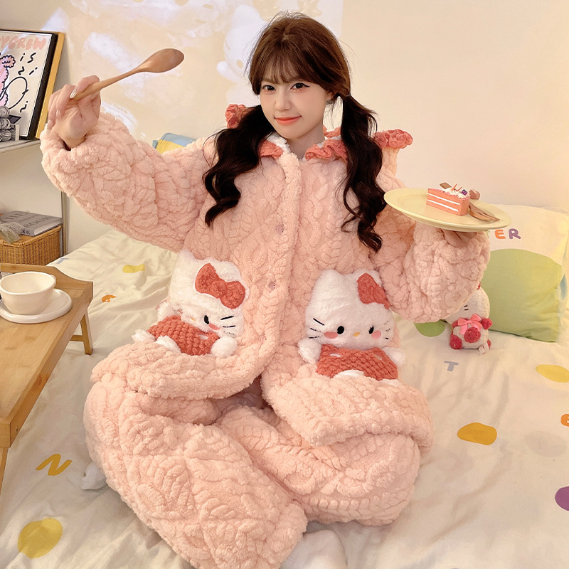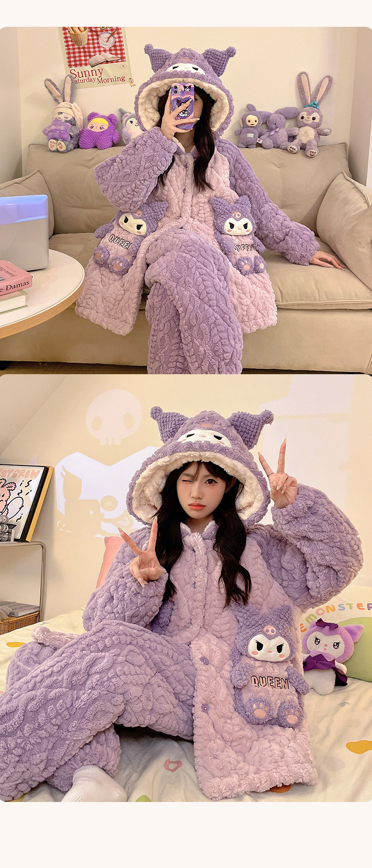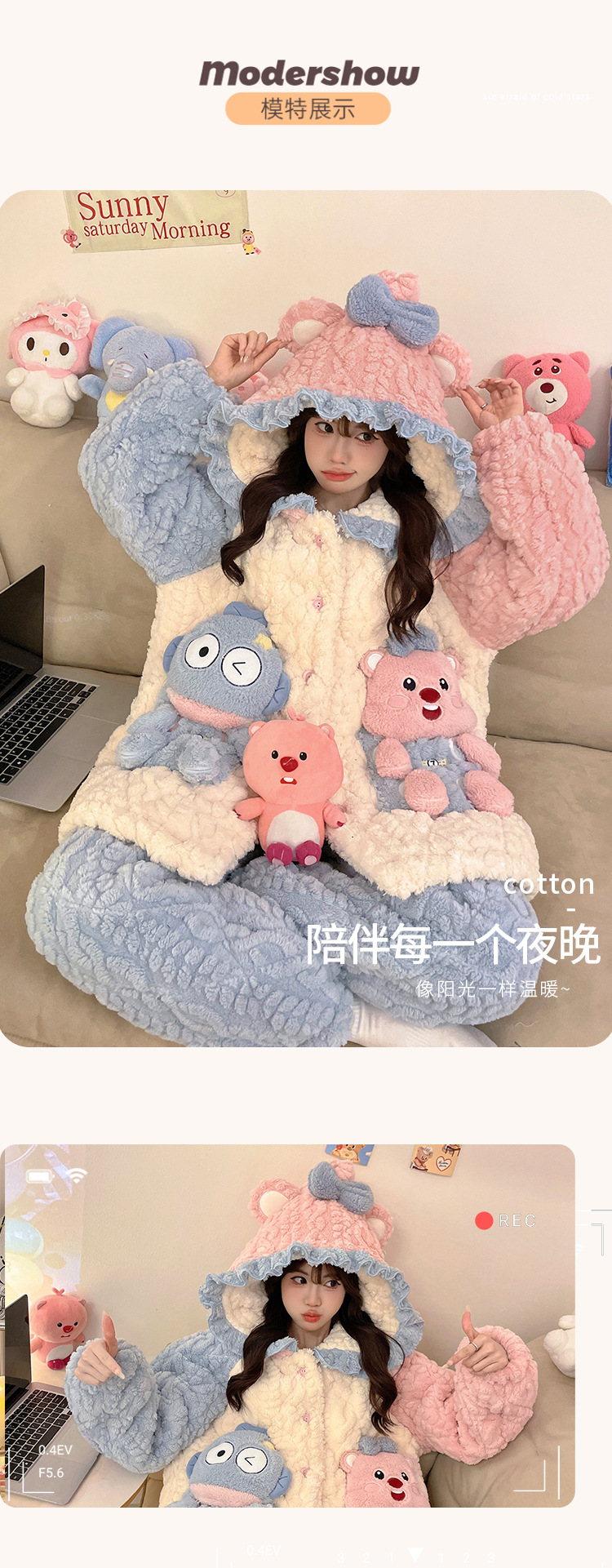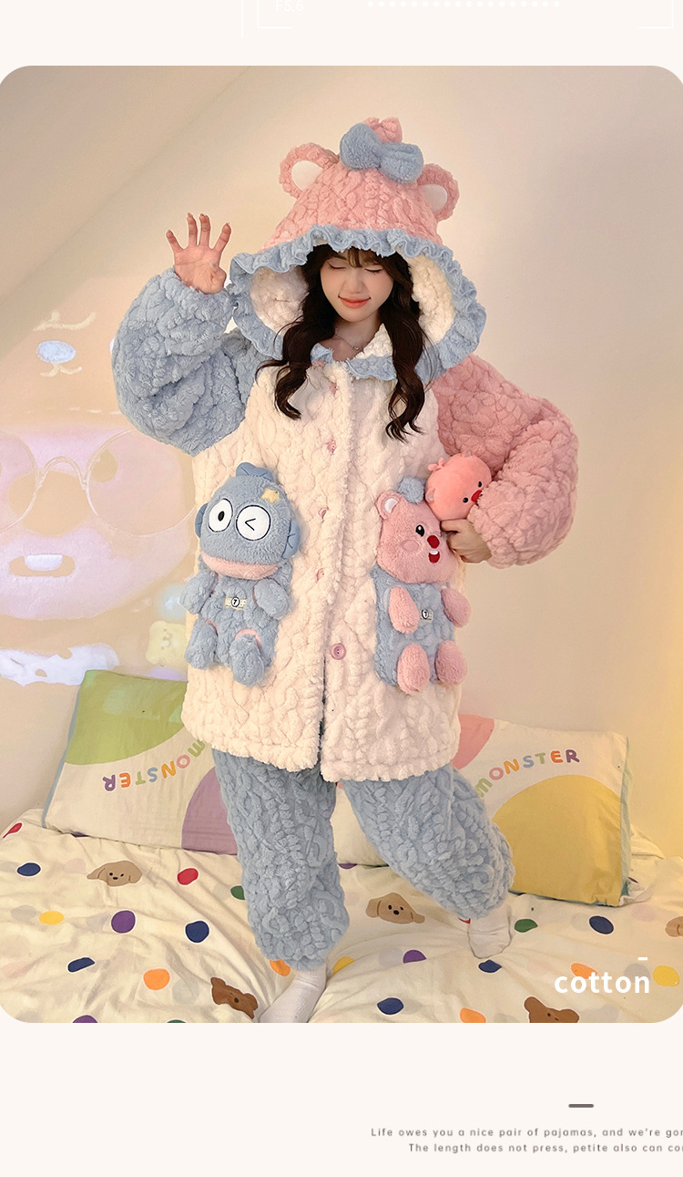 산호 양털 퀼트 3 층 두꺼운 잠옷 여자의 겨울 지퍼 후드 새로운 스타일 가정 옷 플란넬 기모 따뜻한