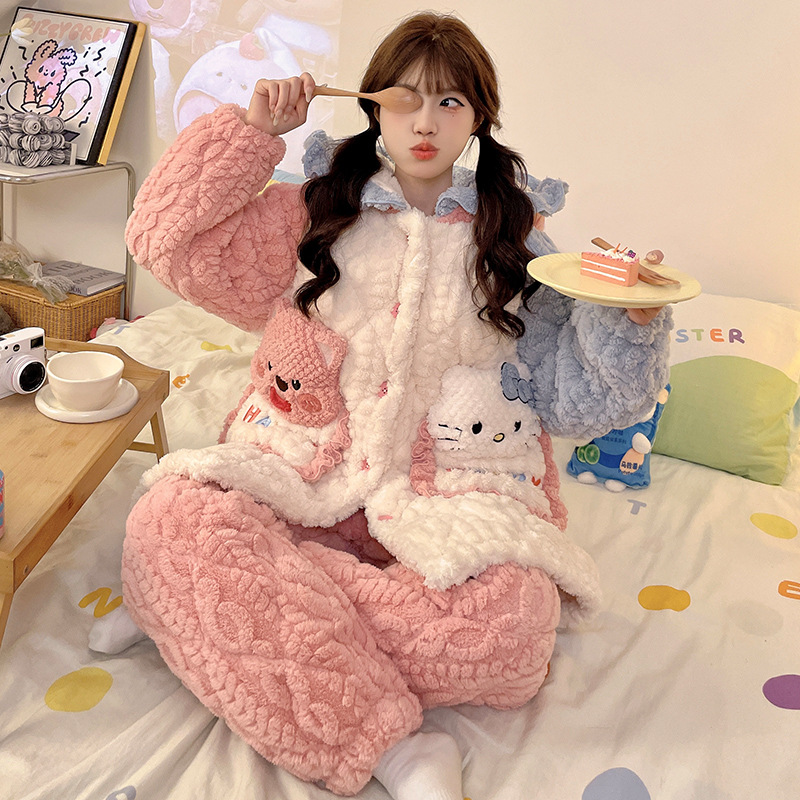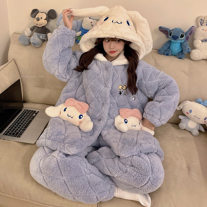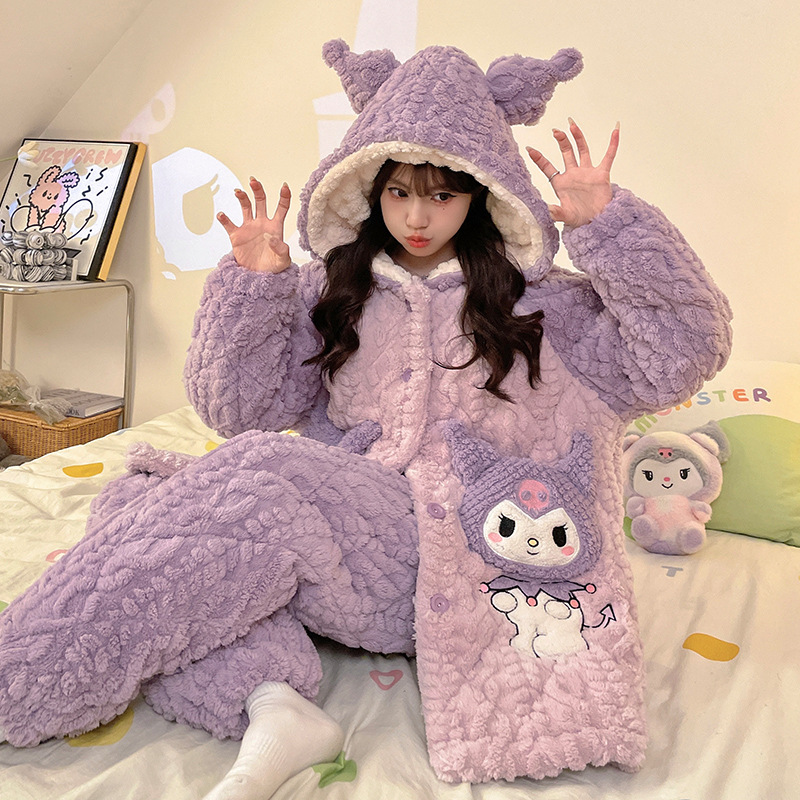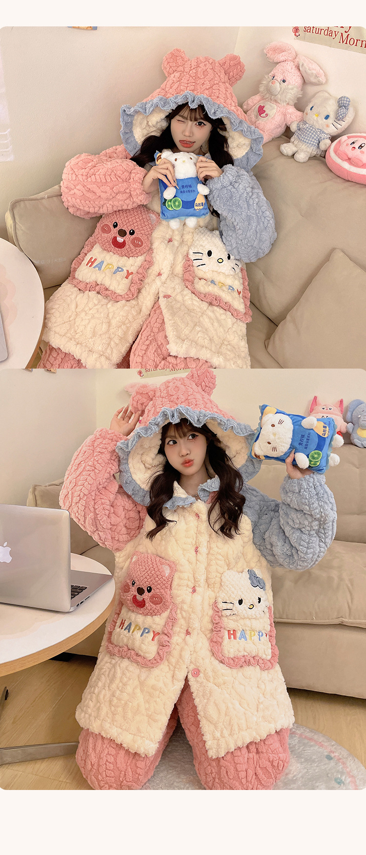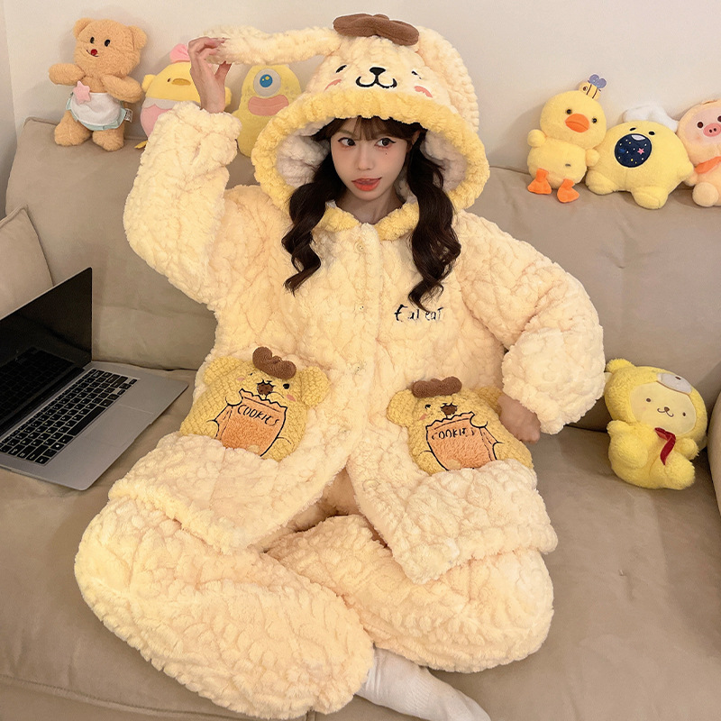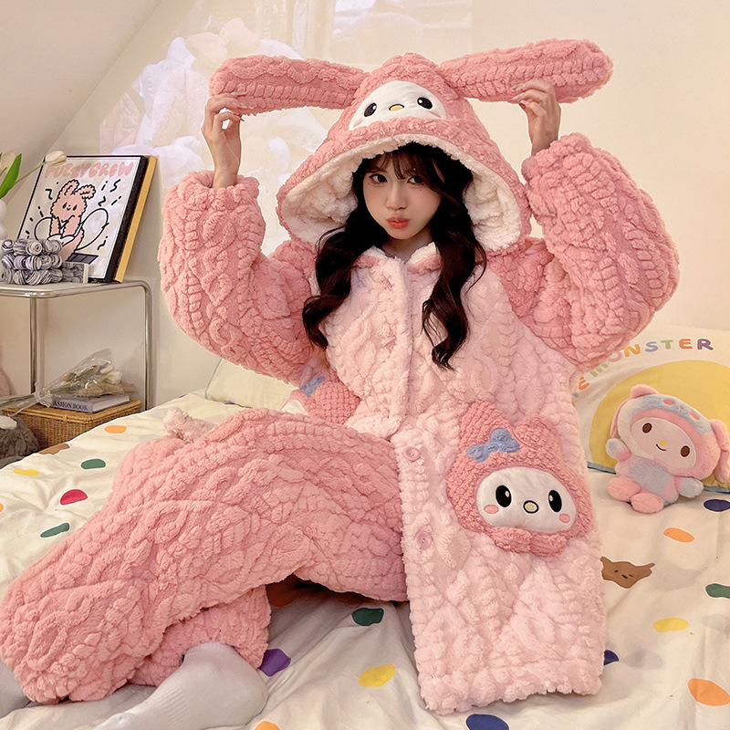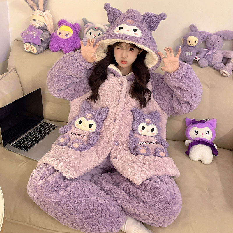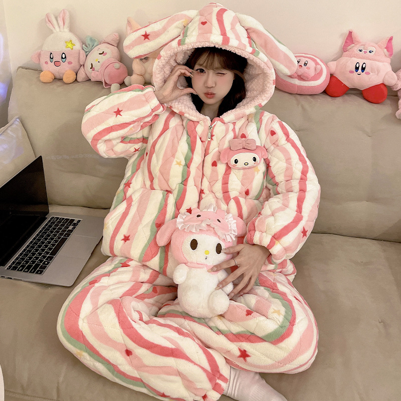 산호 양털 퀼트 3 층 두꺼운 잠옷 여자의 겨울 지퍼 후드 새로운 스타일 가정 옷 플란넬 기모 따뜻한